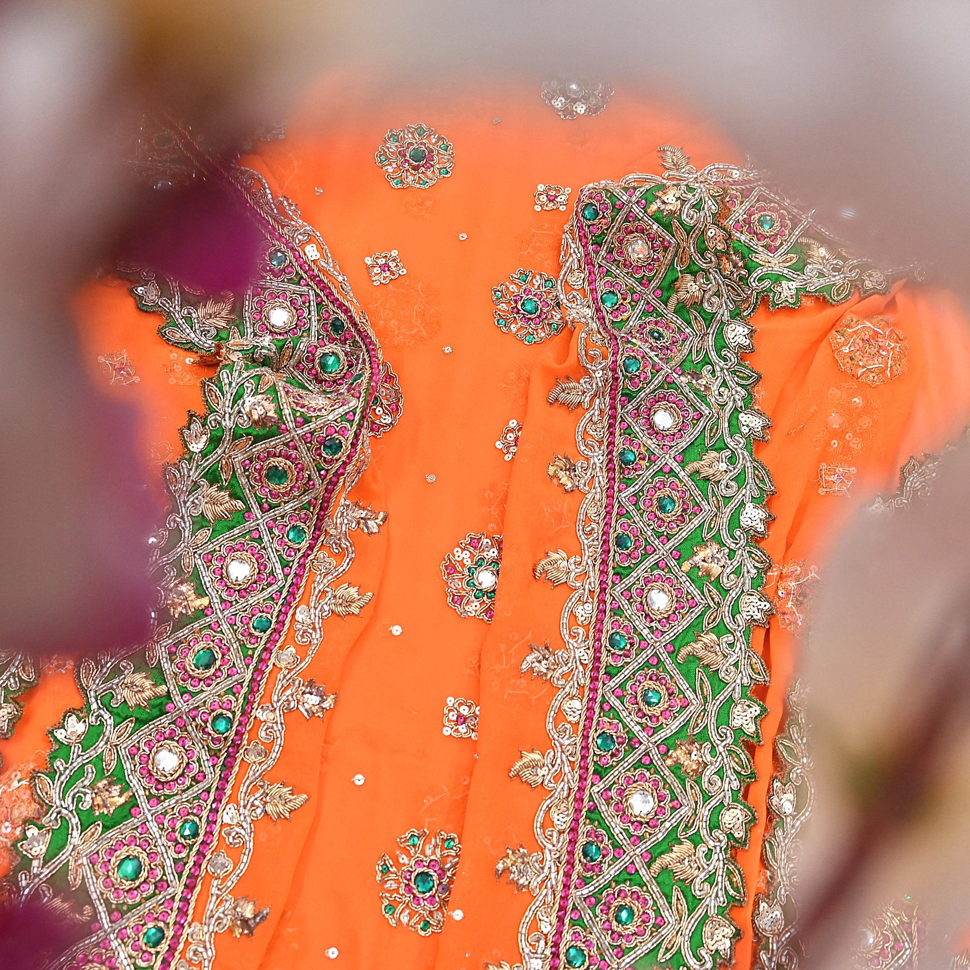 Indian Pre-owned Heavy orange Pure Georgette Silk Hand Embroidered Dupatta Designer By Manish Malhotra Bridal Wear Dabka Zardozi Veil Hijab