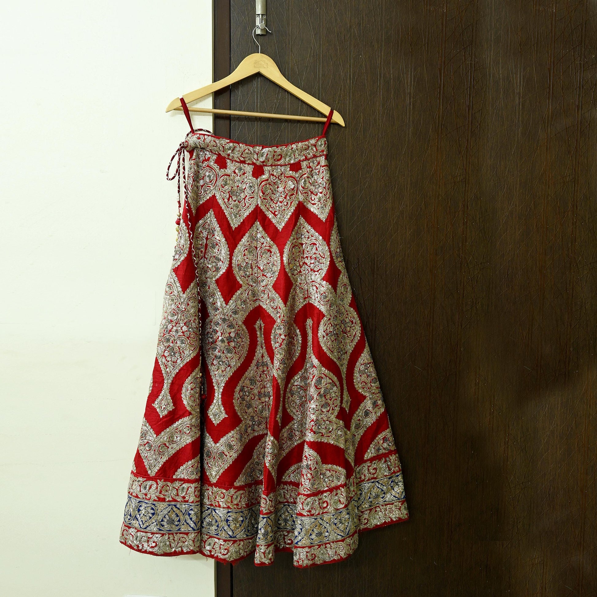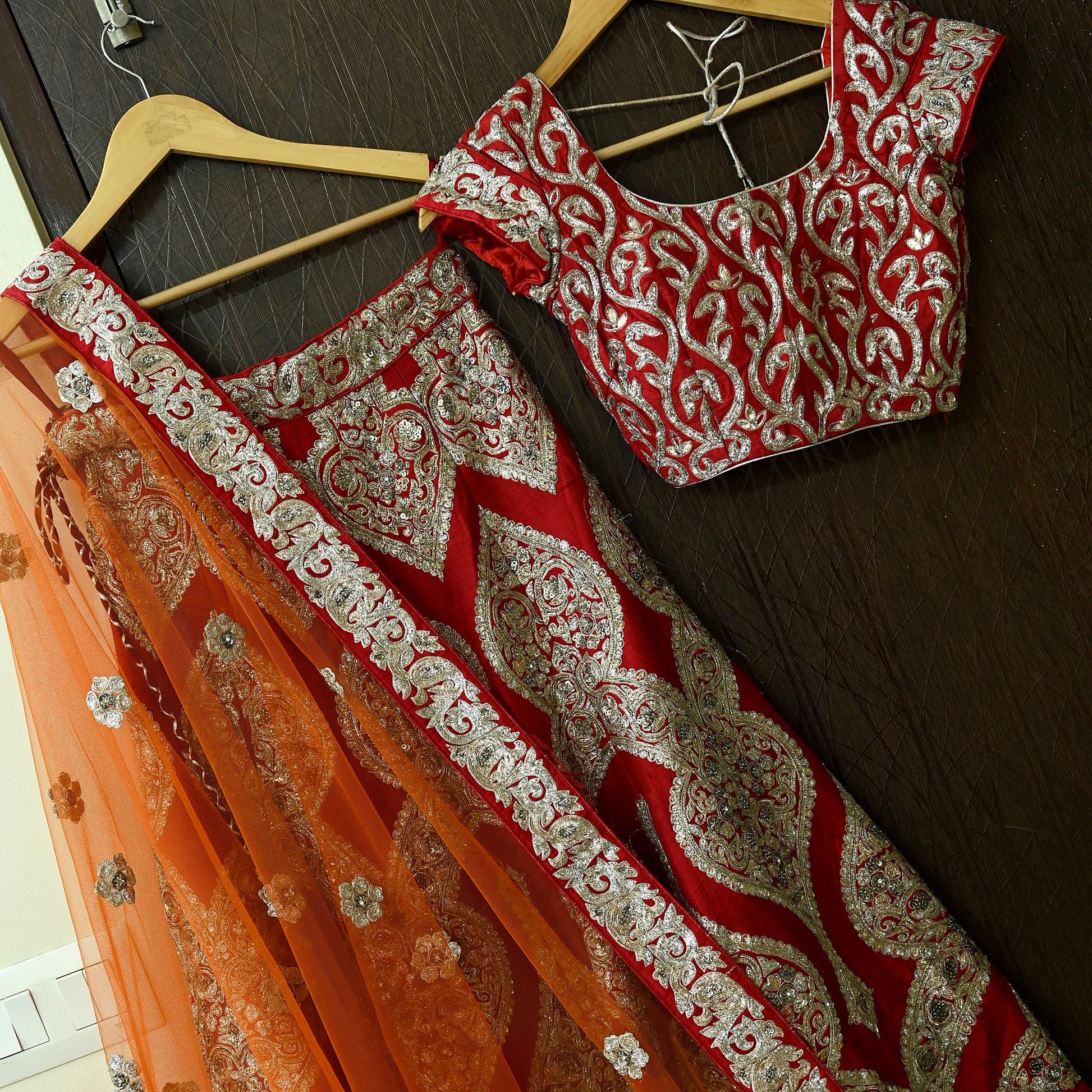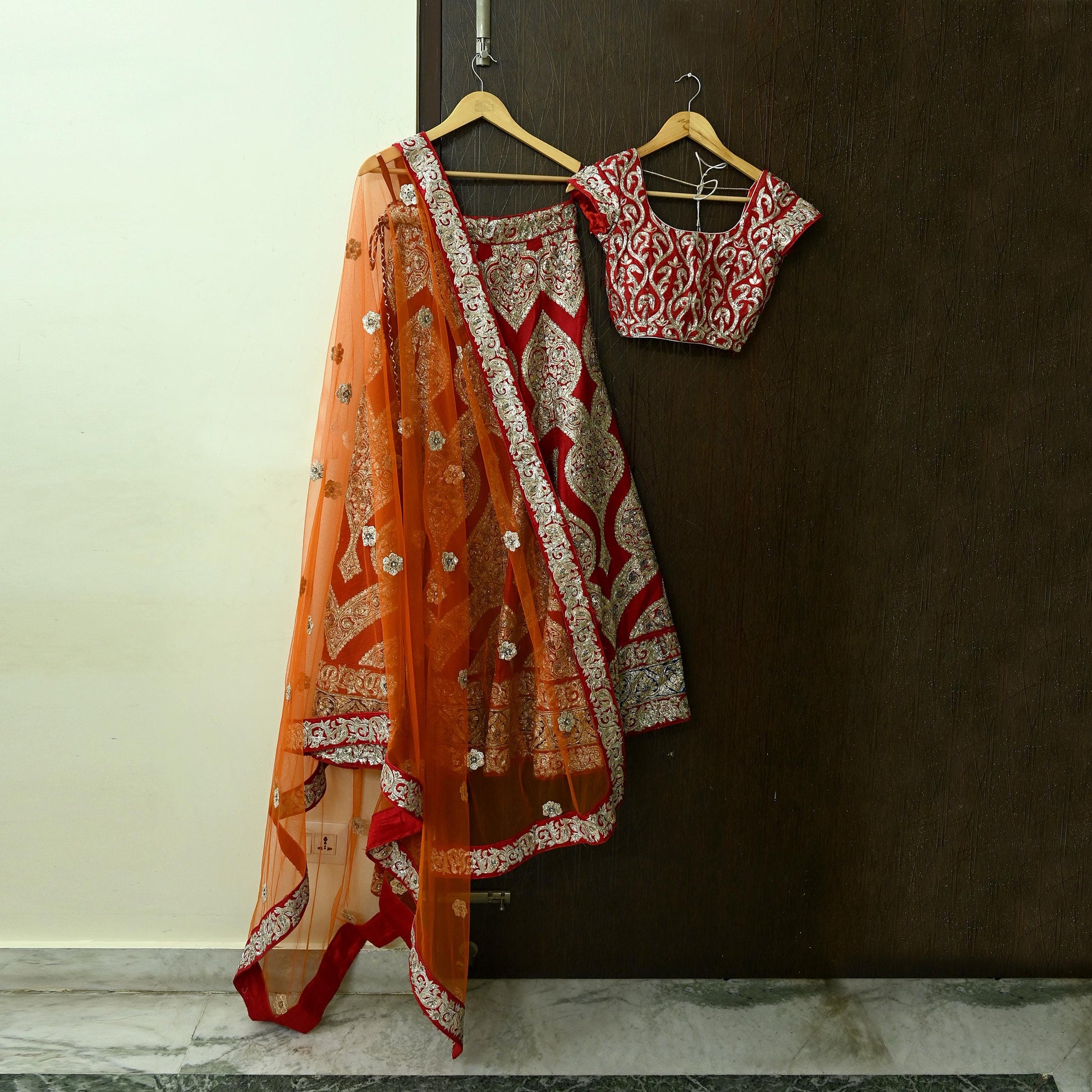 Indian Pre-owned Heavy Red & Orange Pure Chanderi Silk/Net Hand Embroidered Lehenga 3pcs Set By Designer Sabyasachi Bridal Wear With Blouse