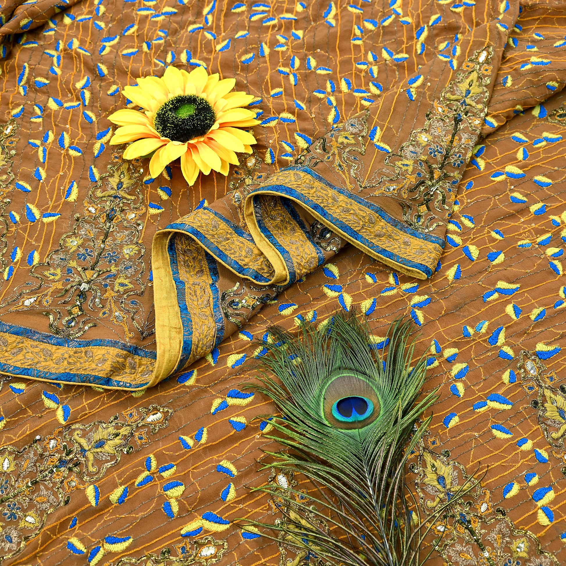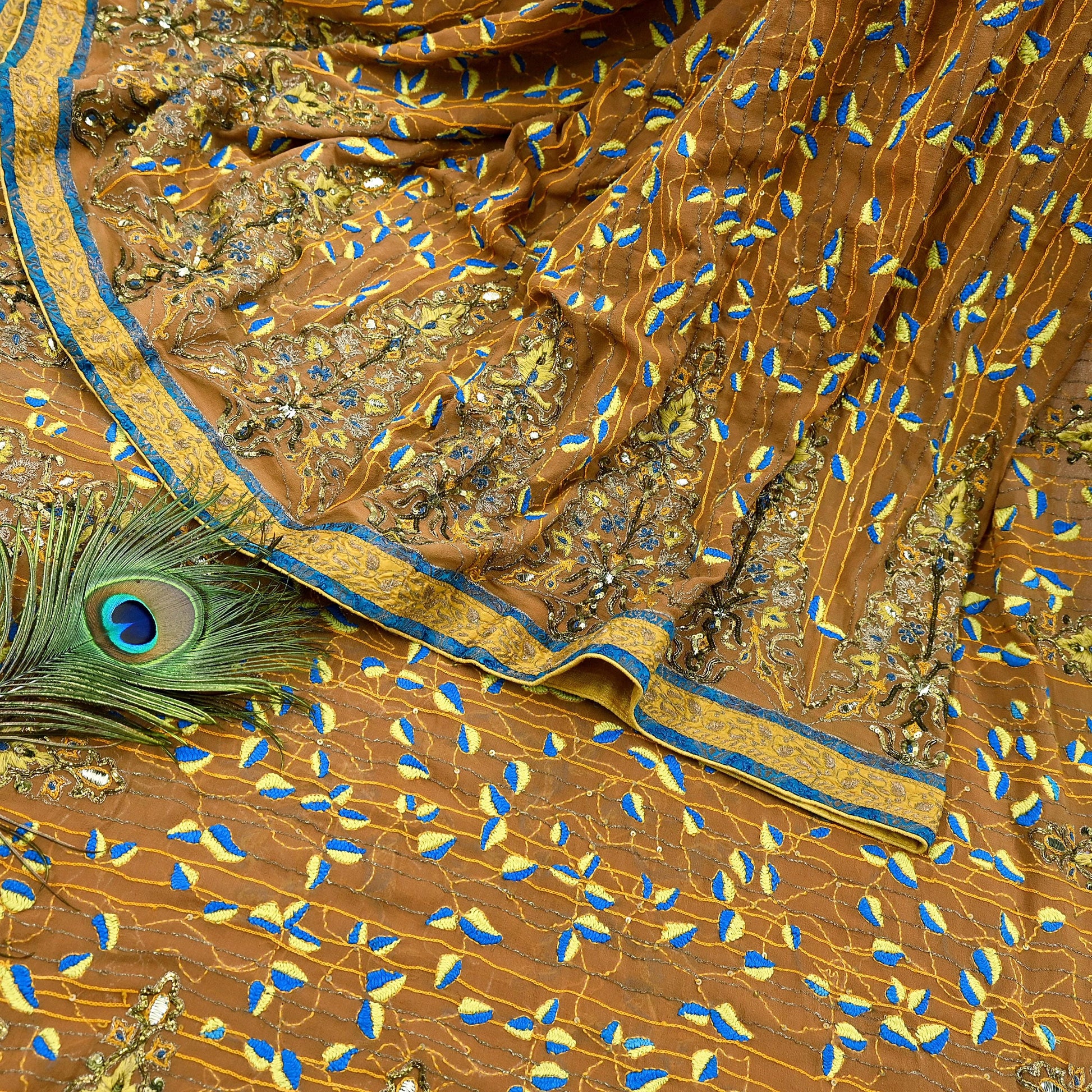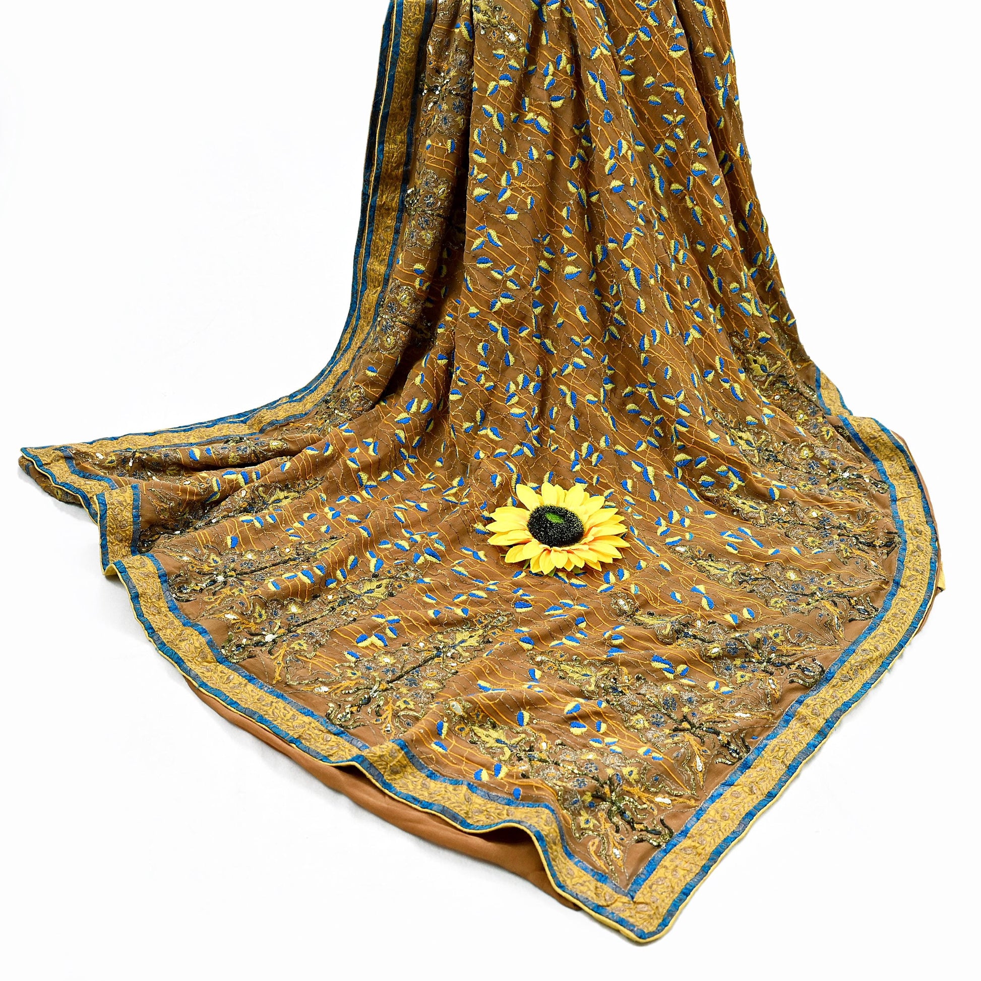 *Pallu & Border Features Floral Design Embellished With Golden Zardozi/ Dabka, Zari, Golden Metalic Sequins, Yellow, Saffron & Blue Kantha, Mukesh Work.