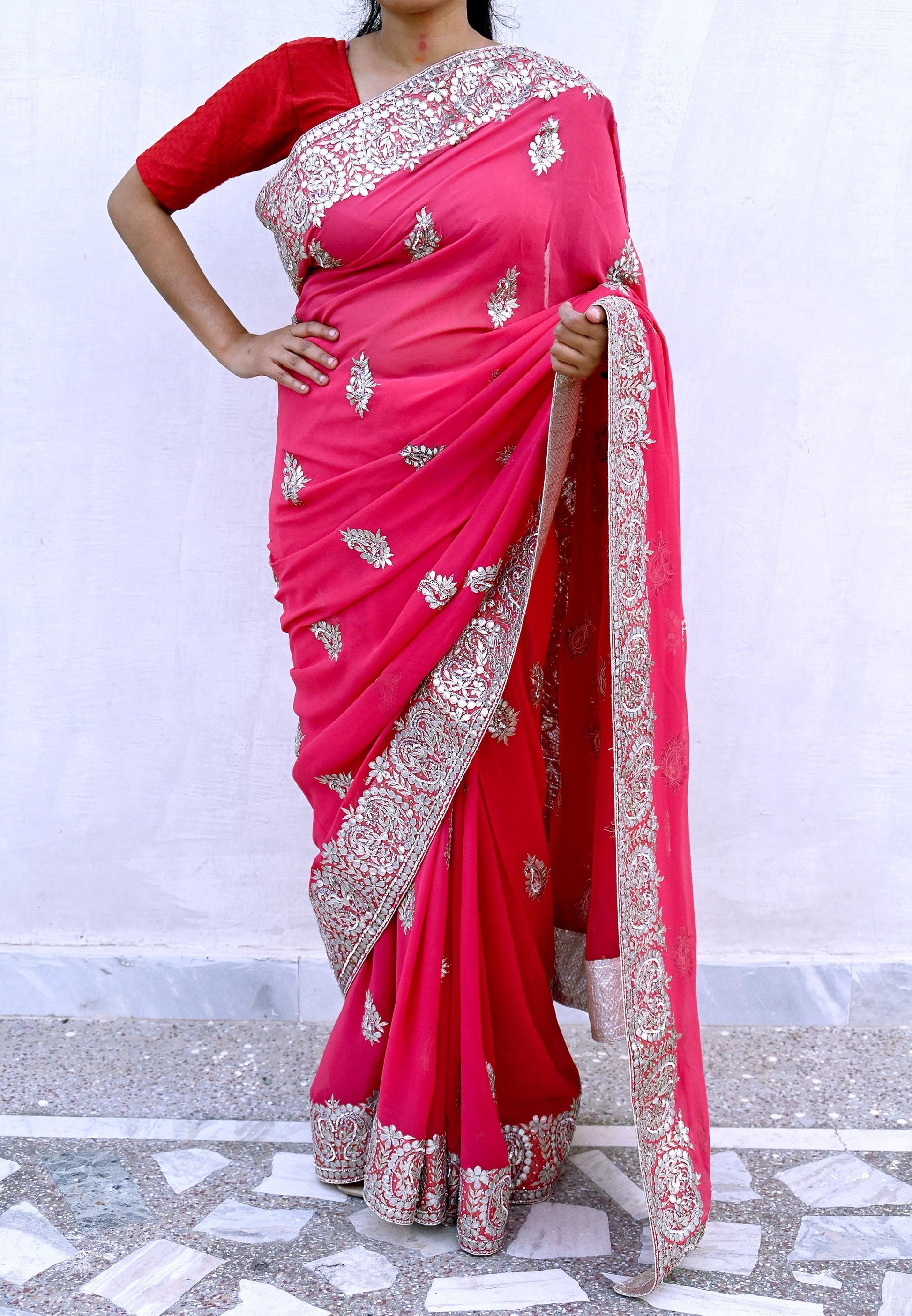 *Vintage Heavy Beautiful Pink Colored Hand Embroidered Pure Georgette Silk Designer Abu Jani Sandeep khosla Sari.