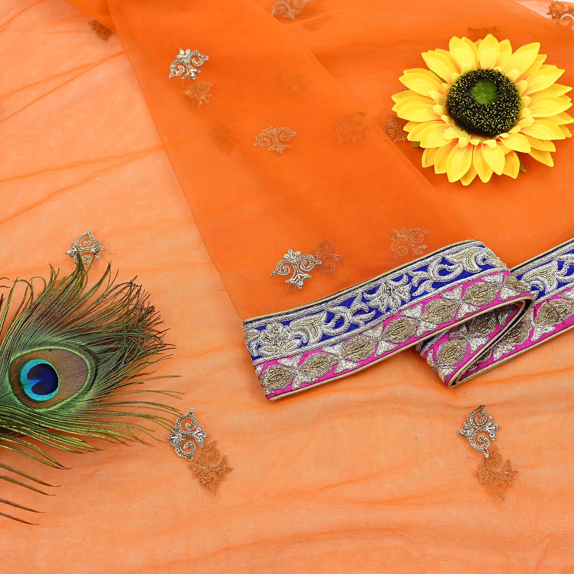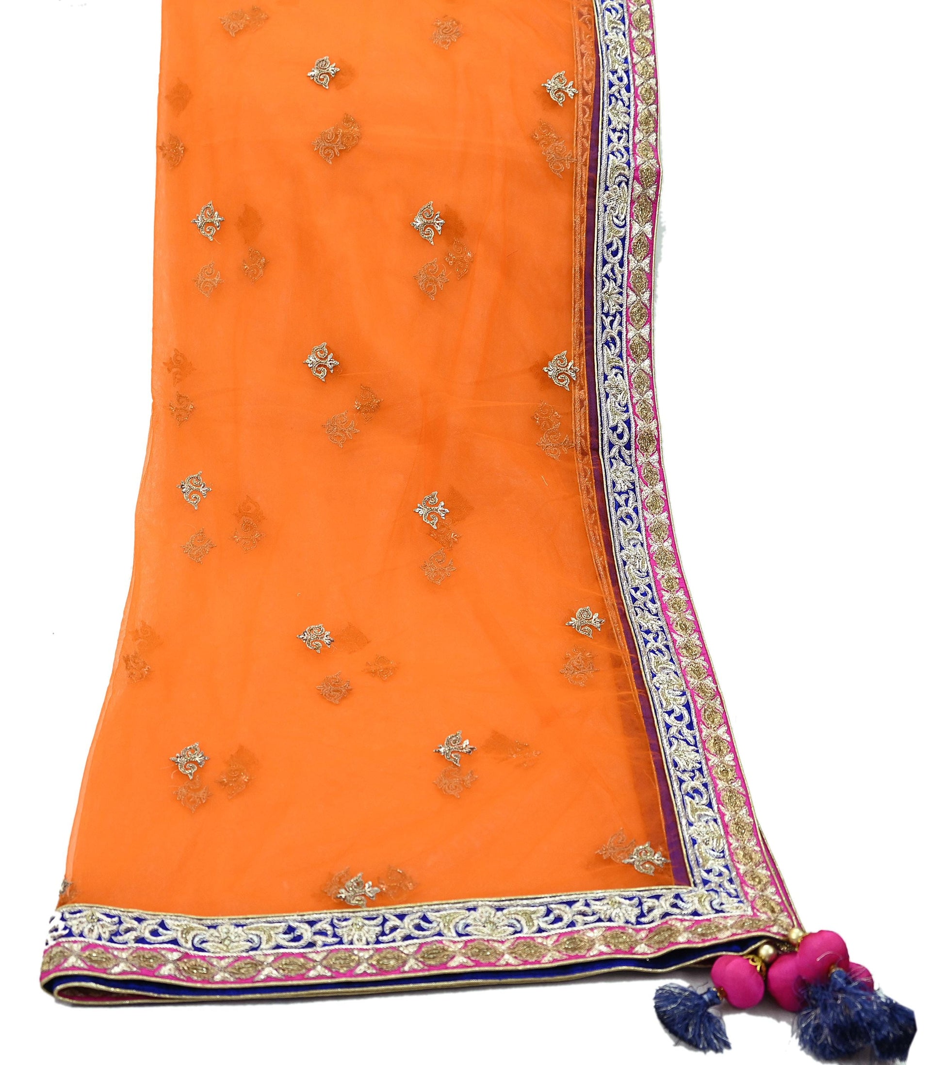 Stunning Beautiful Heavy Dupatta Hand Embroidered By Designer Sabyasachi Net Dupatta/Stole In Orange Color Fabric. This one of a kind item is difficult to express in words. Border feature is Floral design embroidered Pure Metallic Golden Zardozi/ Dabka, Zari, Golden Sequins, Golden Glass Beaded, Golden Beaded work embellished work is the highlight of the dupatta. Also you can see similar work with floral pattern in center part adds to its beauty. Beautiful Blue & magenta Border & Blue Hanging work is giving a fabulous look to the Dupatta. Awesome one !!!