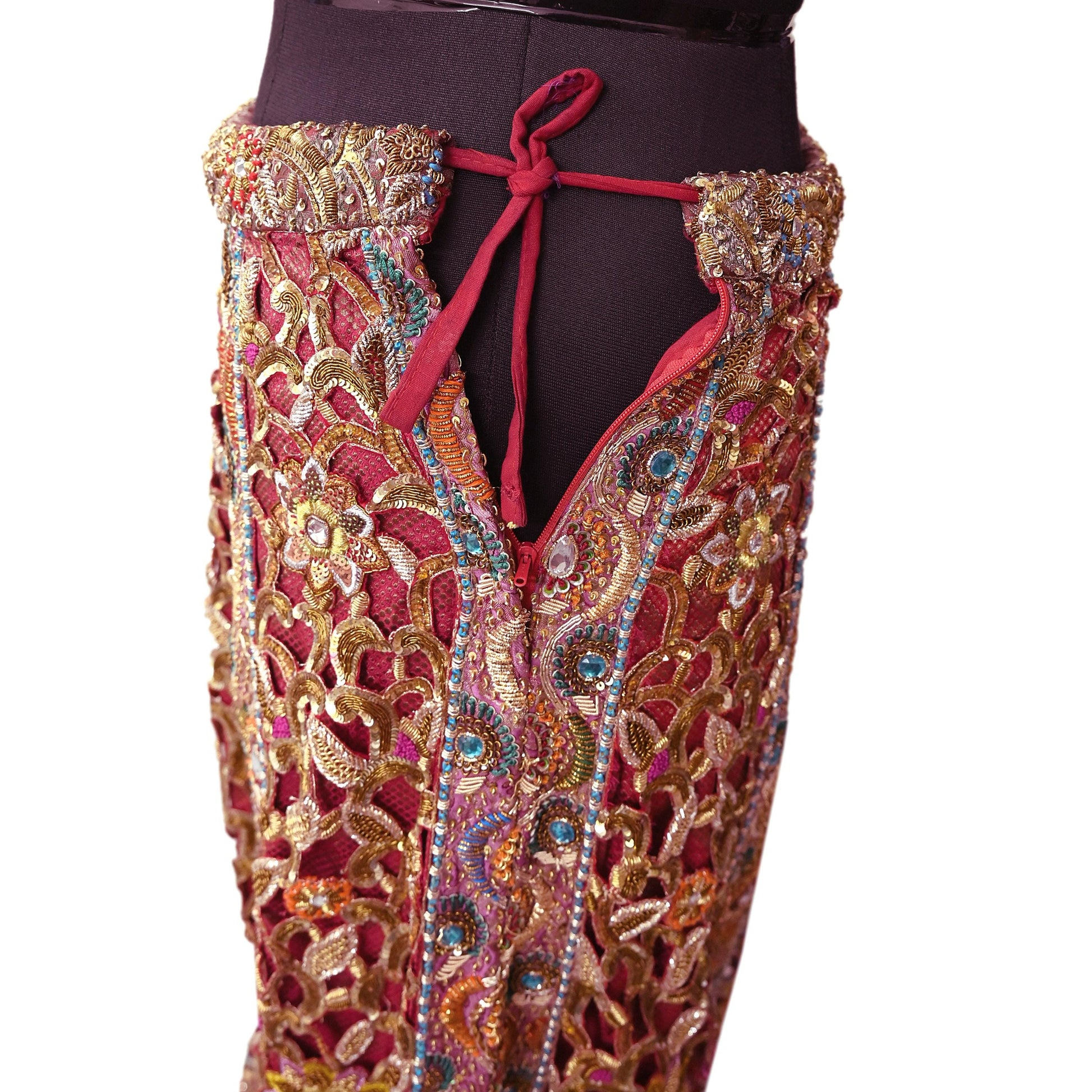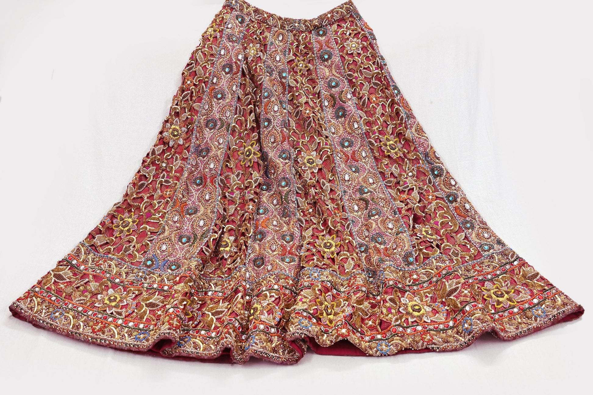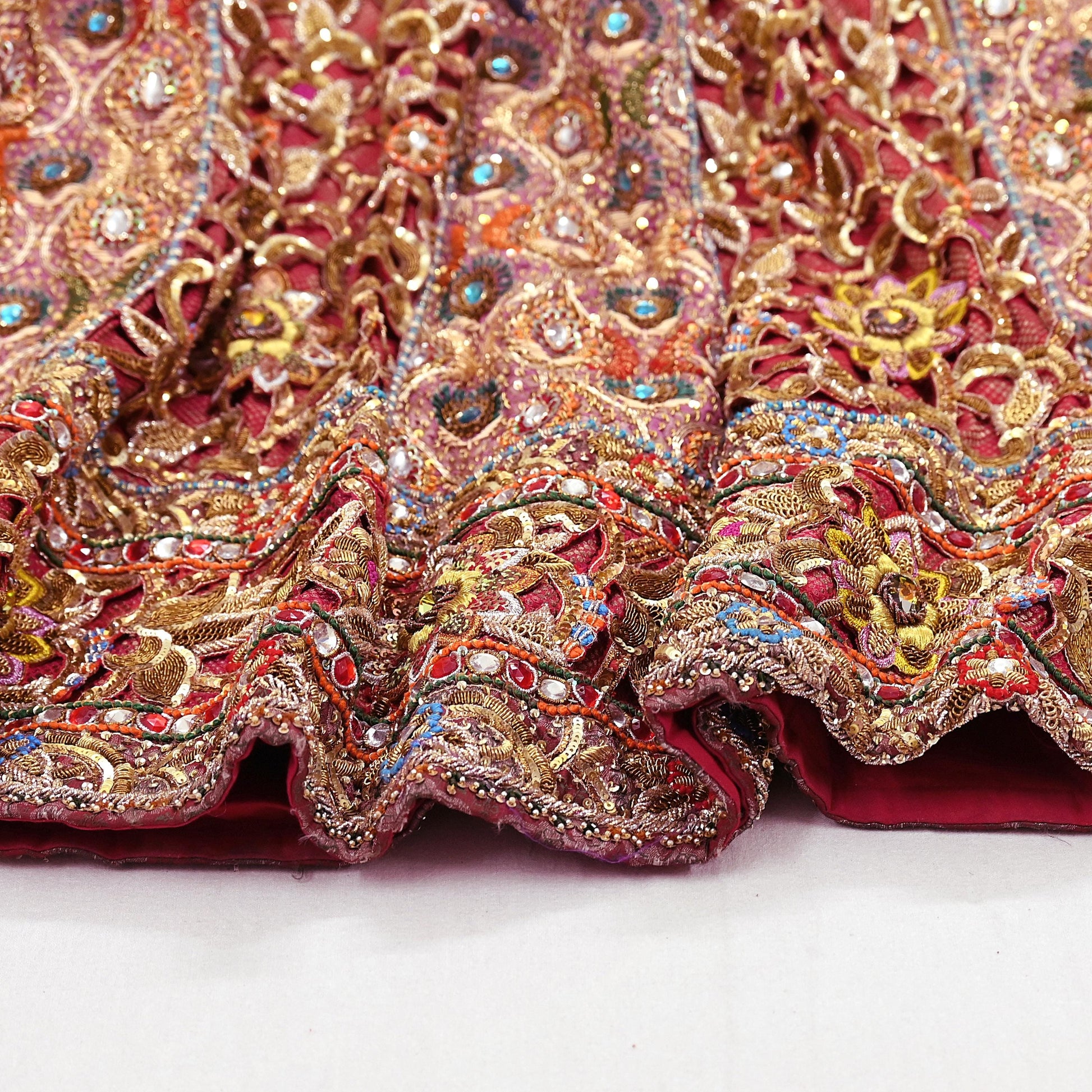 *Vintage Heavy Hand Embroidered Brocade Heavy Lehenga/ Skirt Set Designer By Manish Malhotra Pure Satin Silk Fabric In Red & Pink Color.
