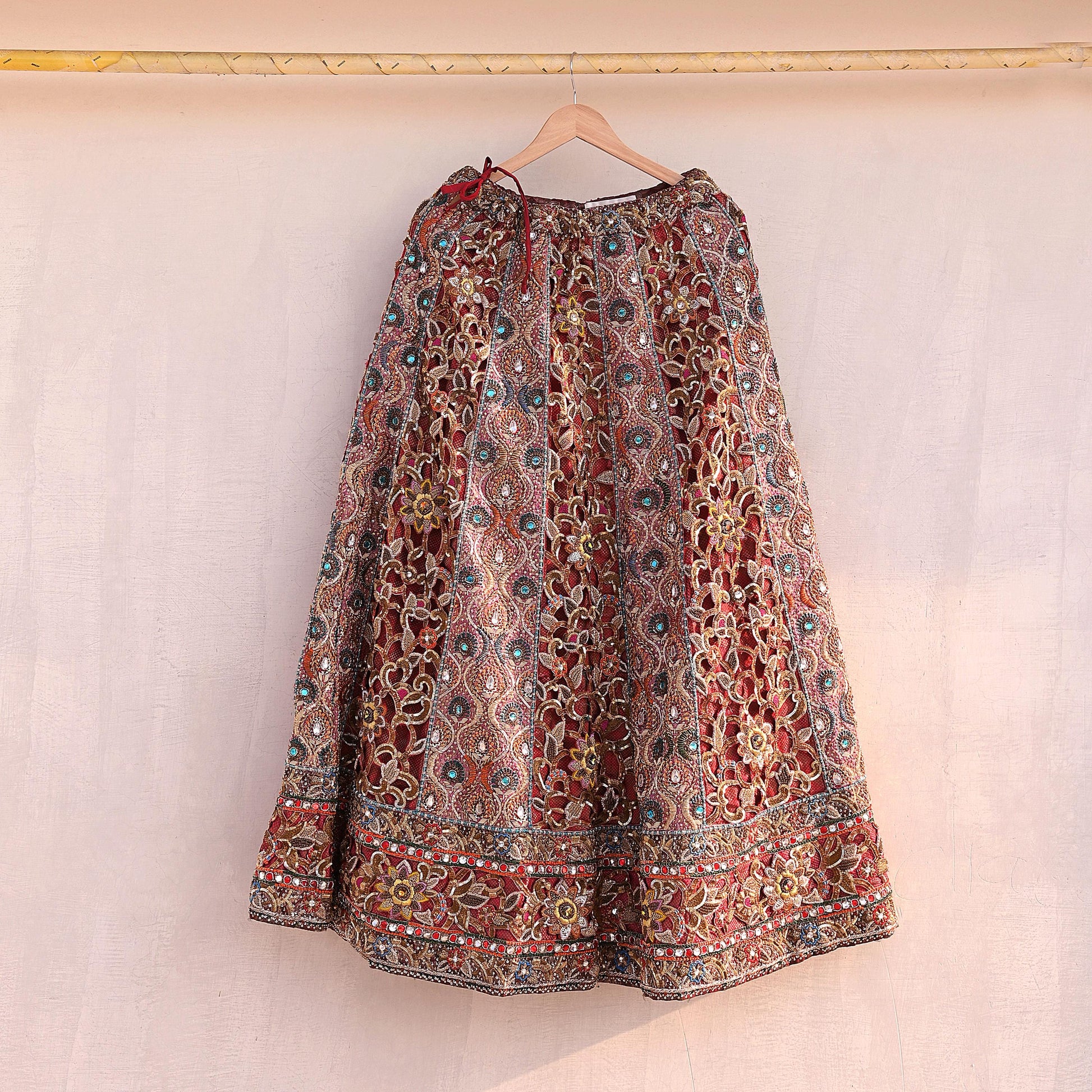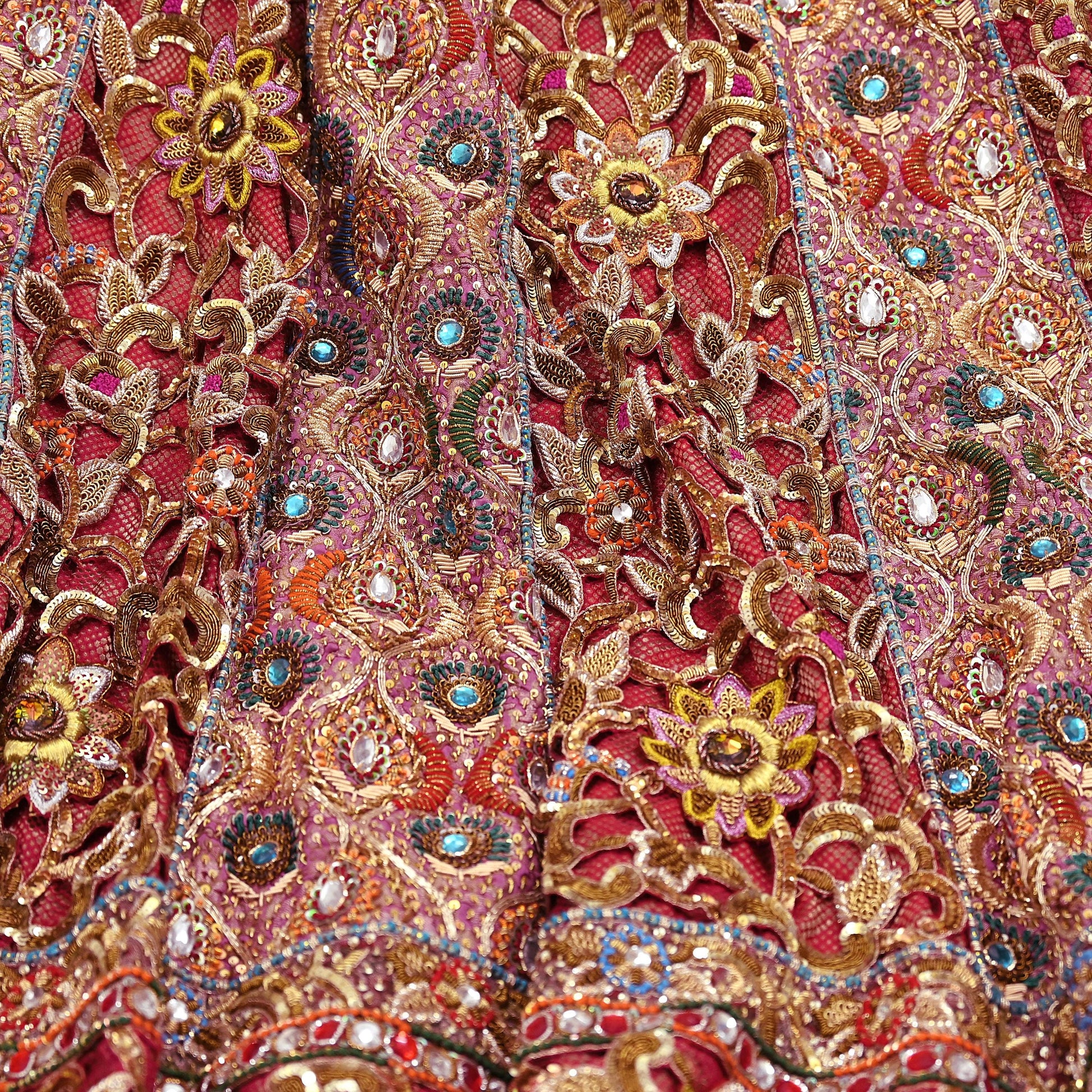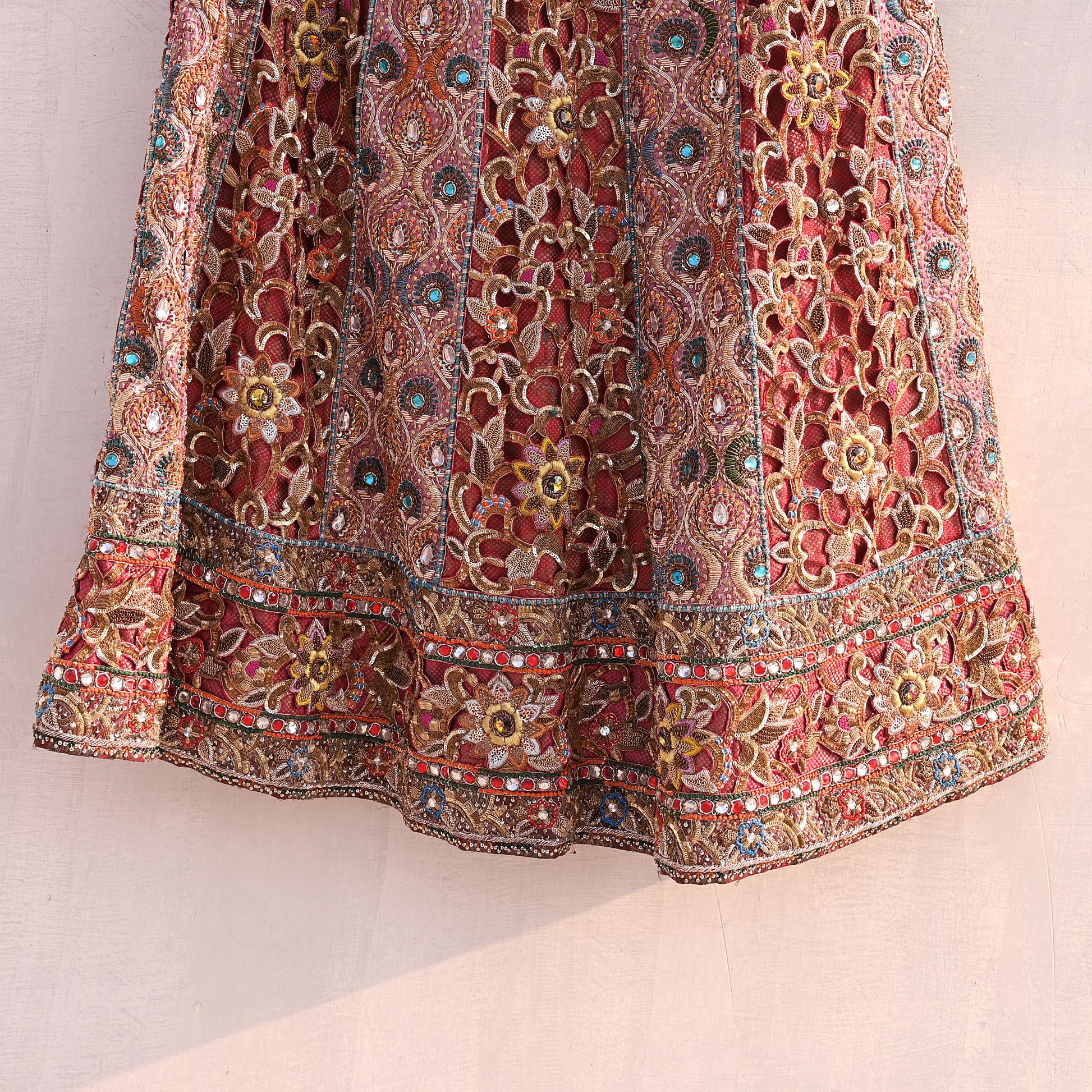 *Vintage Heavy Hand Embroidered Brocade Heavy Lehenga/ Skirt Set Designer By Manish Malhotra Pure Satin Silk Fabric In Red & Pink Color.
