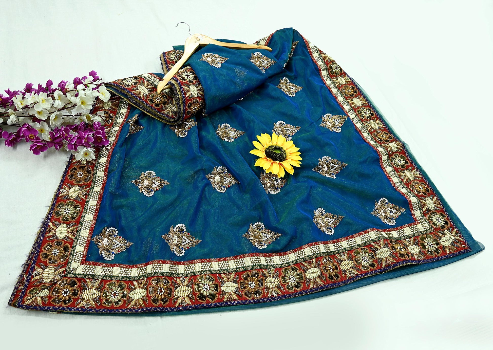 Indian Pre-owned Sari Blue & Green Net/Mesh Hand Embroidered Anamika Khanna Designer Sarees Ethnic 6Yd Zardozi/Dabka Zari Wedding Sarees