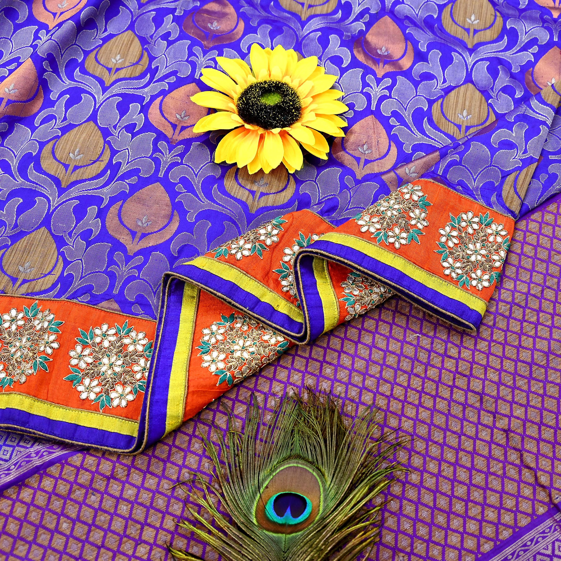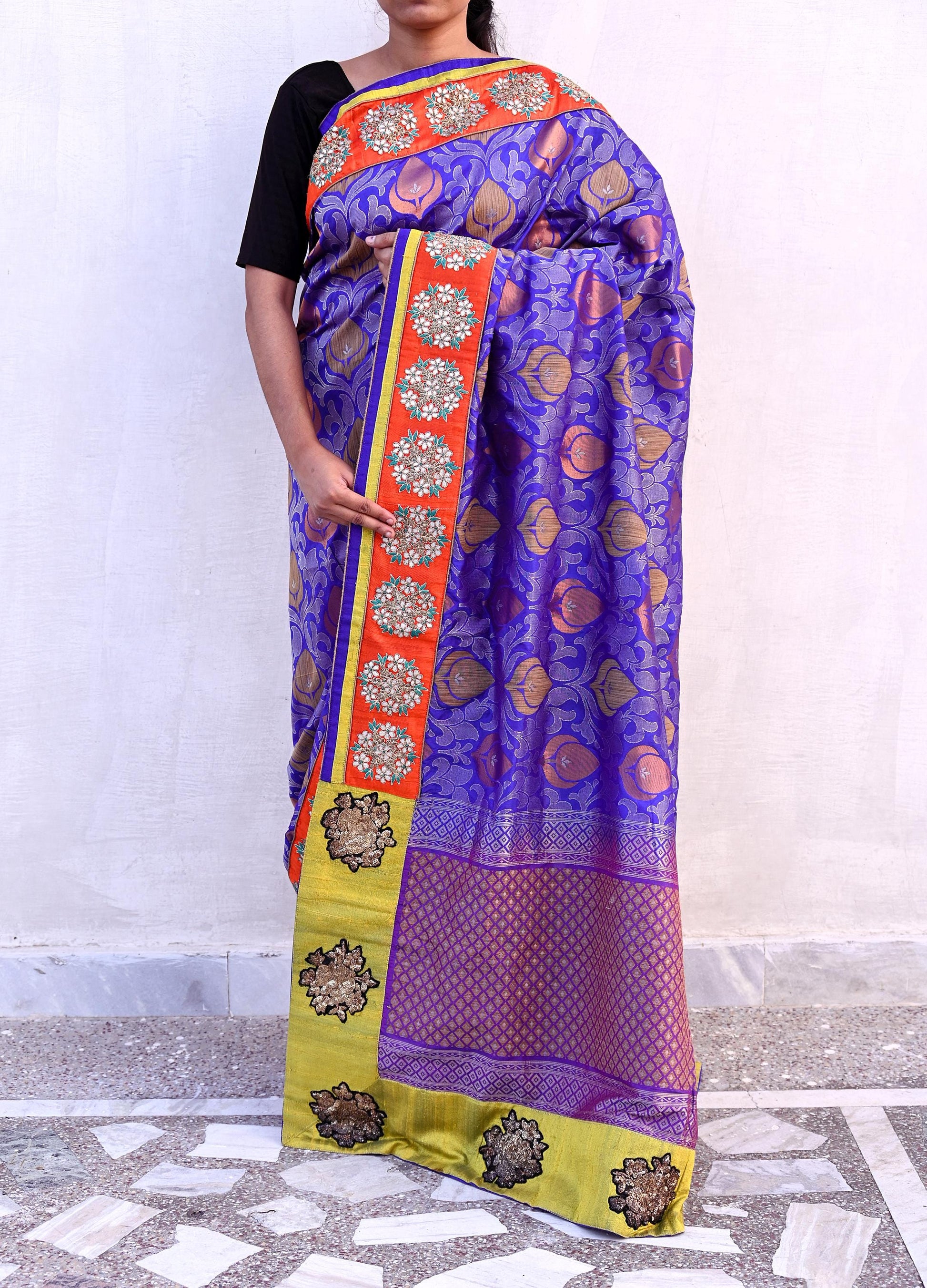 *Pallu & Border Features Floral Design Embellished With Golden Zardozi/Dabka Zari, Silver Gota patti, Green Thread, Golden Sequins Work. With Orange & Yellow Silk Border Work.