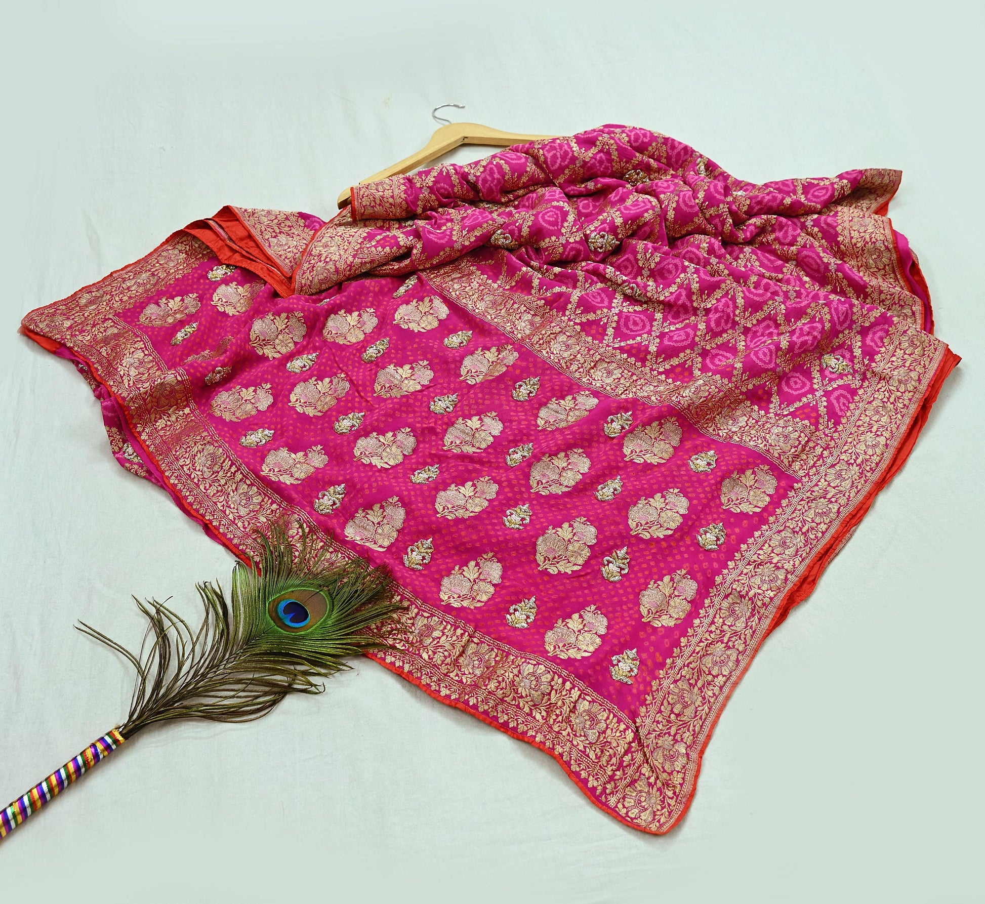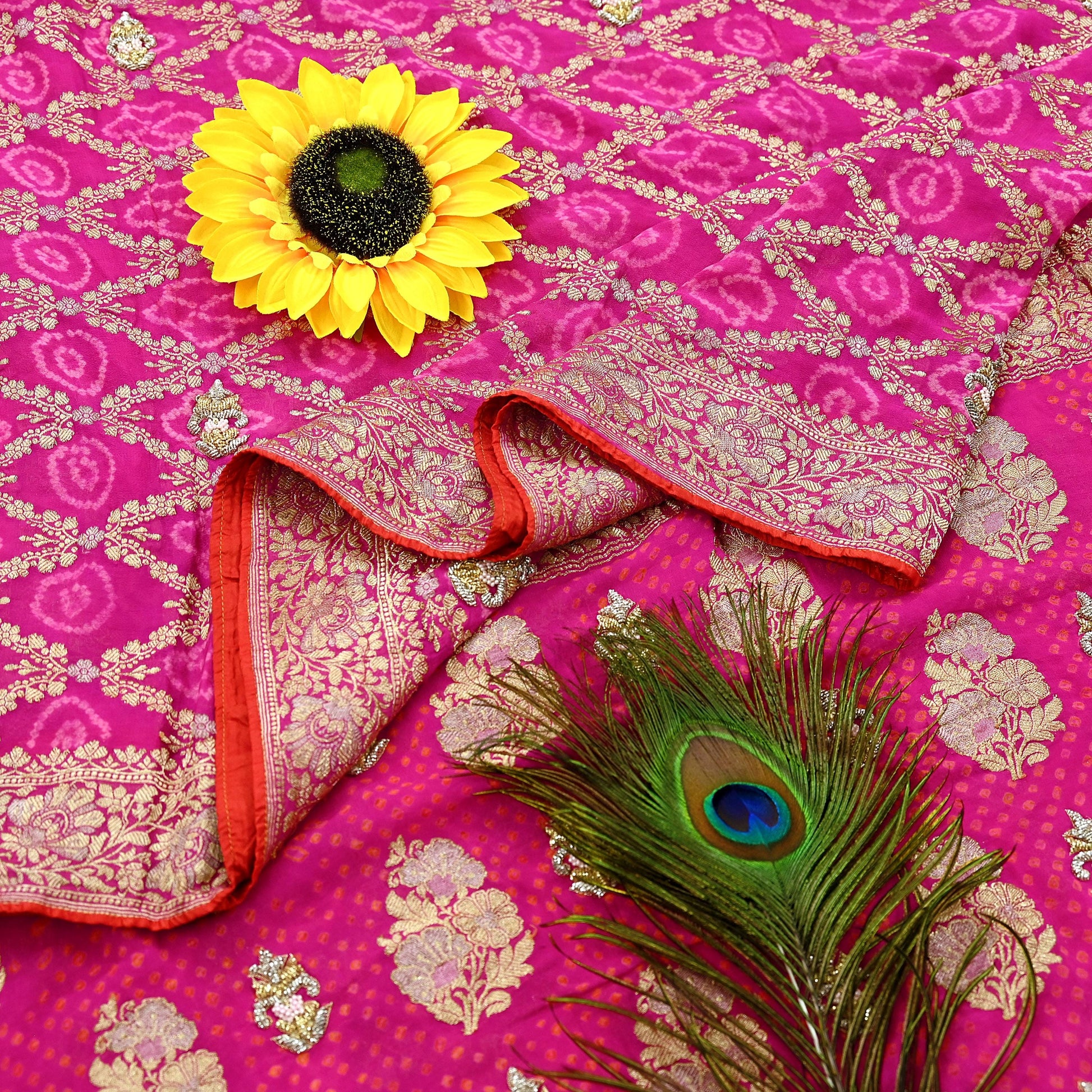 Indian Pre-Owned Sari Magenta Pure Georgette silk Hand Embroidered Bandhani Gharchola Sarees Ethnic Zardozi/Dabka Zari Wedding Saree
