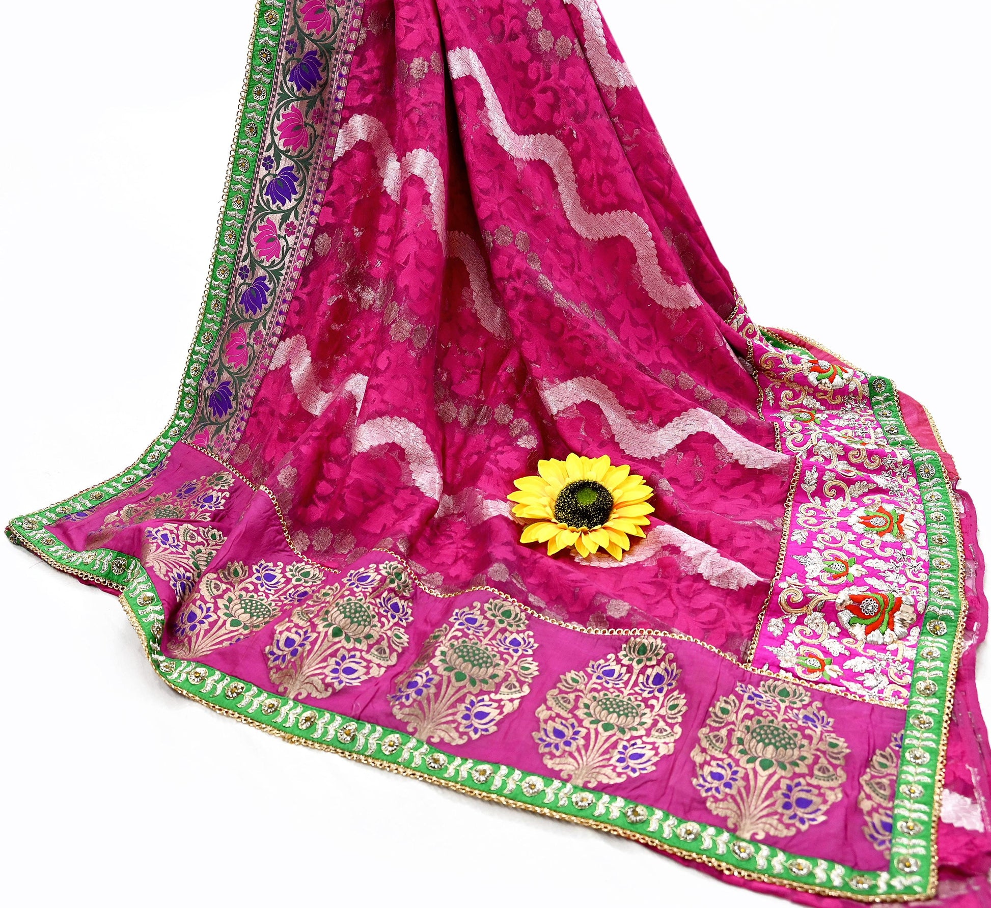 *Pallu & Border Features Floral Design Embellished With Golden & Silver Zardozi/Dabka Zari, Mukesh, Green & Red Thread, Golden Sequins Work. With Green & Magenat Silk Border Work.