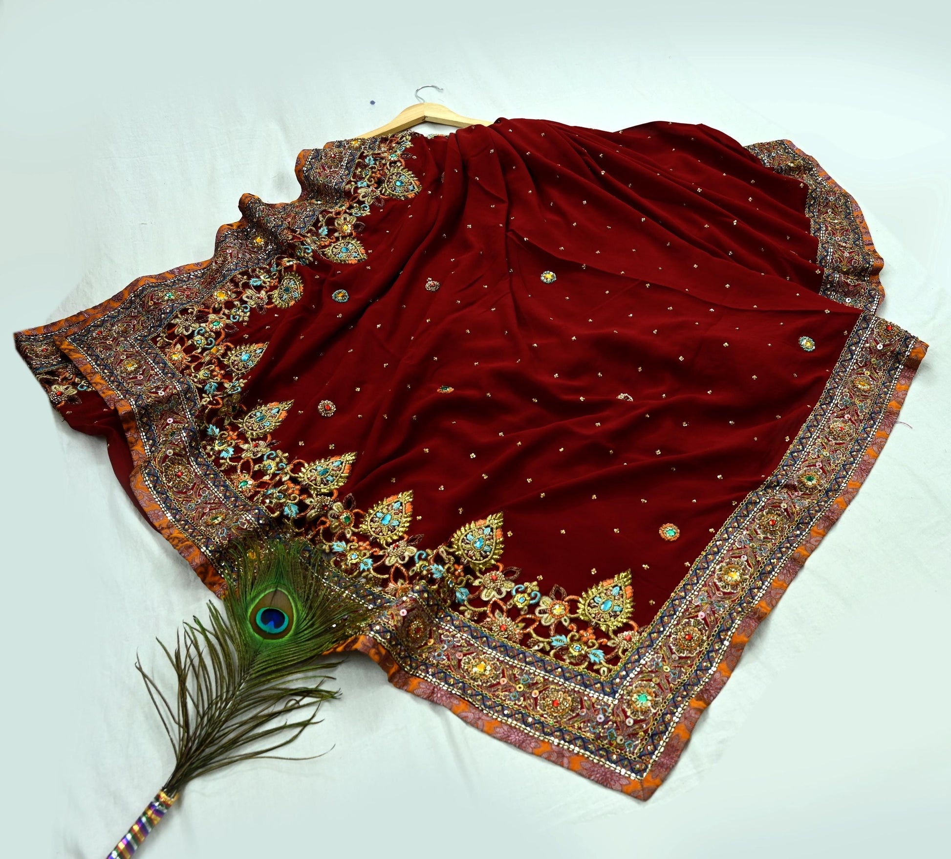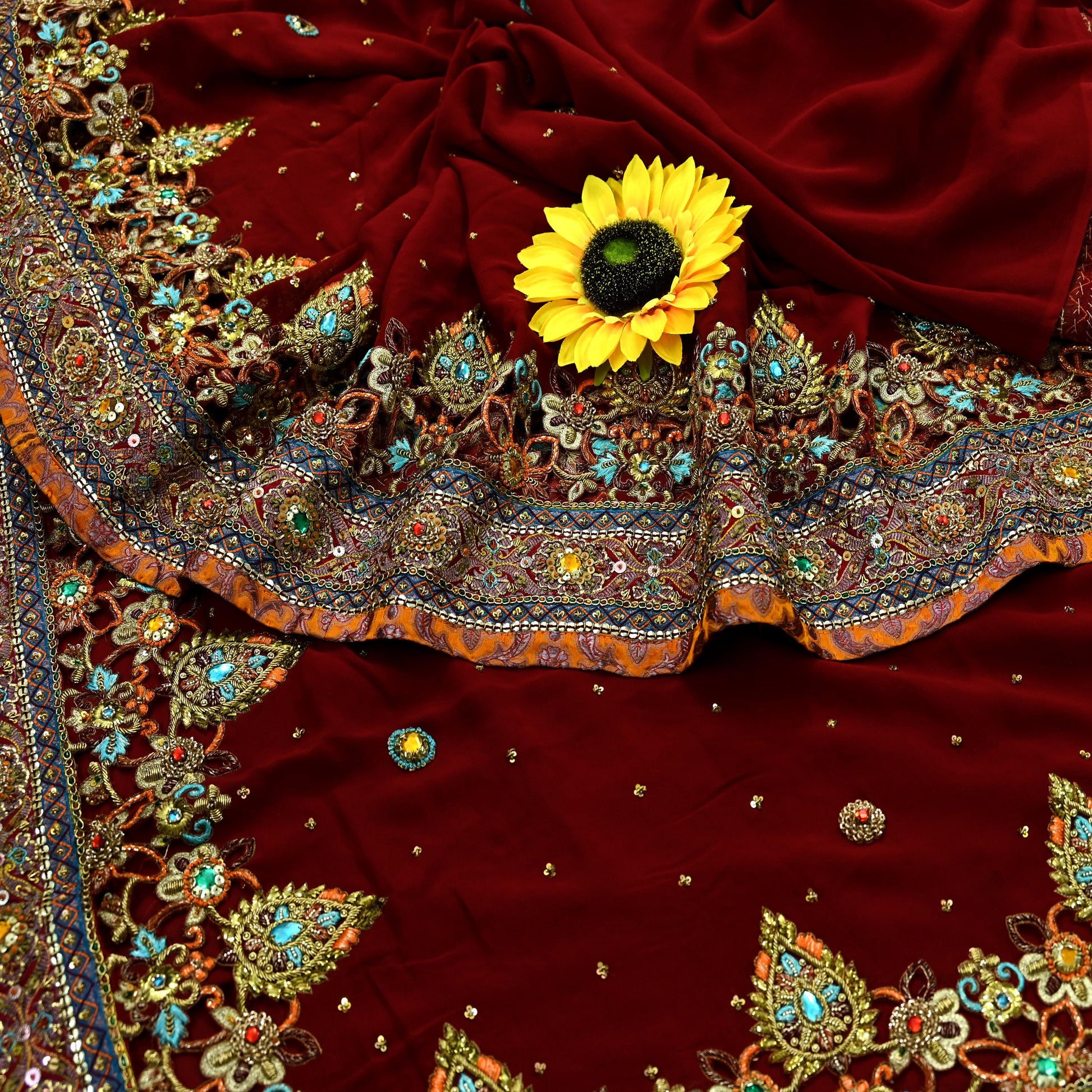 Step into timeless elegance with this luxurious hand-embroidered designer saree in a rich maroon hue. Crafted from pure georgette silk, this pre-owned saree boasts intricate detailing and a regal charm that makes it truly one of a kind.