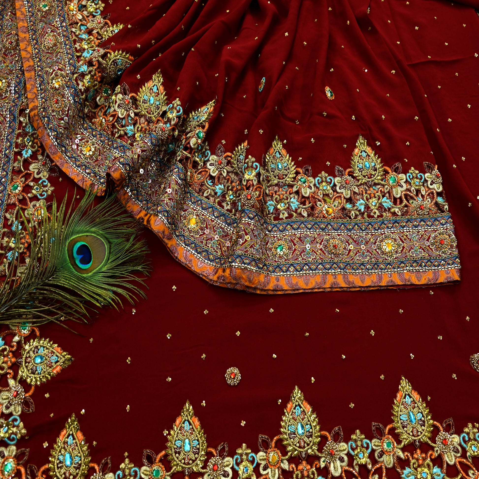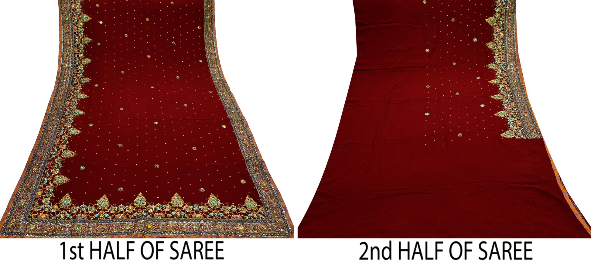Indian Pre-owned Sari Maroon Pure Georgette Silk Hand Embroidered Anamika Khanna Designer Sarees Ethnic 6Yd Sewing Zardozi Wedding Sarees