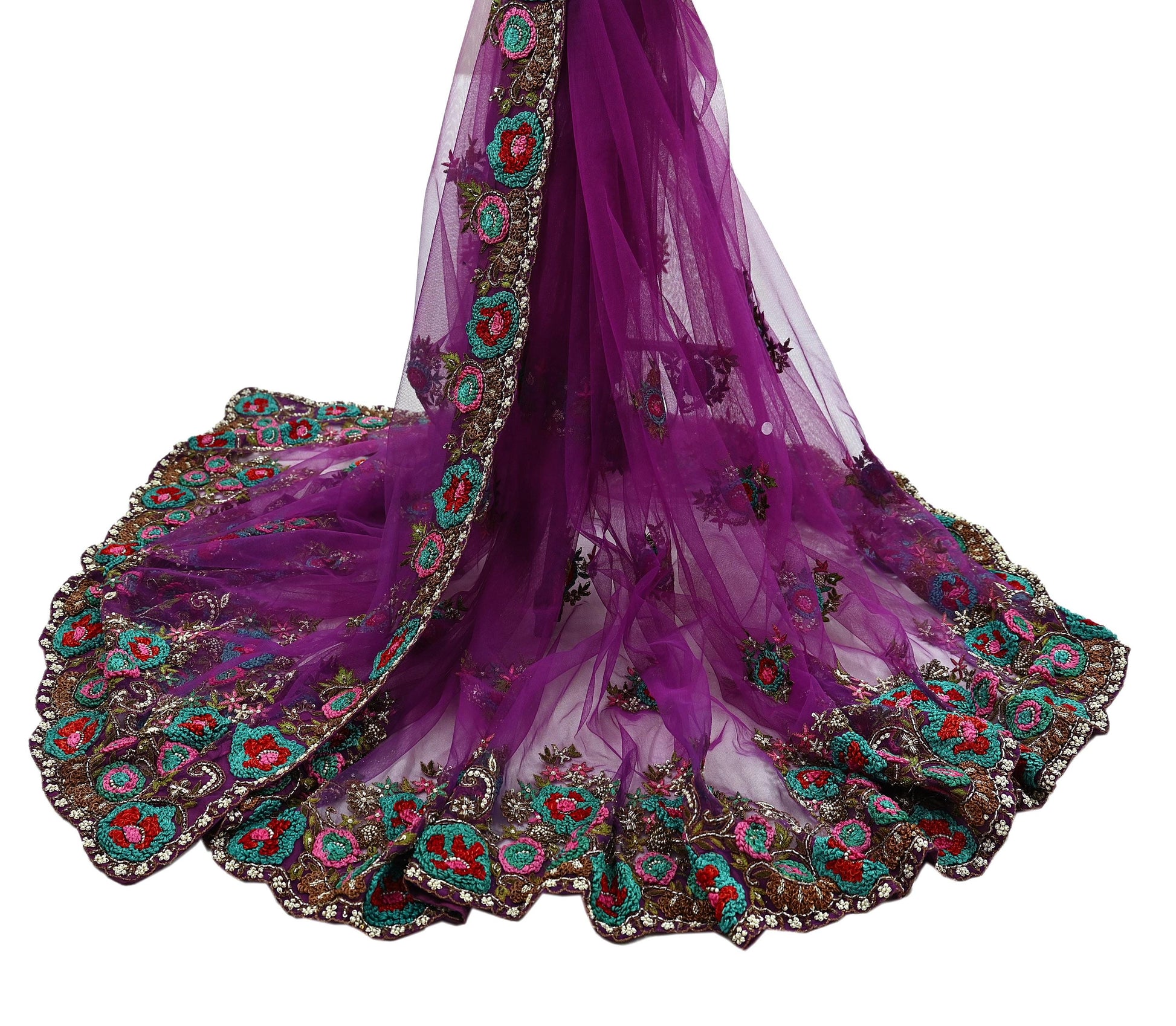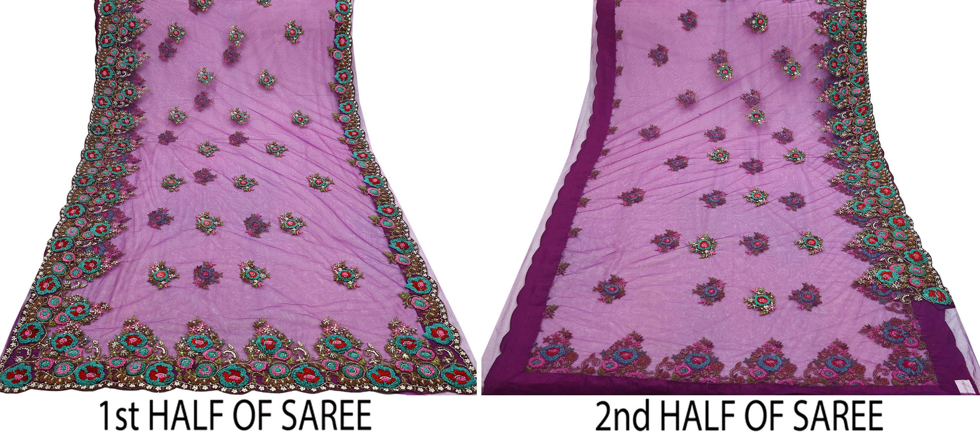 Indian Pre-Owned Sari Purple Net/Mesh Hand Embroidered Designer Manish Malhotra Sarees 6Yd Ethnic Zardozi/Dabka Zari Wedding Saree