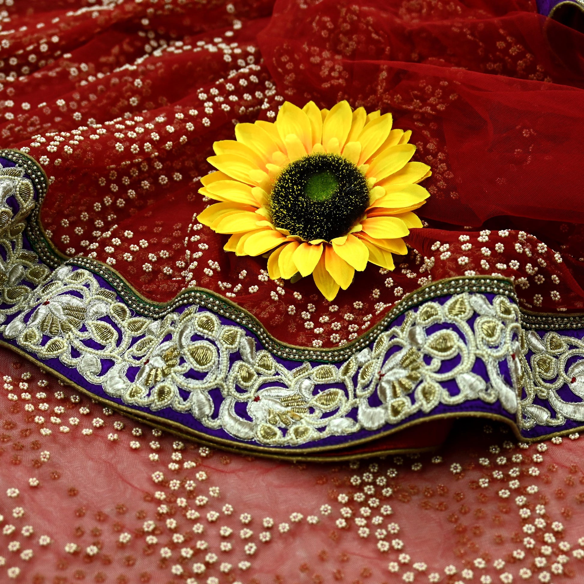 The pallu and border are adorned with intricate floral motifs, embellished with gold and silver zardozi/dabka zari, delicate white pearl-like beads, and rich red thread embroidery.