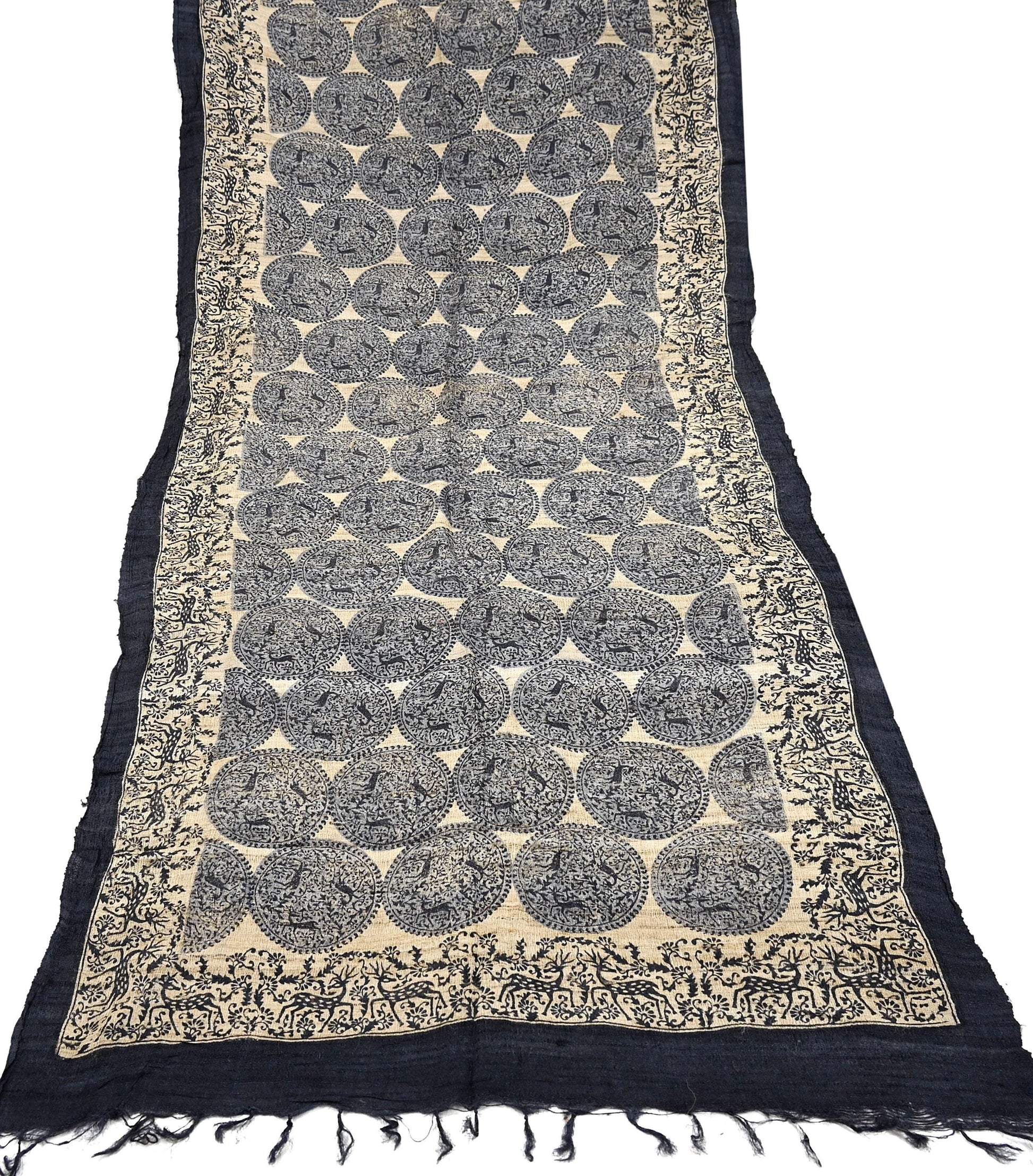 Indian Vintage Beige & Black Dupatta Long Stole 100% Pure Khadi Silk Hand Woven/ Printed Scarves Veil Scarf Wrap Hippie Fringes