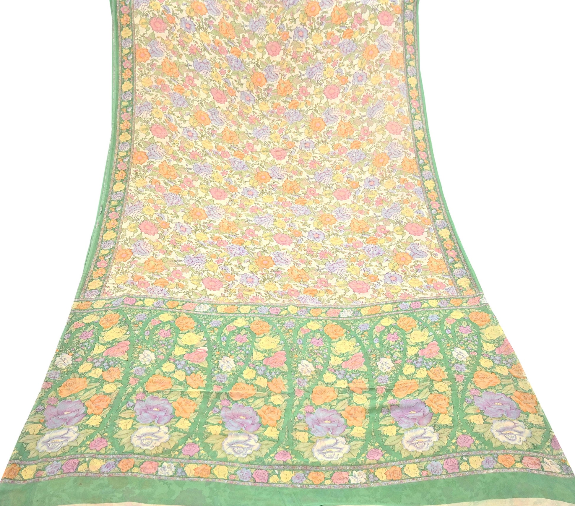 Indian Vintage Beige & Green Saree 100% Pure Georgette Silk Block Printed Sari Sewing 6yd Craft Fabric Dress Designing for Dress making