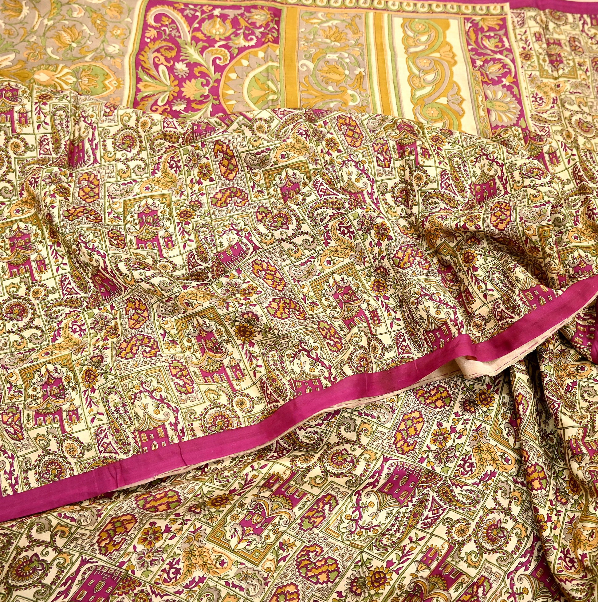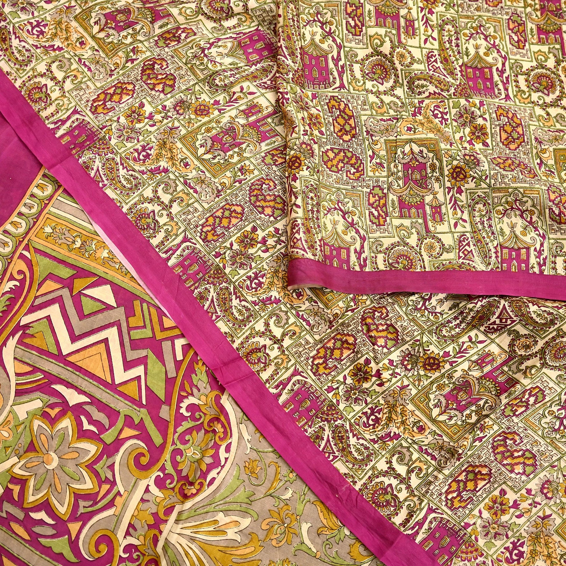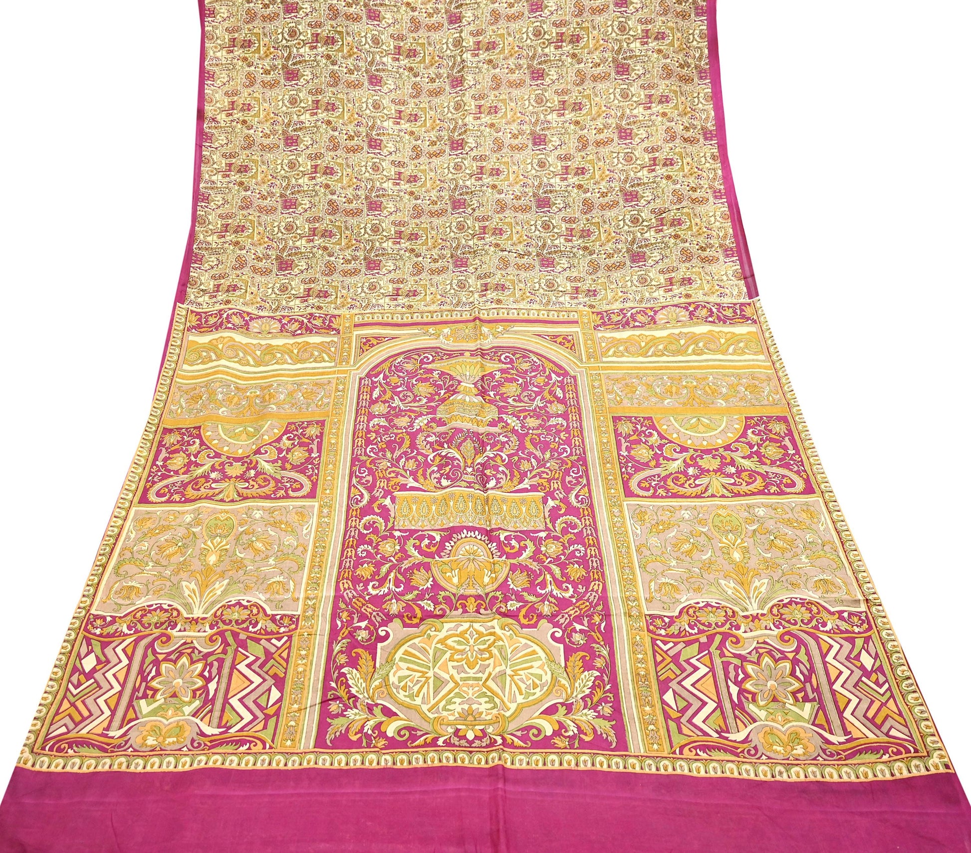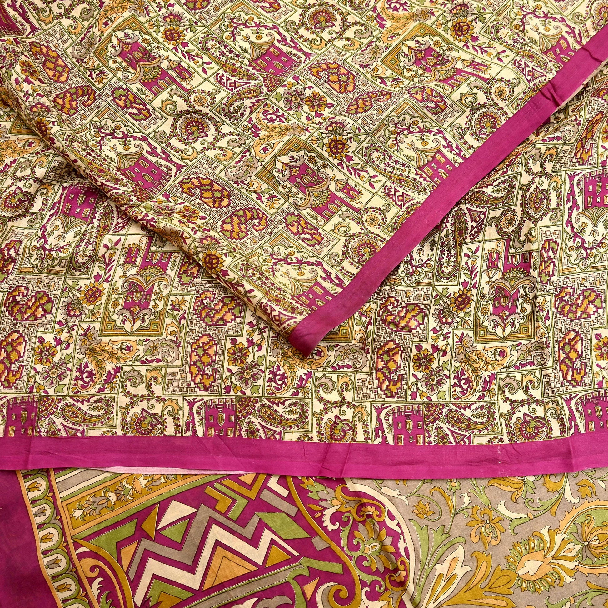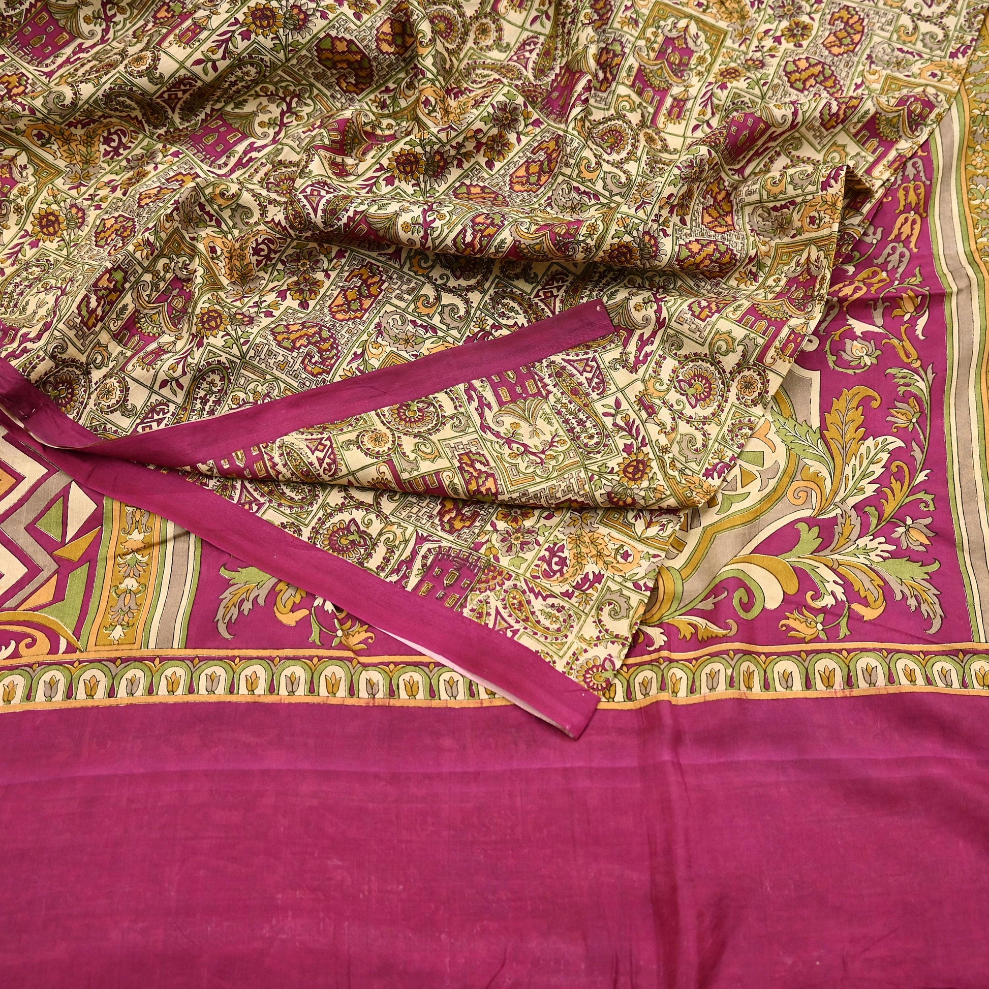 Indian Vintage Beige & Purple Pure Silk Printed Saree 5Yards Soft Floral Fabric for Dressmaking, Quilting, Crafting, Sewing, Dress Making