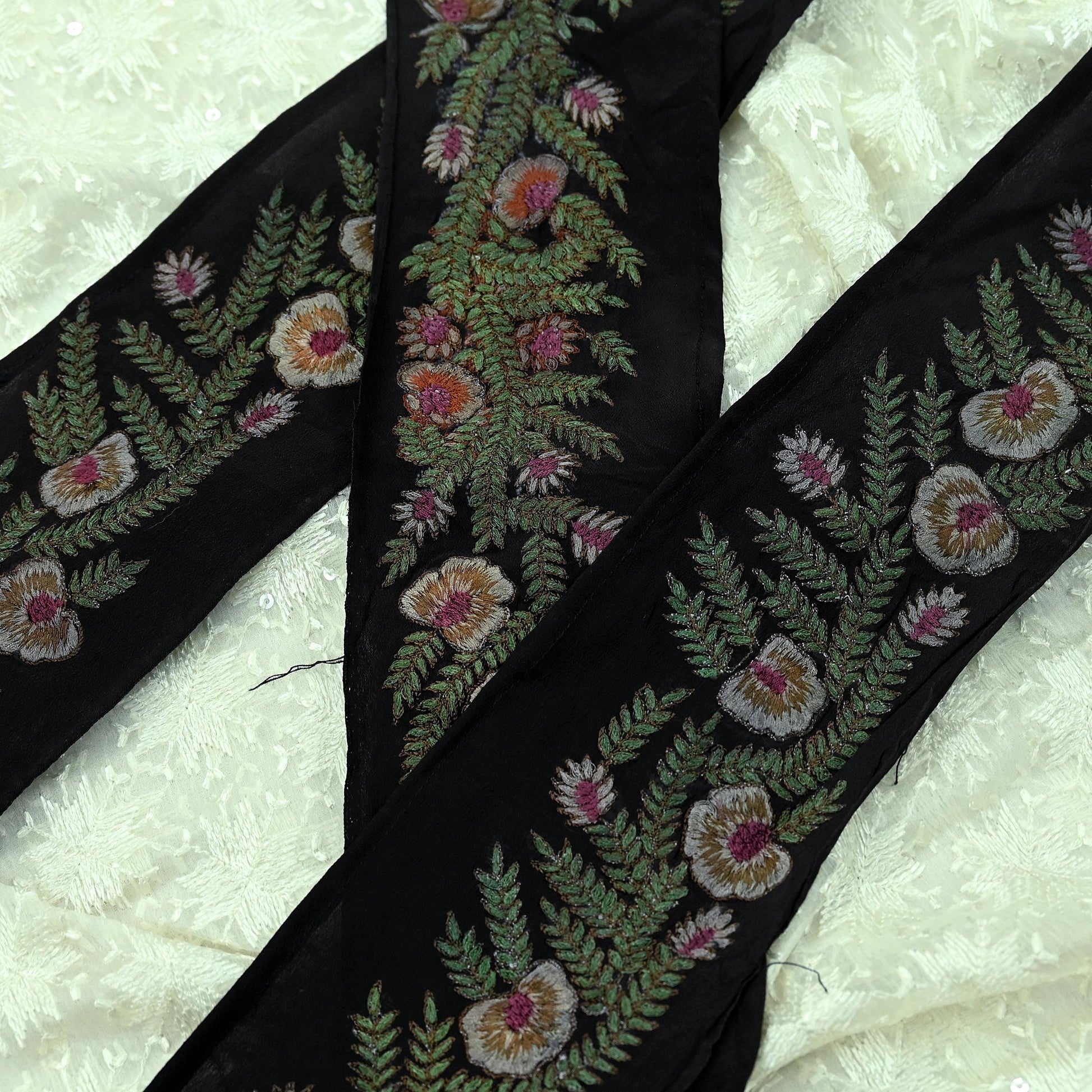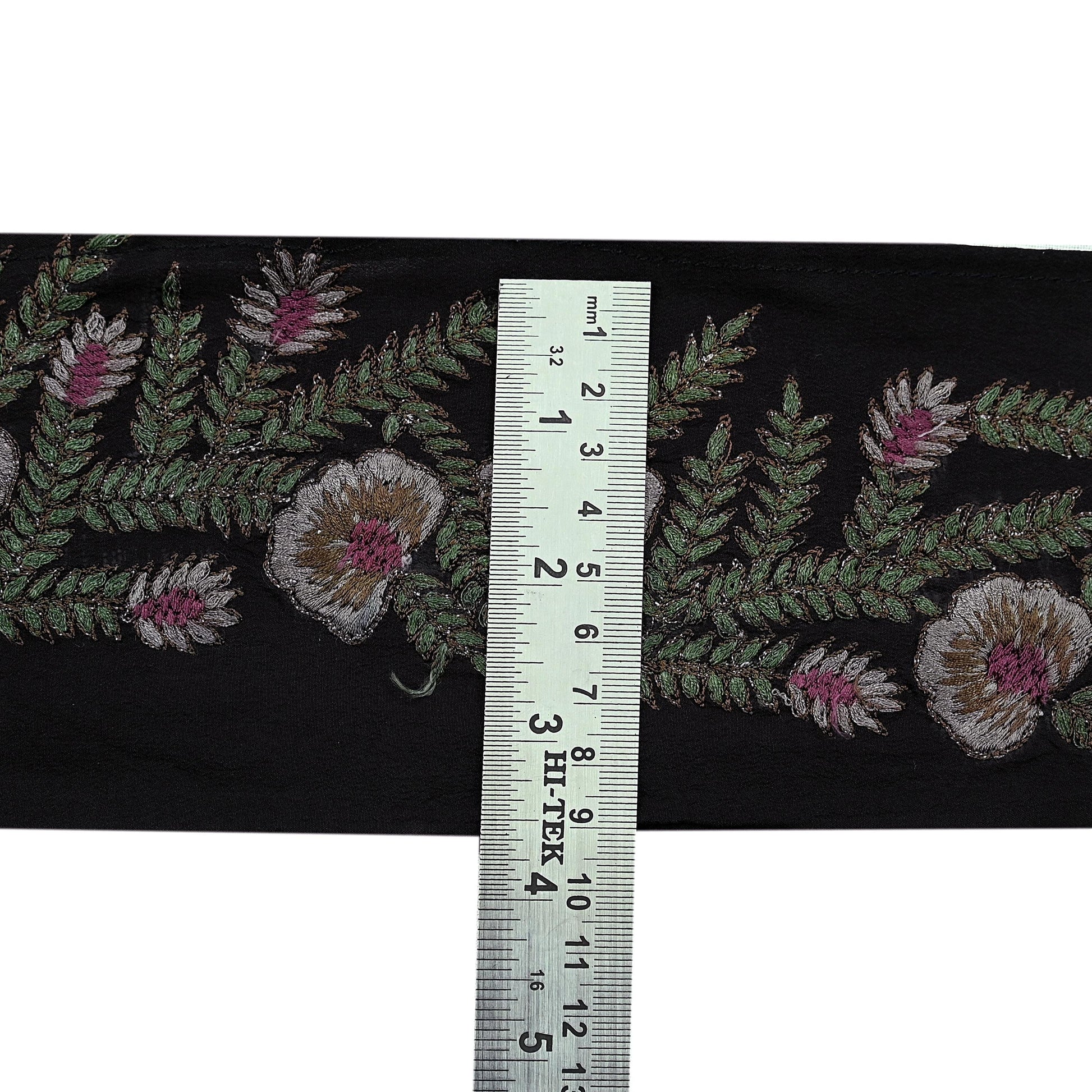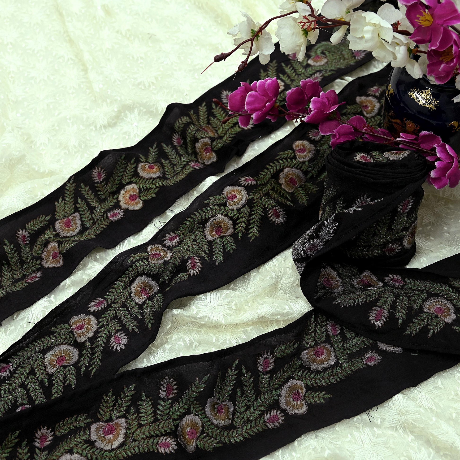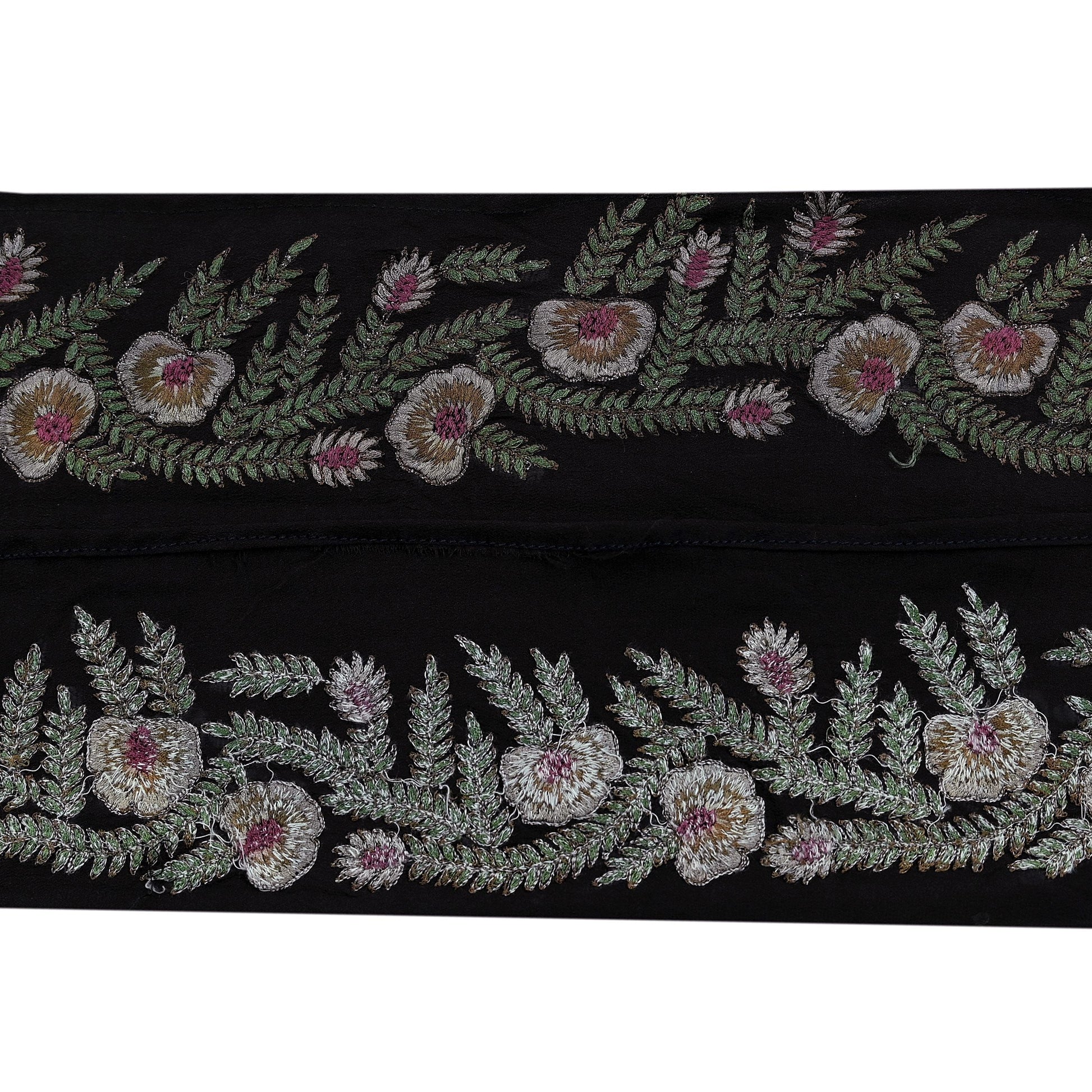 Indian Vintage Black Border Pure Crepe Silk Hand Embroidered Craft Trim 1Yd Lace Sewing Sari Ribbon Recycled Zardozi Dabka