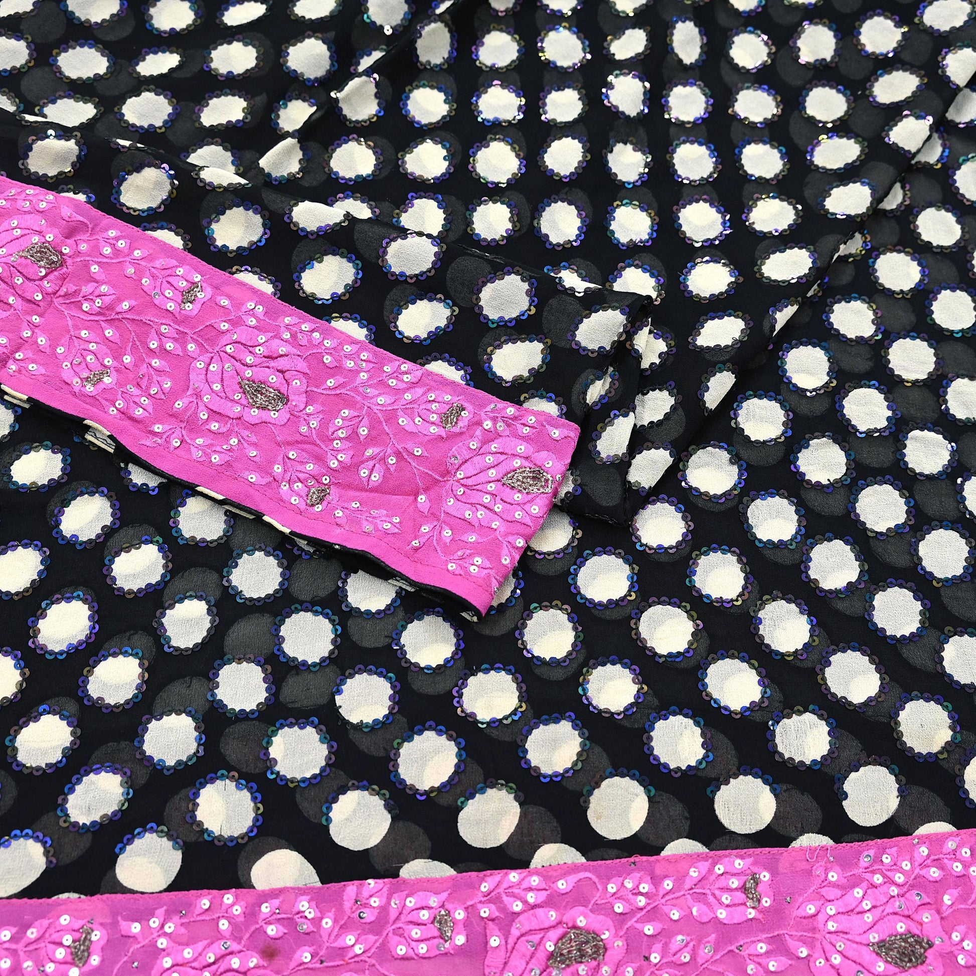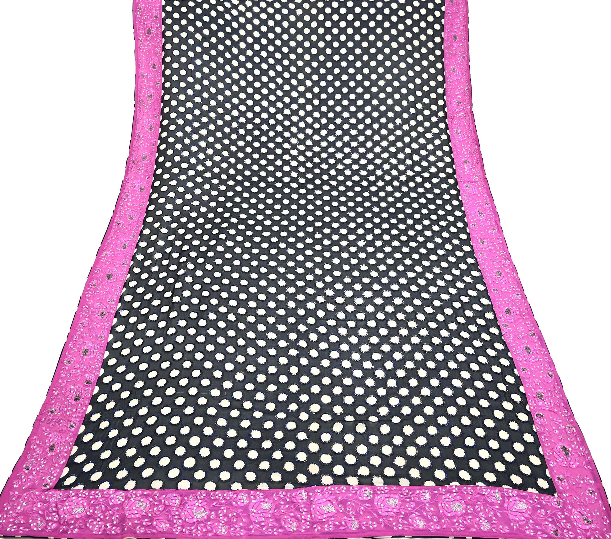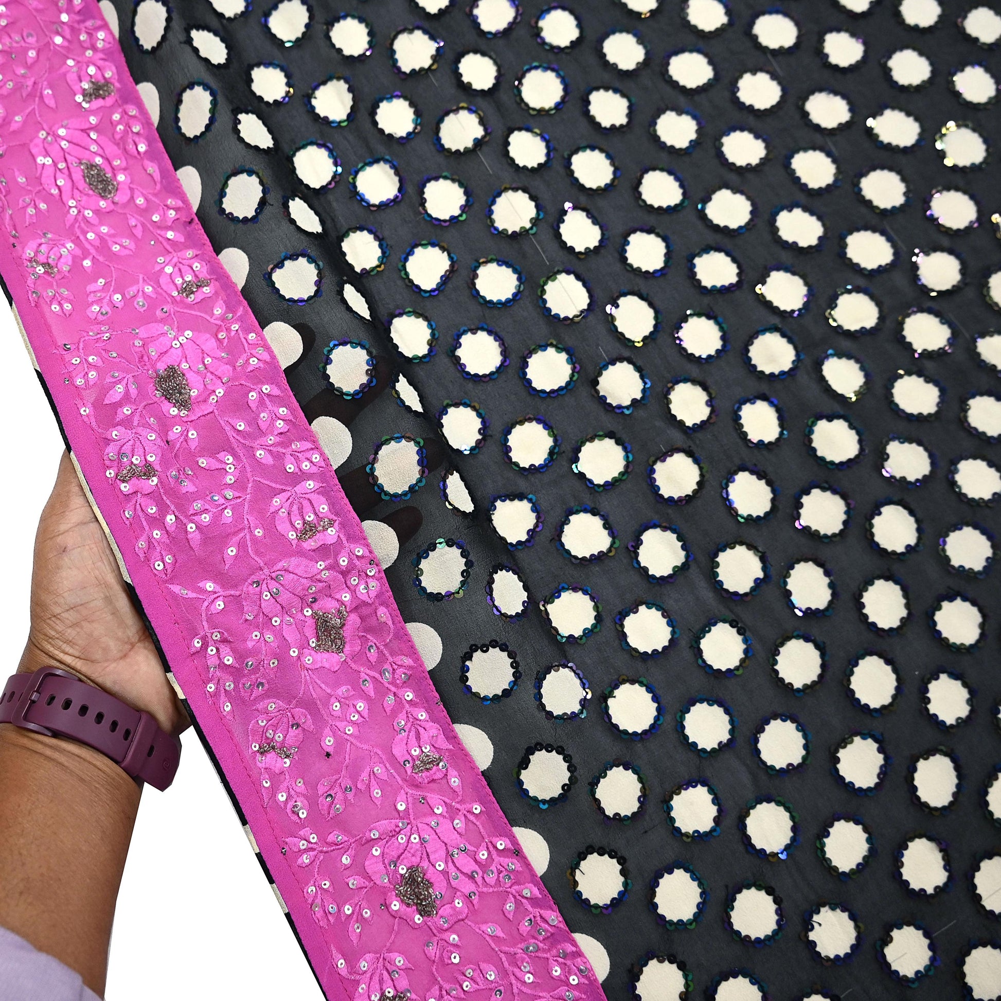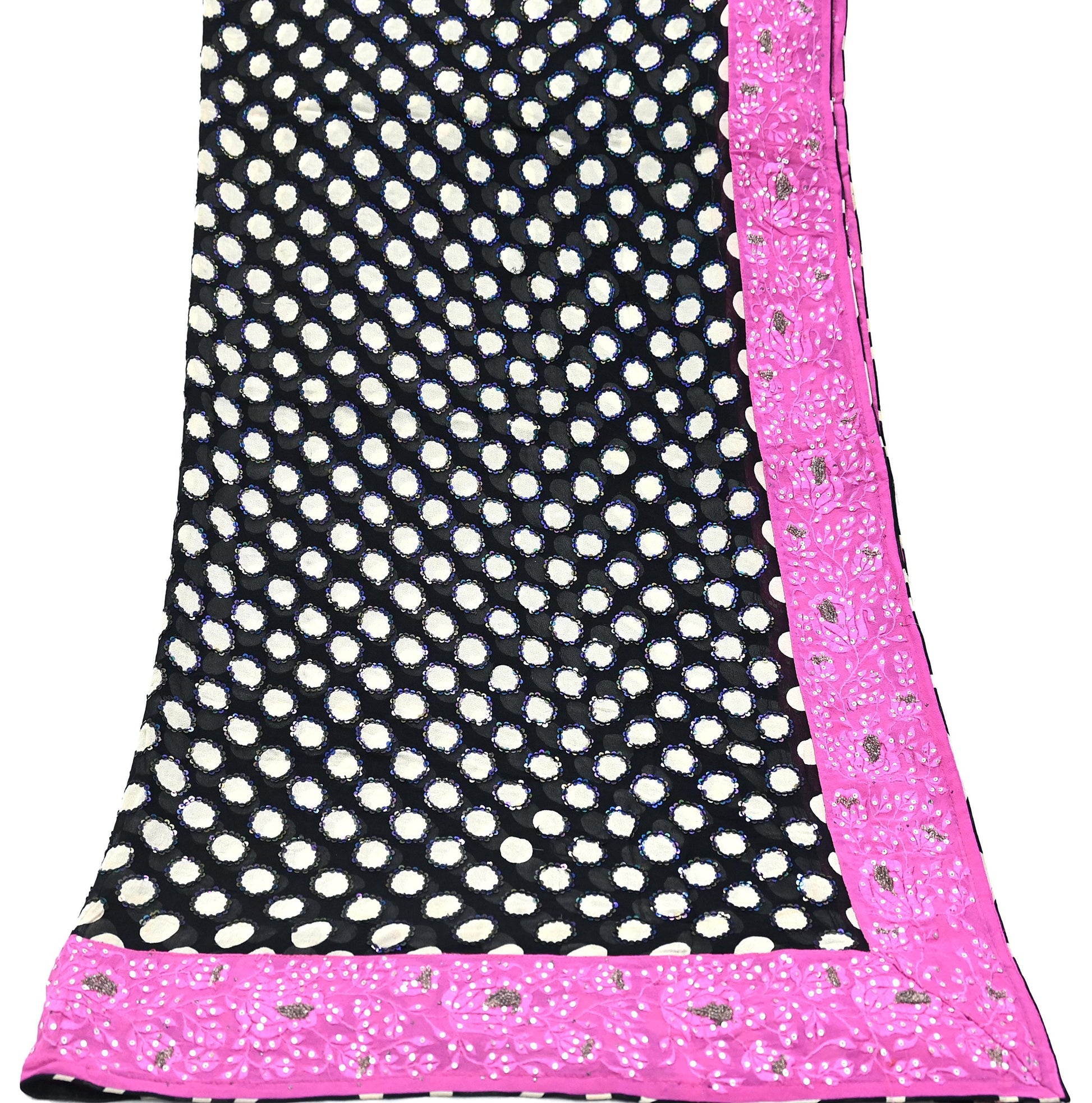 Stunning Beautiful Look Dupatta Hand Embroidered Pure Georgette Silk Dupatta/Stole In Black Color Fabric. This one of a kind item is difficult to express in words. Border feature is Polka dot design embroidered silver & Blue Sequins, white Beaded/ Stones, Pink Thread work embellished work is the highlight of the dupatta. Also you can see similar work with floral pattern in center part adds to its beauty. Pink Pure Georgette silk border work is giving a fabulous look to the dupatta. Awesome one !!!