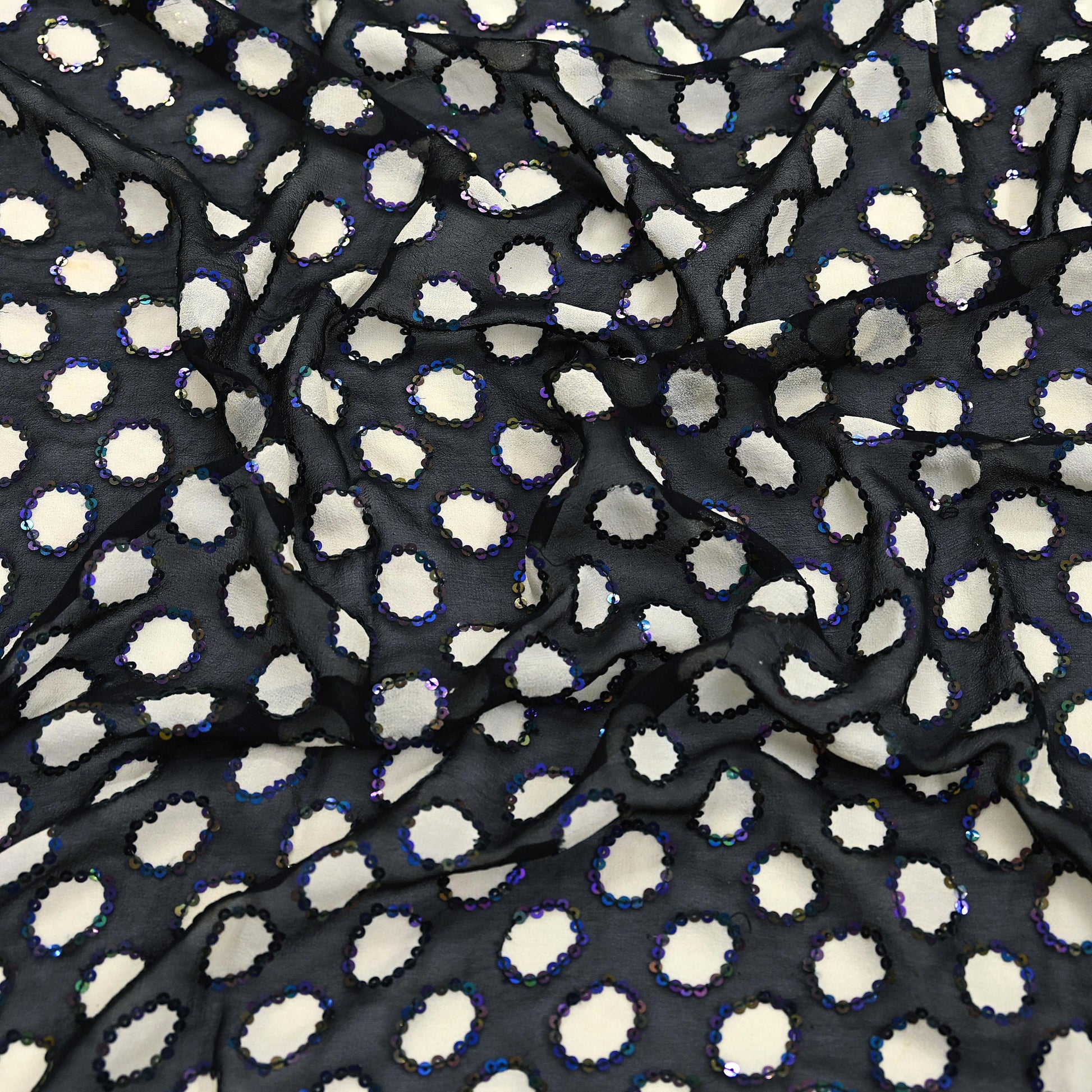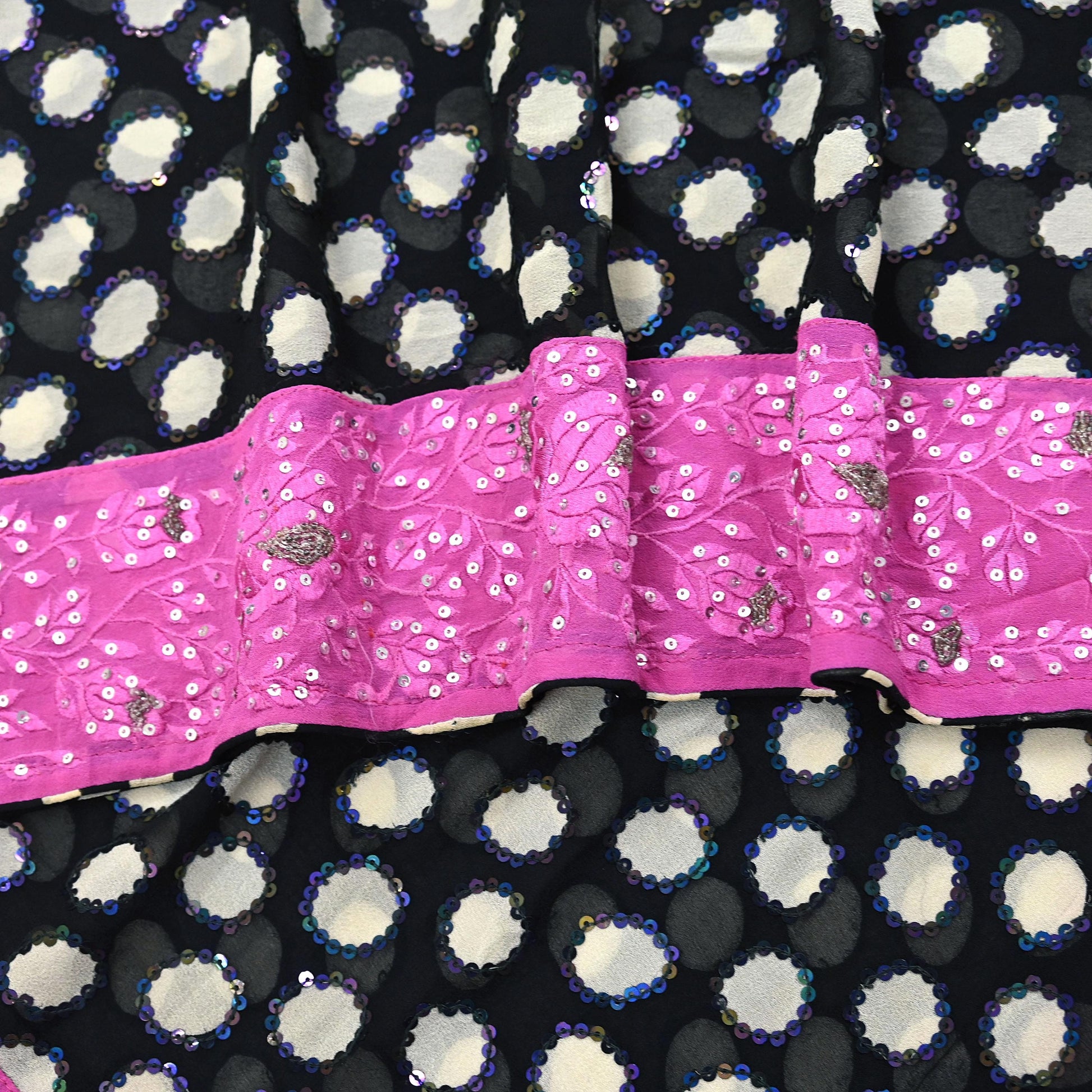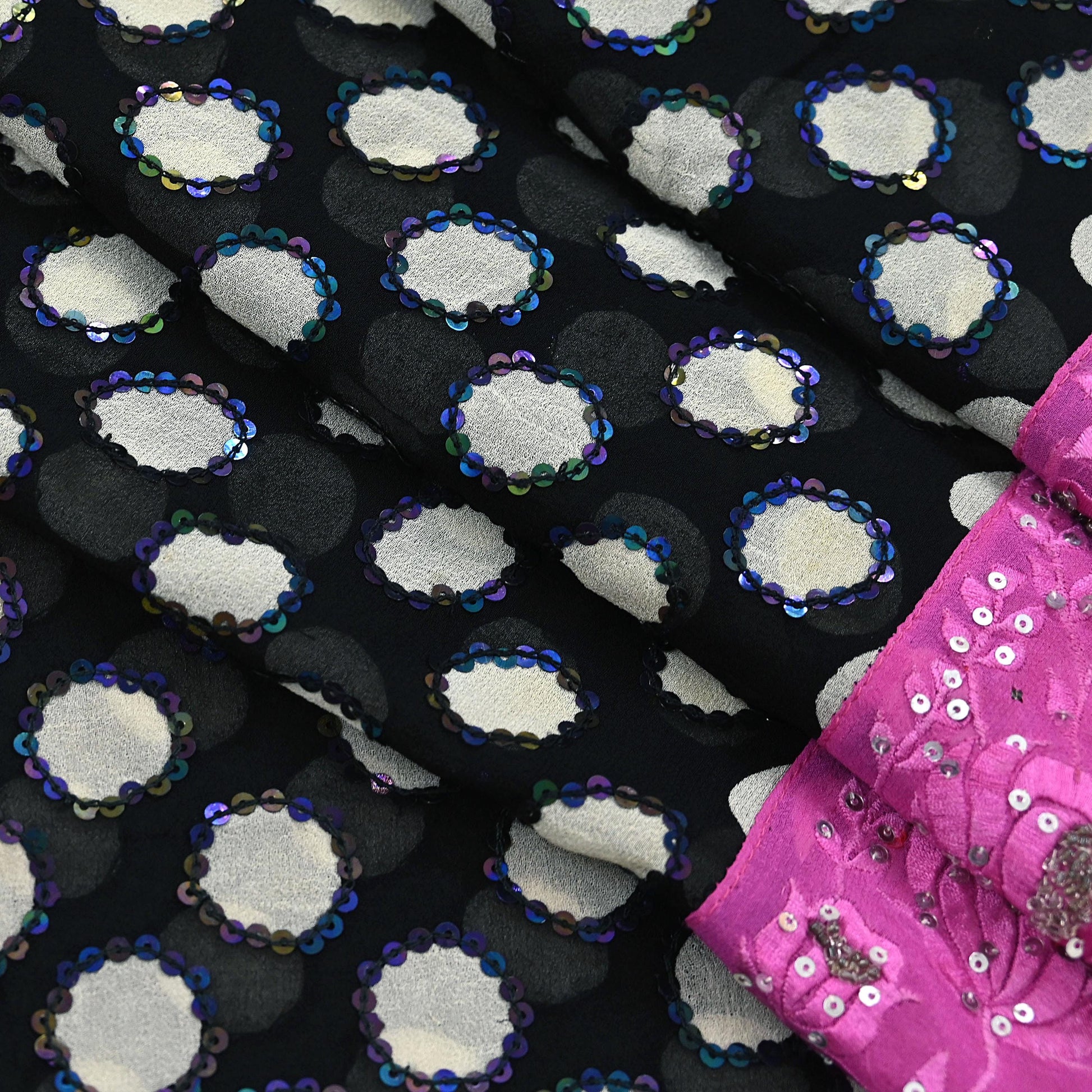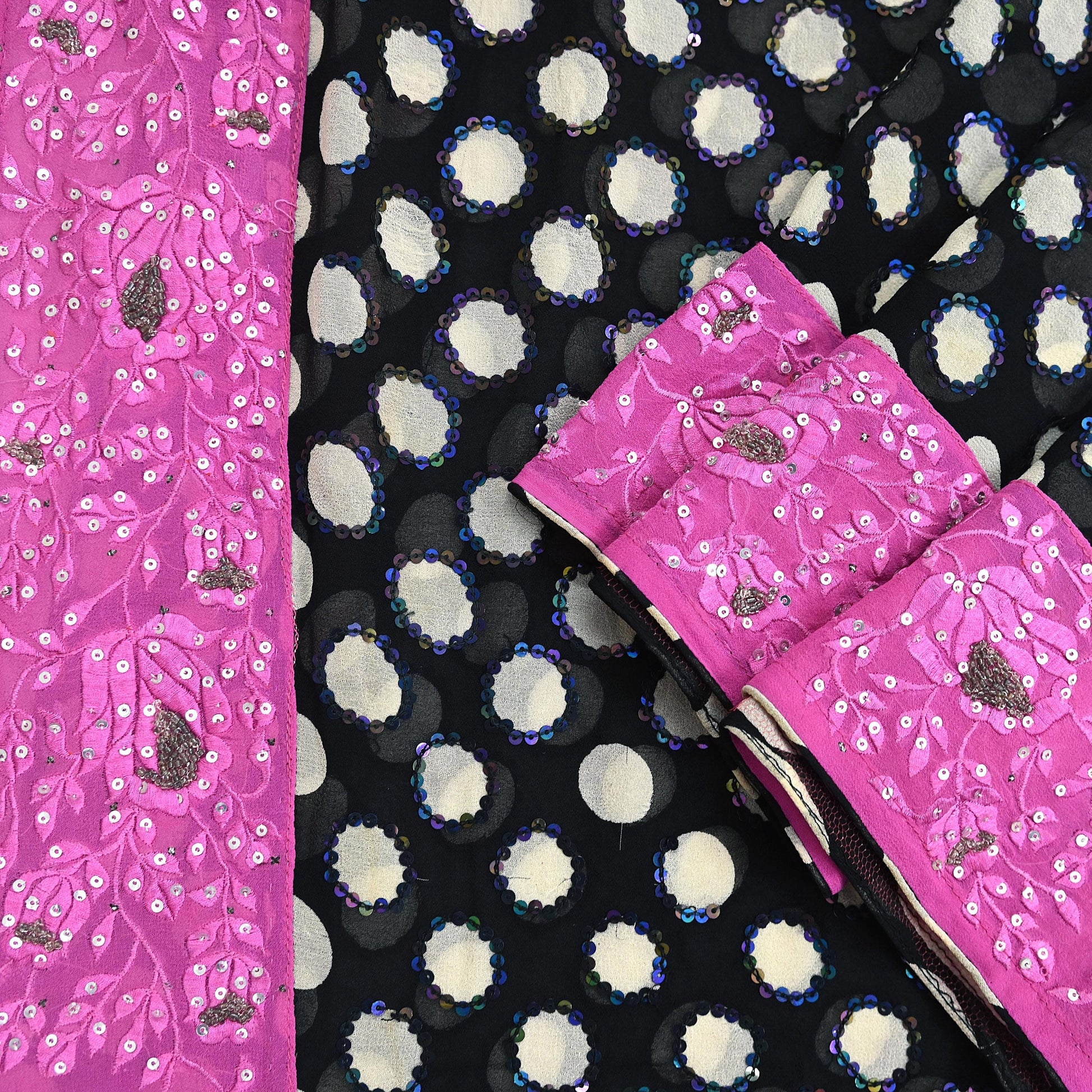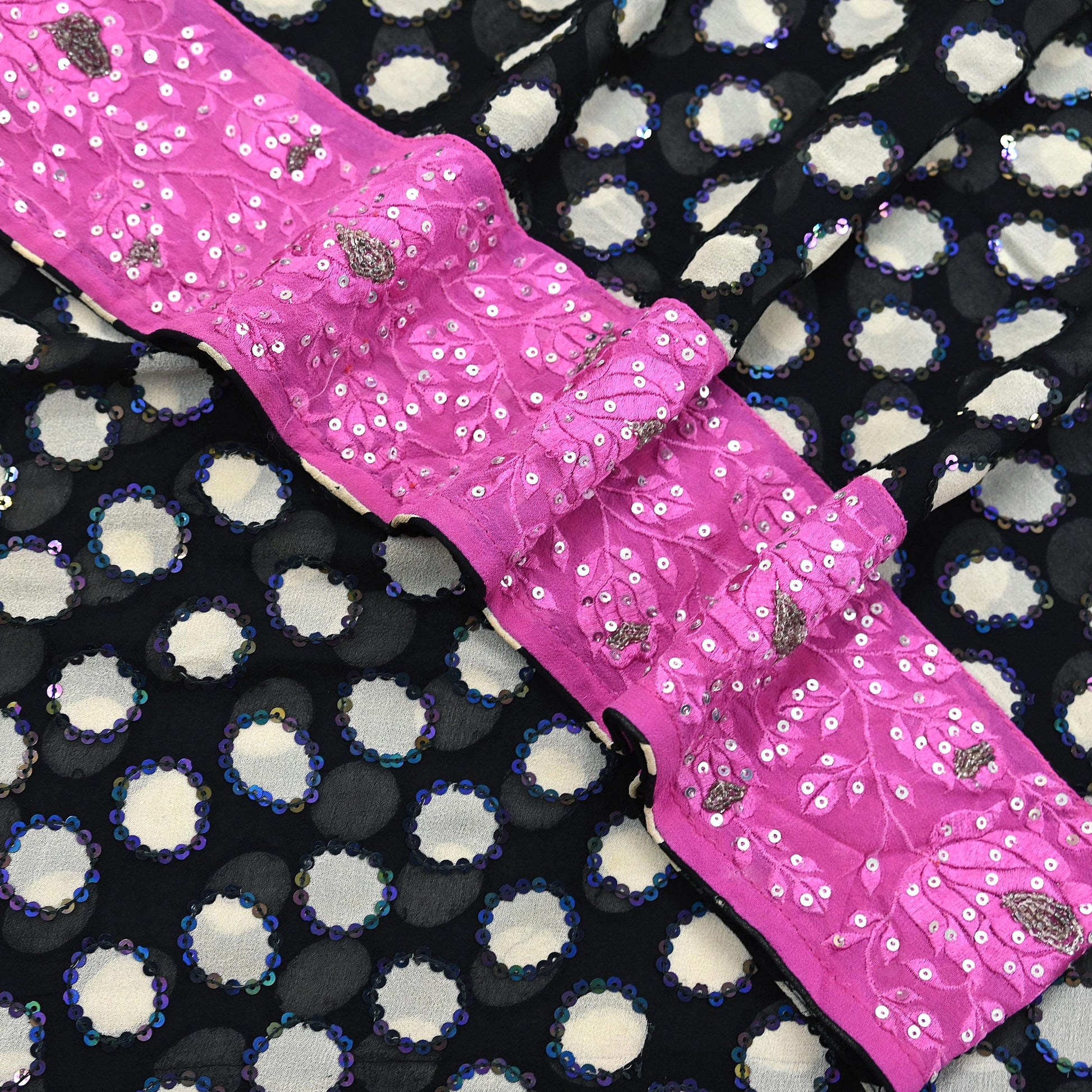Stunning Beautiful Look Dupatta Hand Embroidered Pure Georgette Silk Dupatta/Stole In Black Color Fabric. This one of a kind item is difficult to express in words. Border feature is Polka dot design embroidered silver & Blue Sequins, white Beaded/ Stones, Pink Thread work embellished work is the highlight of the dupatta. Also you can see similar work with floral pattern in center part adds to its beauty. Pink Pure Georgette silk border work is giving a fabulous look to the dupatta. Awesome one !!!