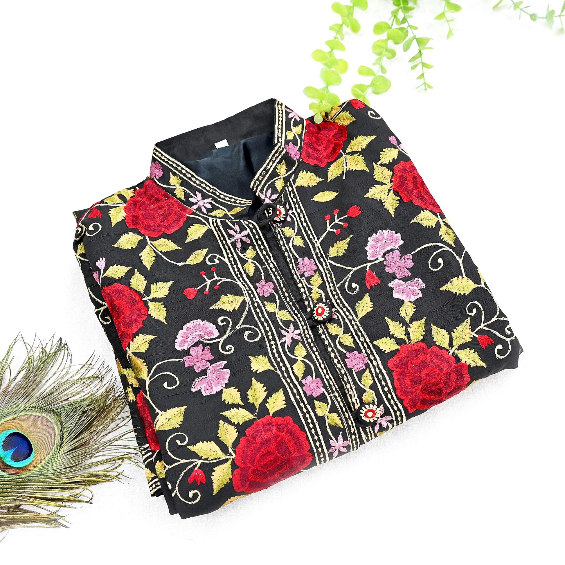 Stunning Embroidered Kashmiri Coat – Black Raw Silk Fabric