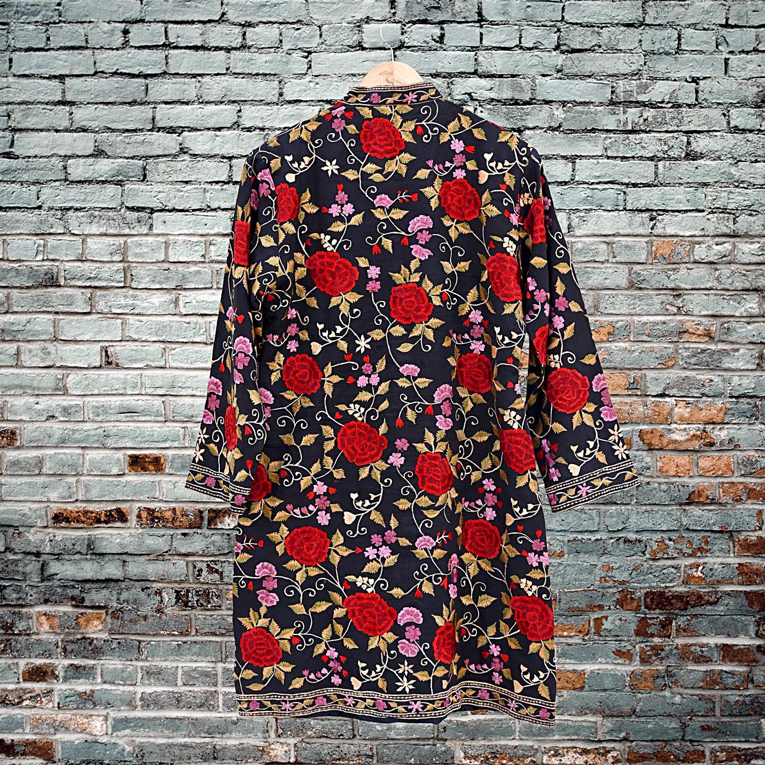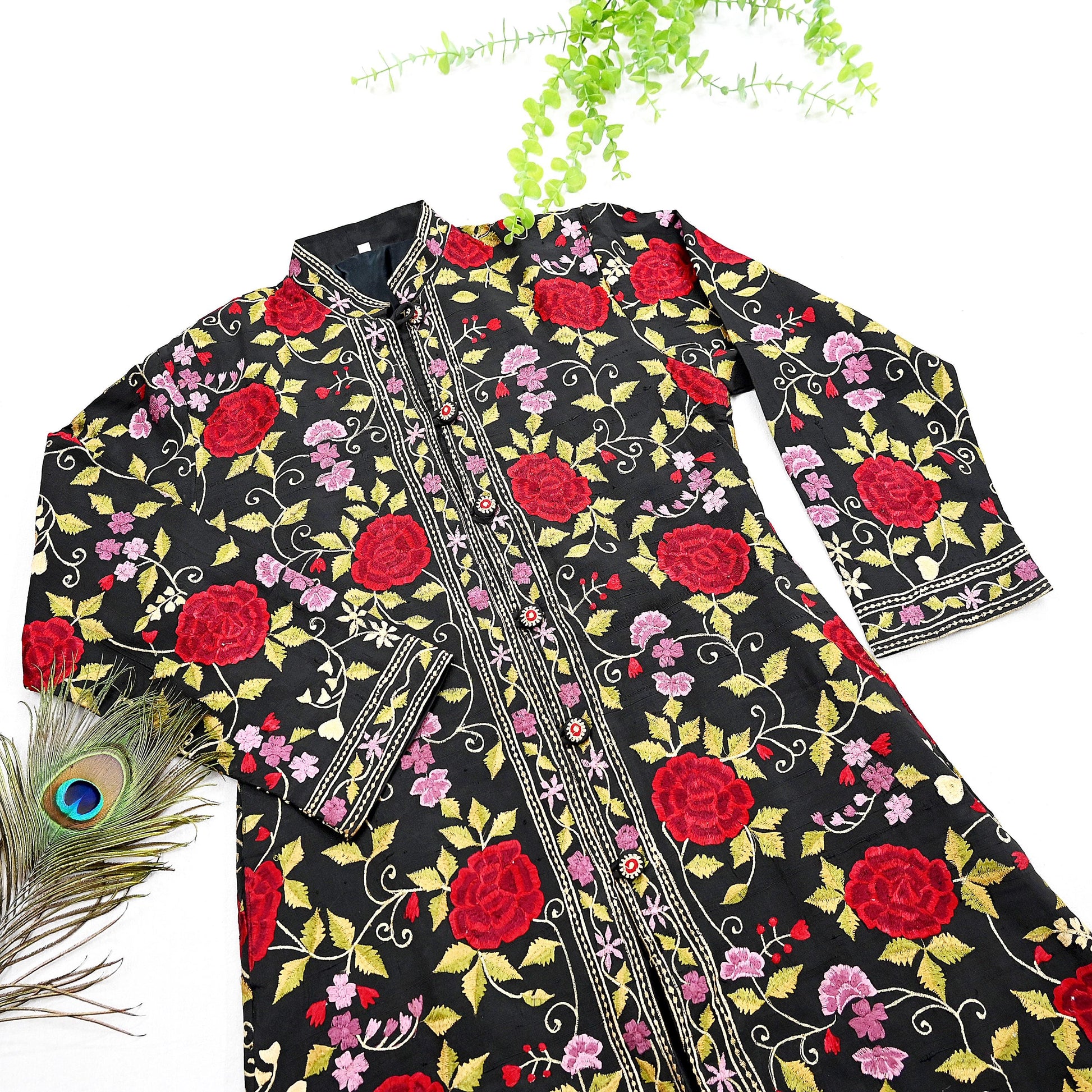 Indian Vintage Black Embroidered Kashmiri Coat, Aari Embroidery, Raw Silk Coat, Boho Jacket For Both Women/Men Indian Coat
