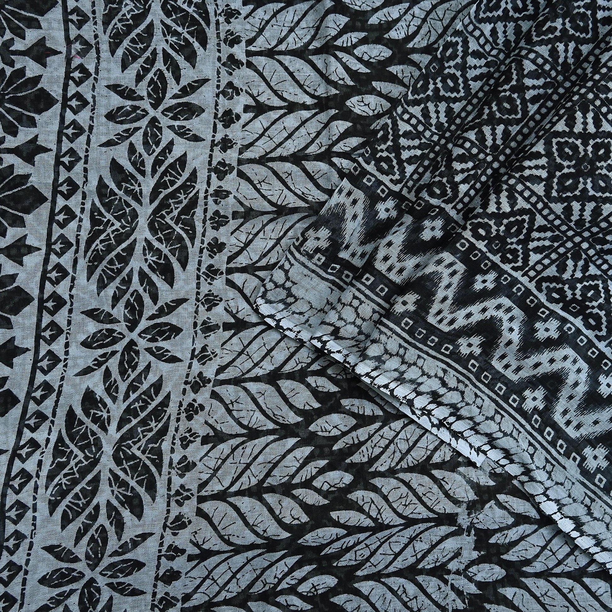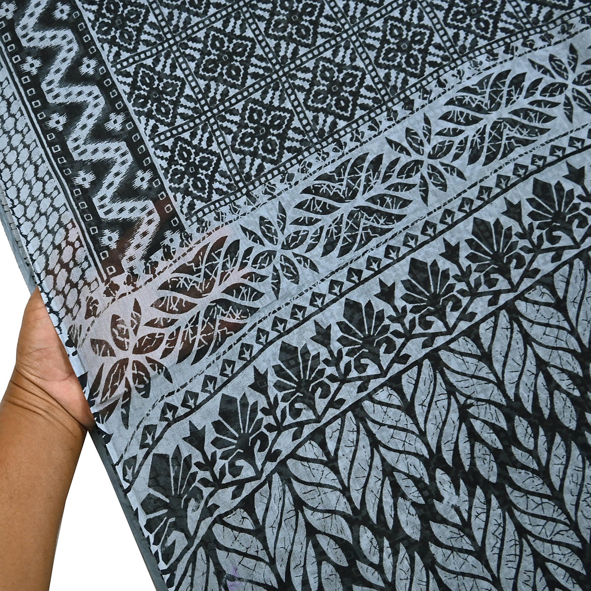 Nice Floral Design With Batik Printed Work On Black & Gray Color Base Fabric Is Really Enhancing The Beauty Of The Saree.