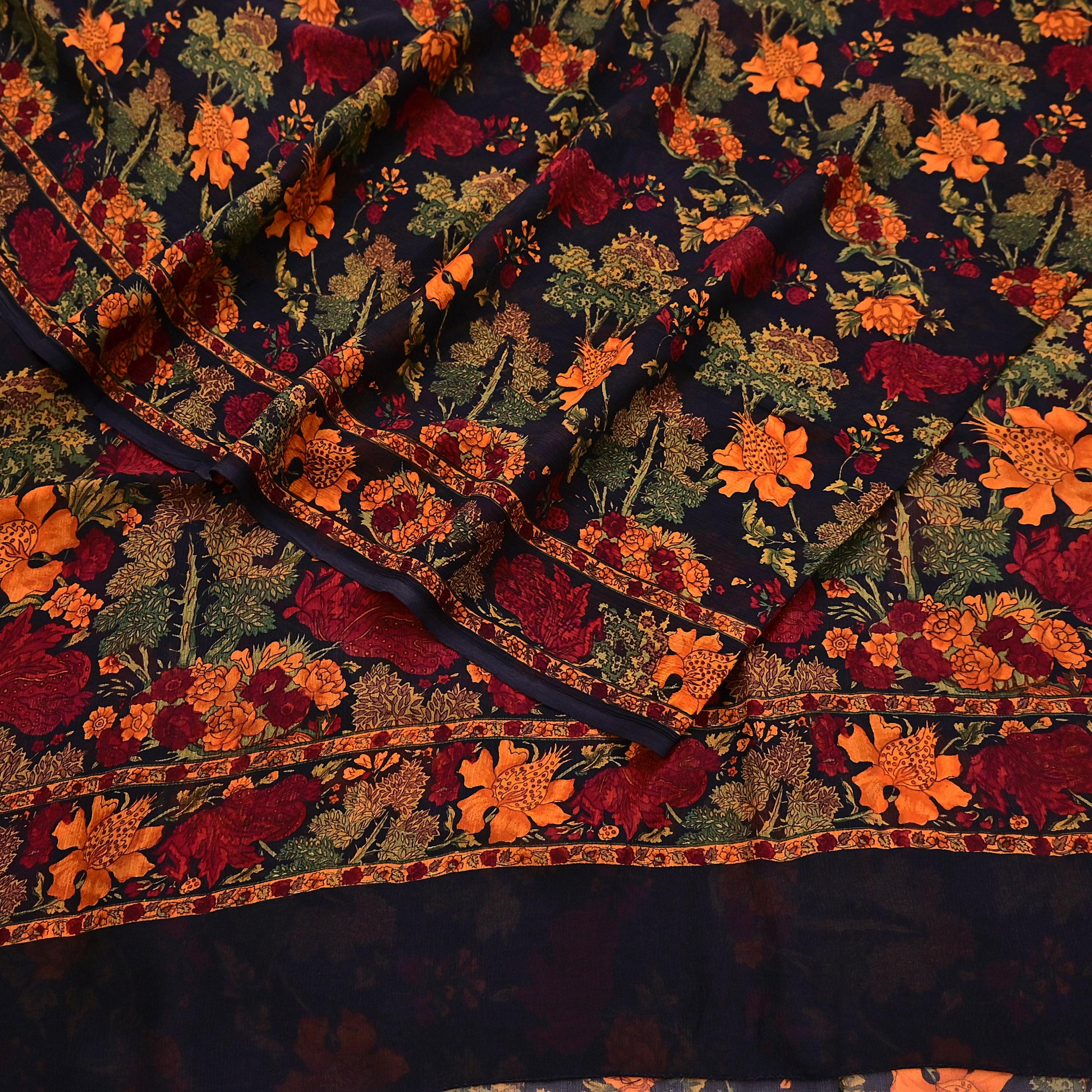 Indian Vintage Black Pure Chiffon Silk Saree Printed Floral Design 5 Yards Sheer Soft Fabric for Sewing, Dressmaking,