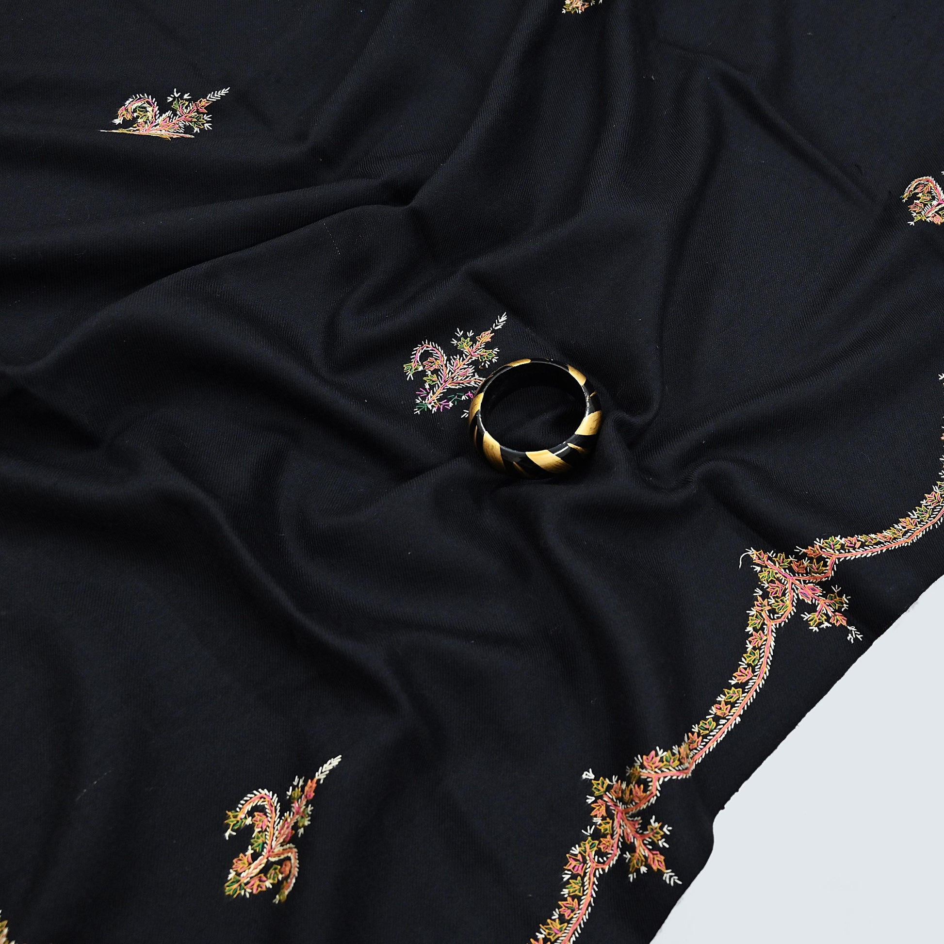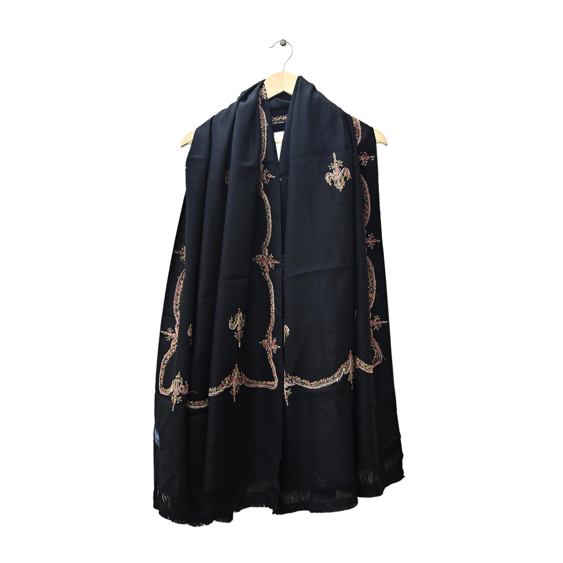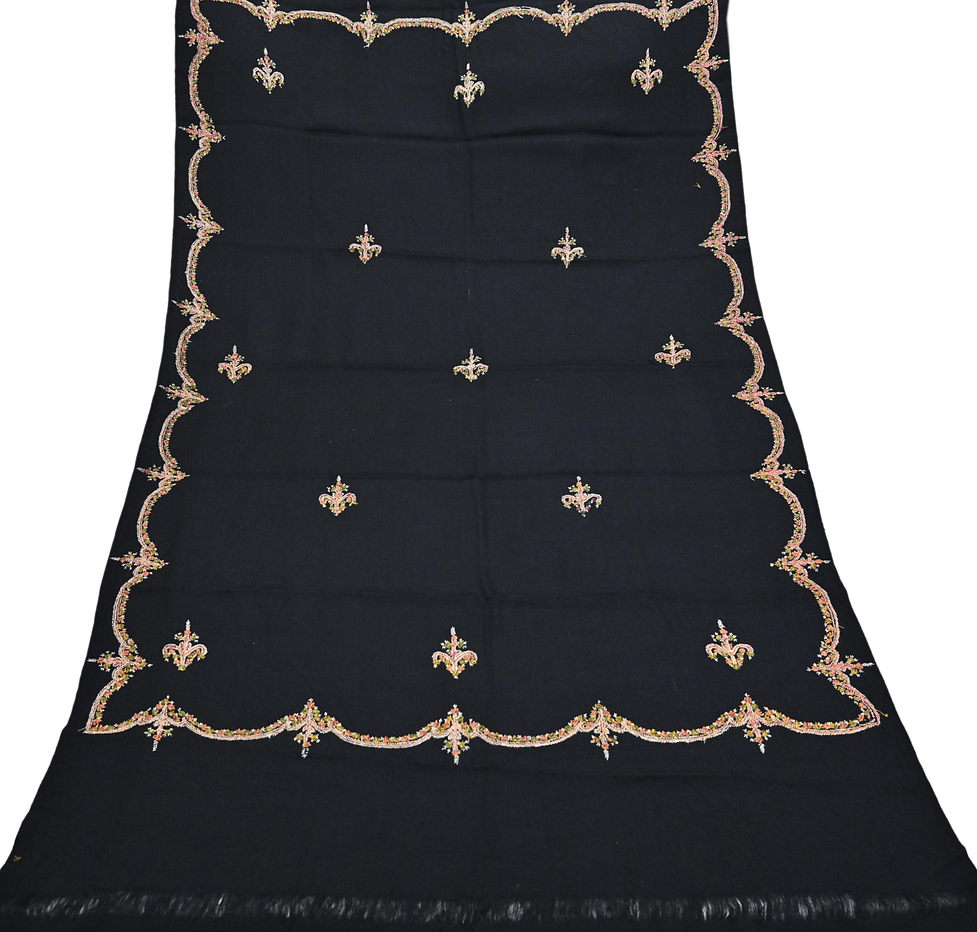 Indian Vintage Black Shawl Pure Woolen Handmade Suzani Long Throw Stole Warm Floral Design Soft Cozy