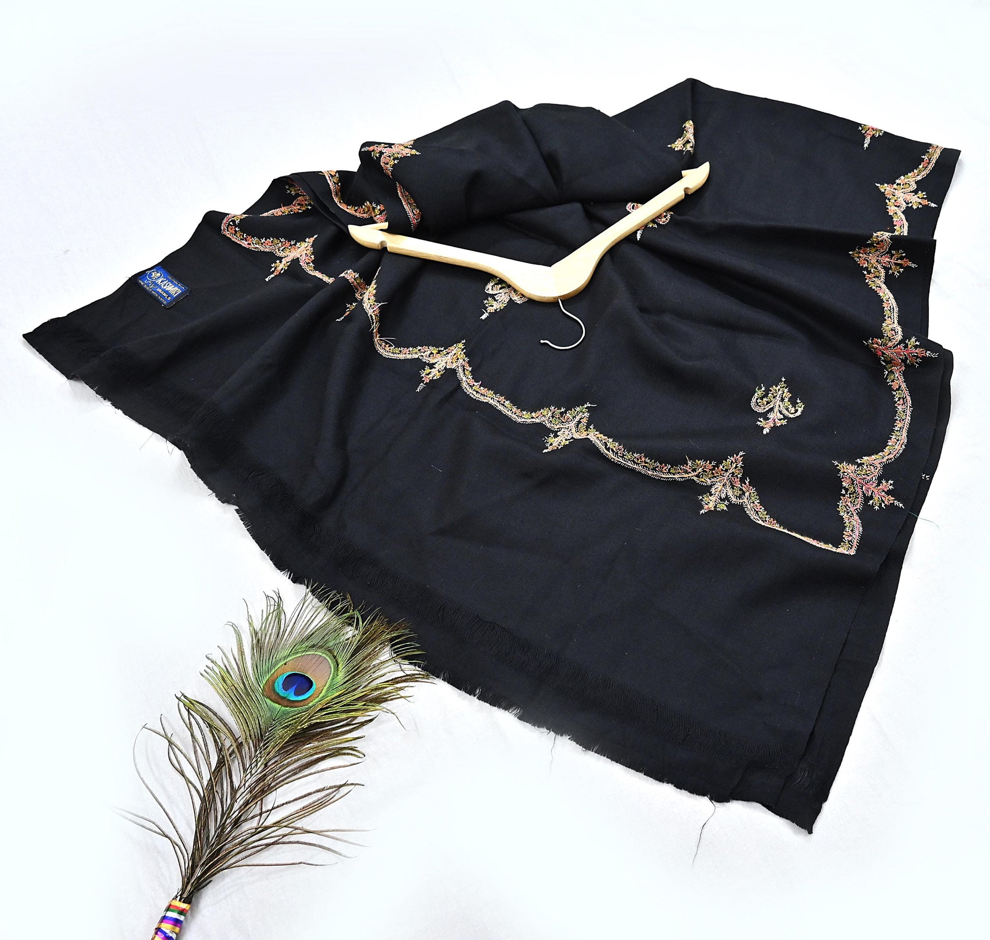 We Are Offering You A Vintage Black Color 100% Pure Woolen Stole/Shawl Which Adorns Hand Embroidered Suzani & Woven Work. Center part & Border of this shawl has traditional handmade Suzani embroidery with floral & paisley pattern. This cozy, warm and fuzzy stool is soft against skin due to the mellow woolen fabric.