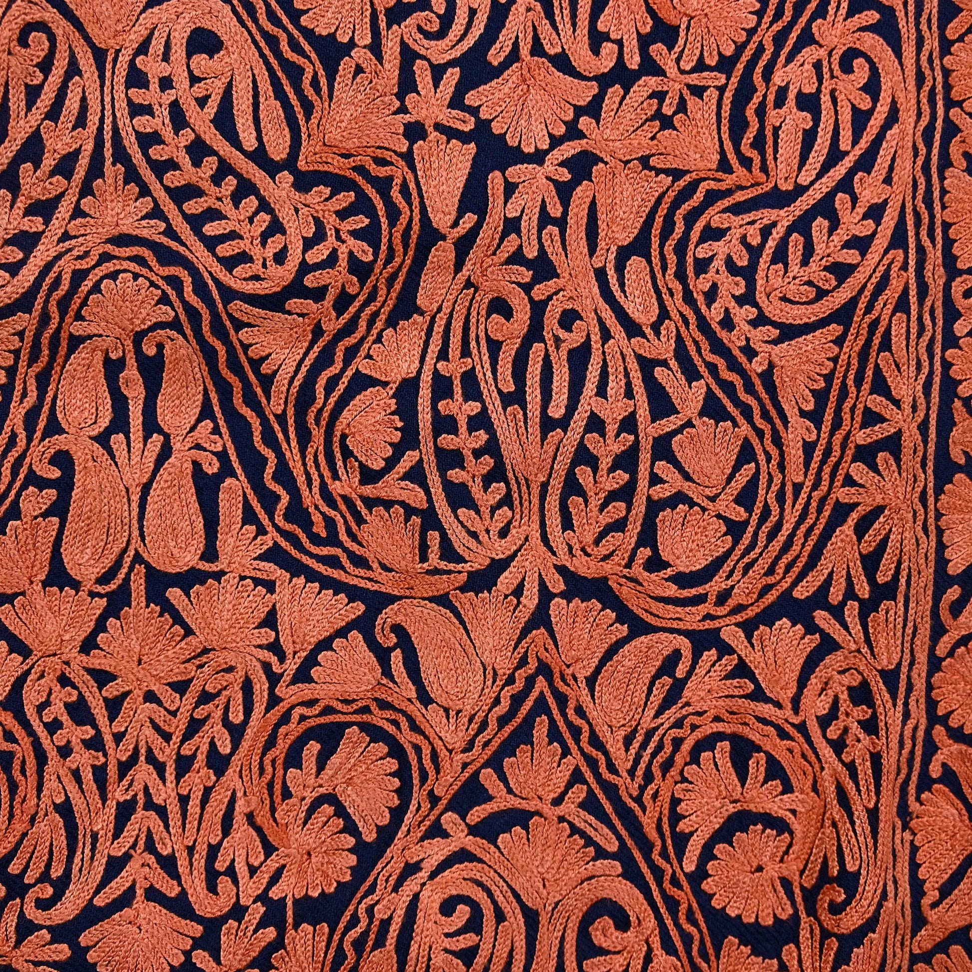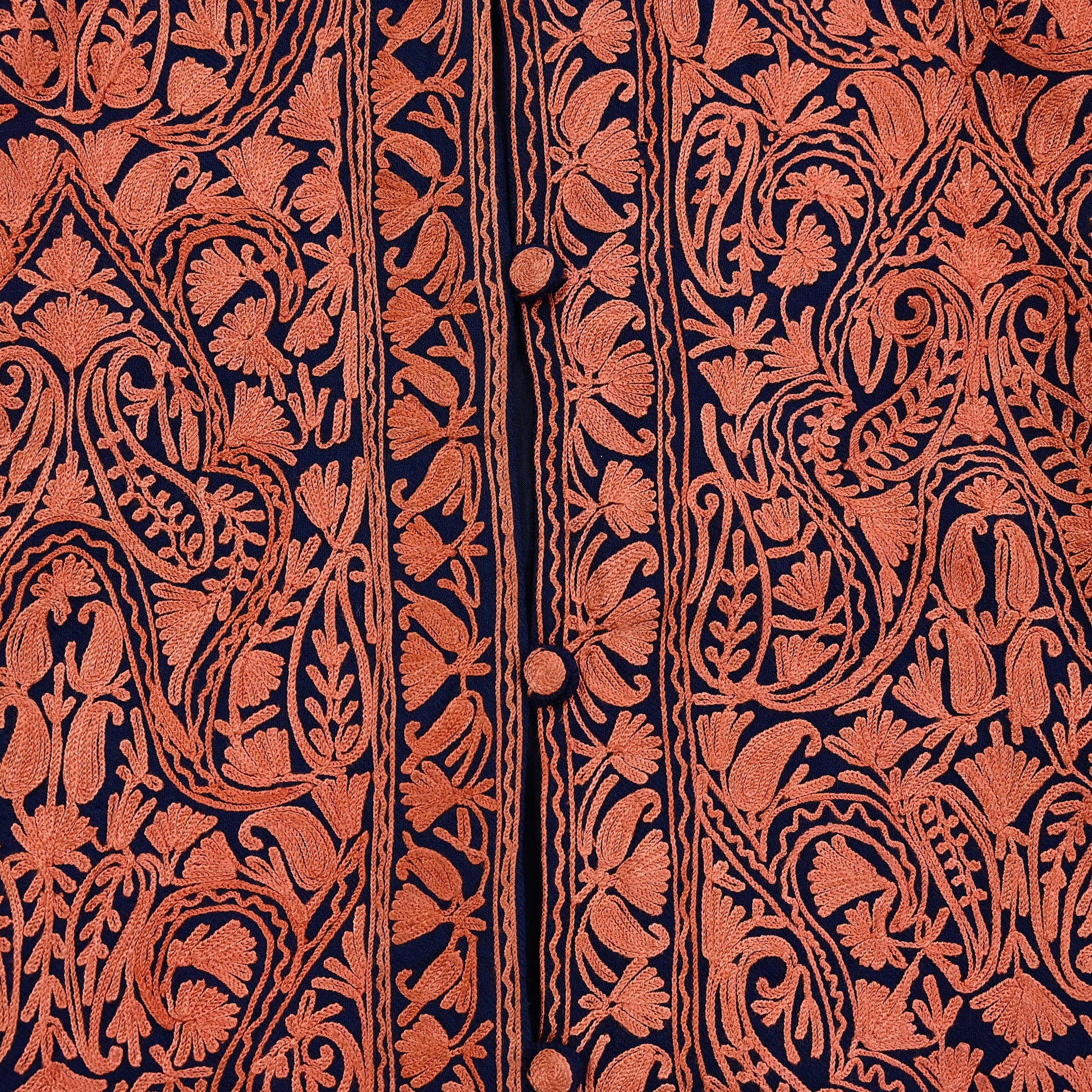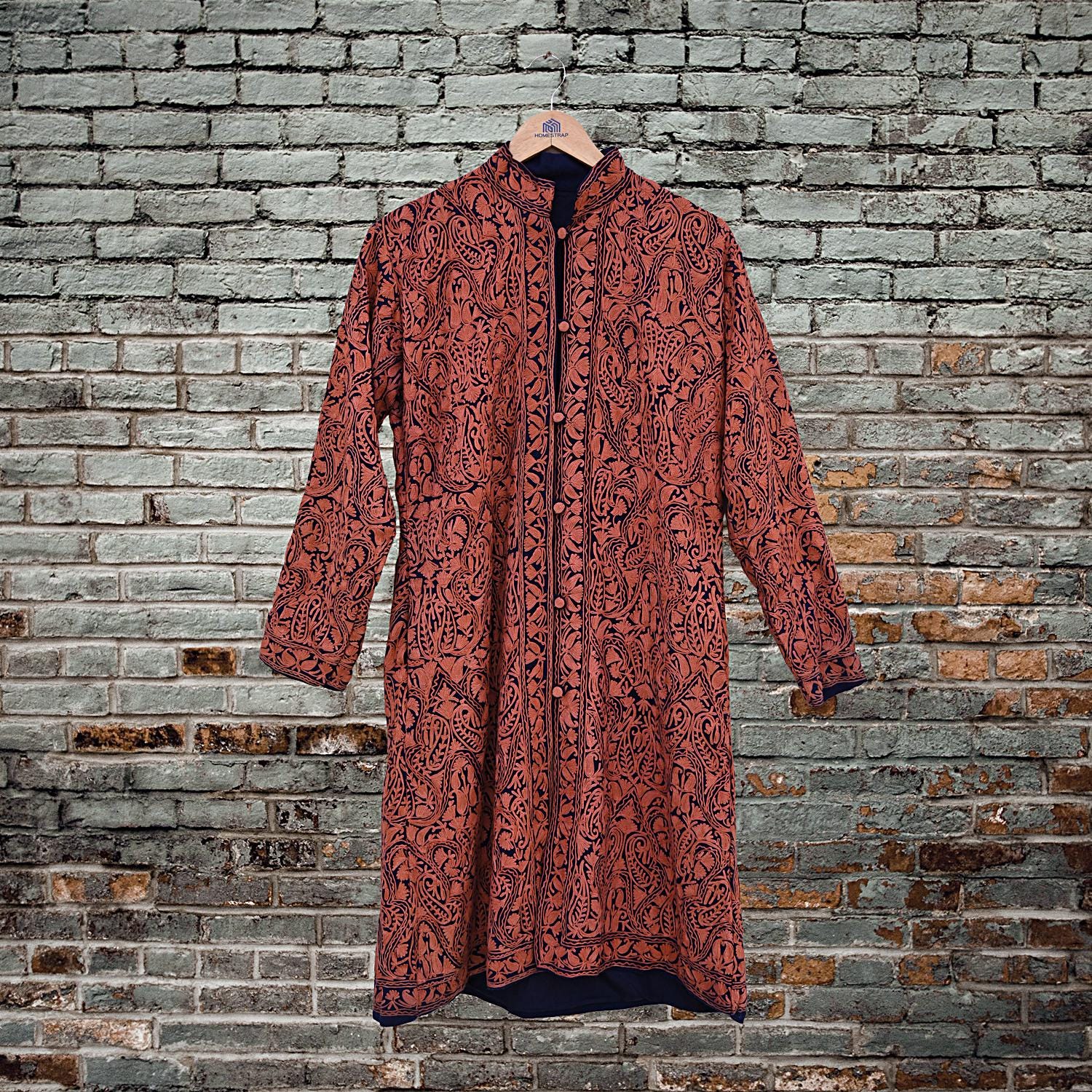 This one-of-a-kind Kashmiri coat is truly a masterpiece, beautifully handcrafted in pure wool. The Orange thread embroidery stands out as the highlight of the piece, featuring an elegant floral pattern at the center that adds to its timeless charm. The detailed button work and functional side pockets enhance both its elegance and practicality, making it a perfect blend of comfort and classic Kashmiri craftsmanship.