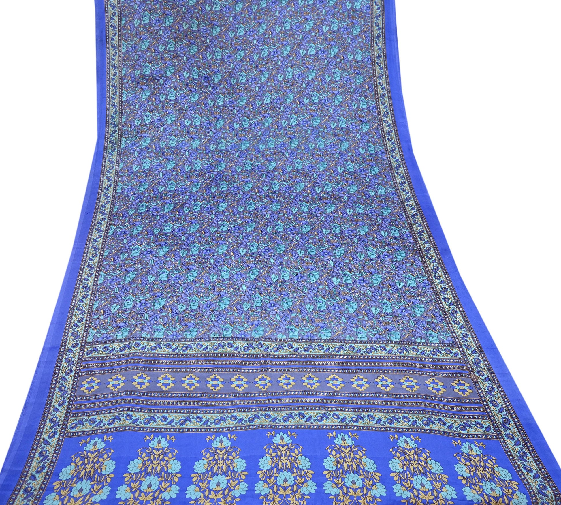 Indian Vintage Blue & Gray Artificial Silk Saree Printed Sari 5 Yards Soft Craft Fabric for Sewing, Dressmaking, Quilting,Upcycling