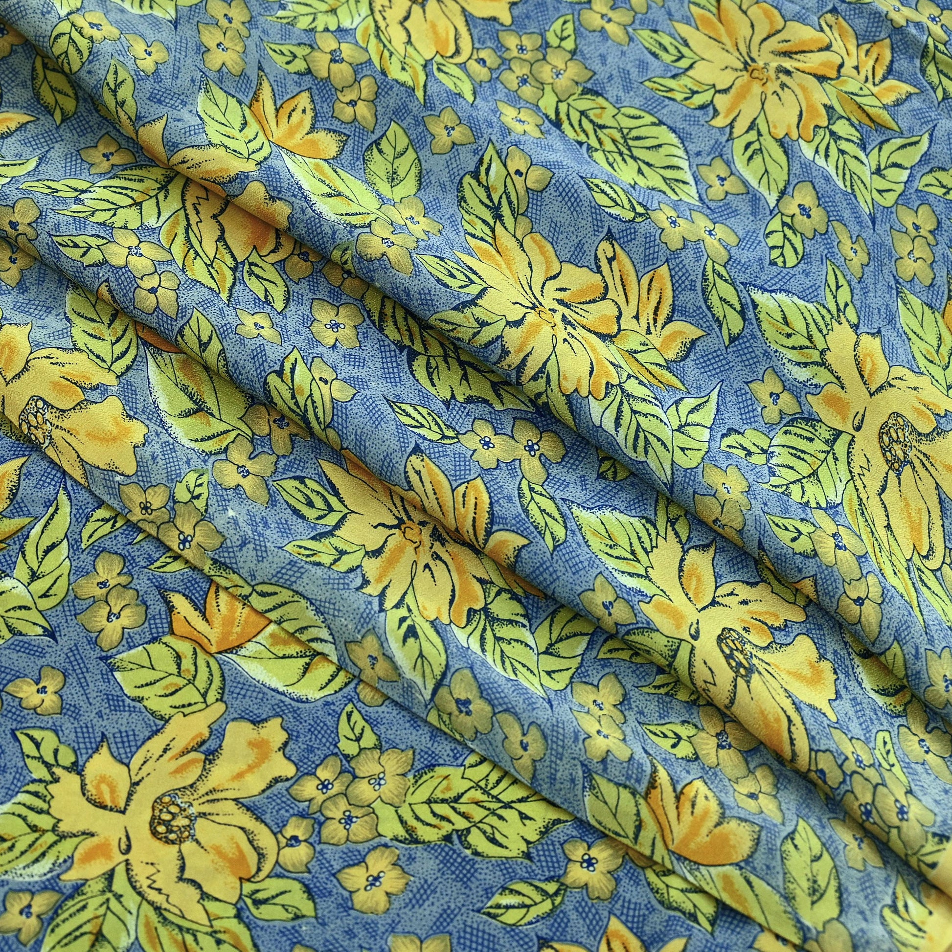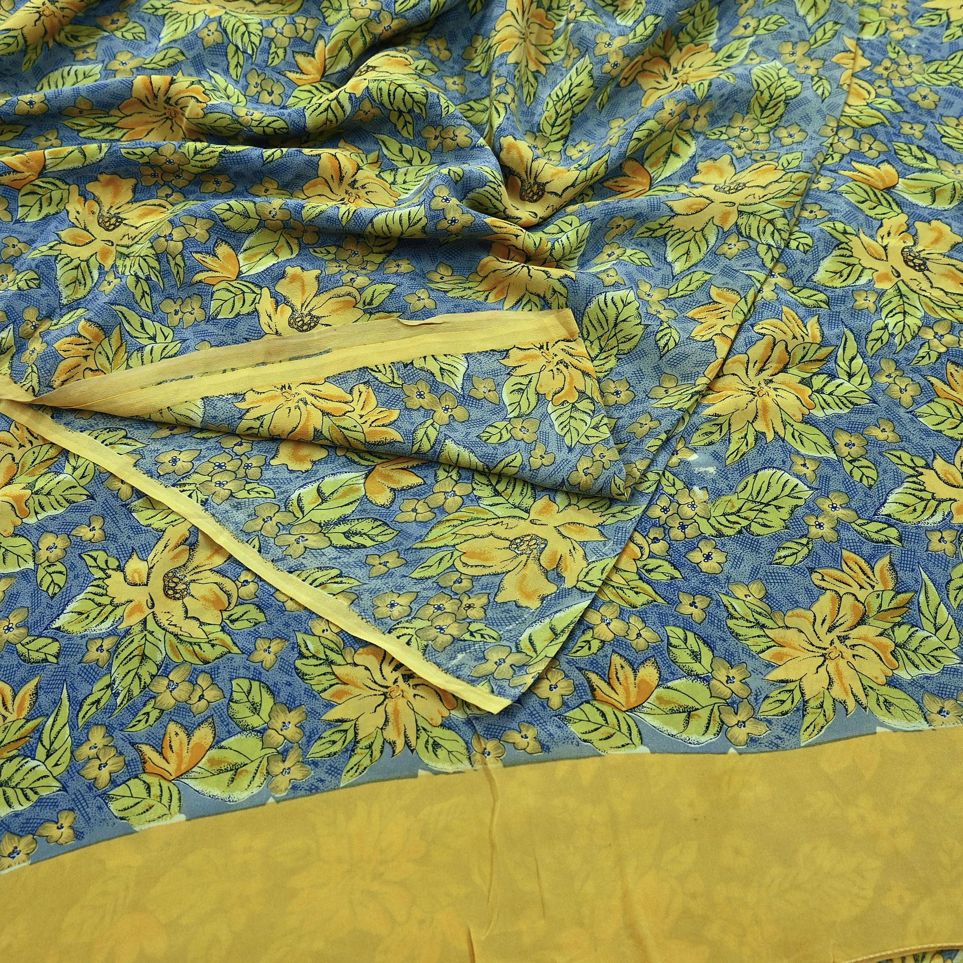 The rich Blue & yellow base enhances the vibrancy of the printed motifs, making it a standout fabric for dressmaking, wrap skirts, scarves, or home décor accents such as cushion covers or table runners. The soft, fluid drape of pure crepe silk offers ease of handling and a luxurious finish.