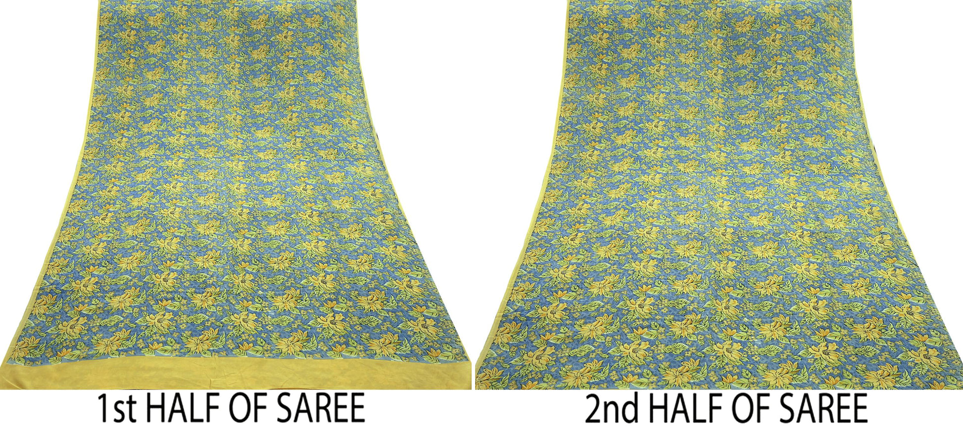 This attractive Blue & yellow vintage saree is crafted from 100% pure crepe silk and features an elegant all-over floral print. The floral design extends across the body of the saree, with a beautifully detailed pattern in the center, making it a timeless piece for both traditional wear and repurposed creations.