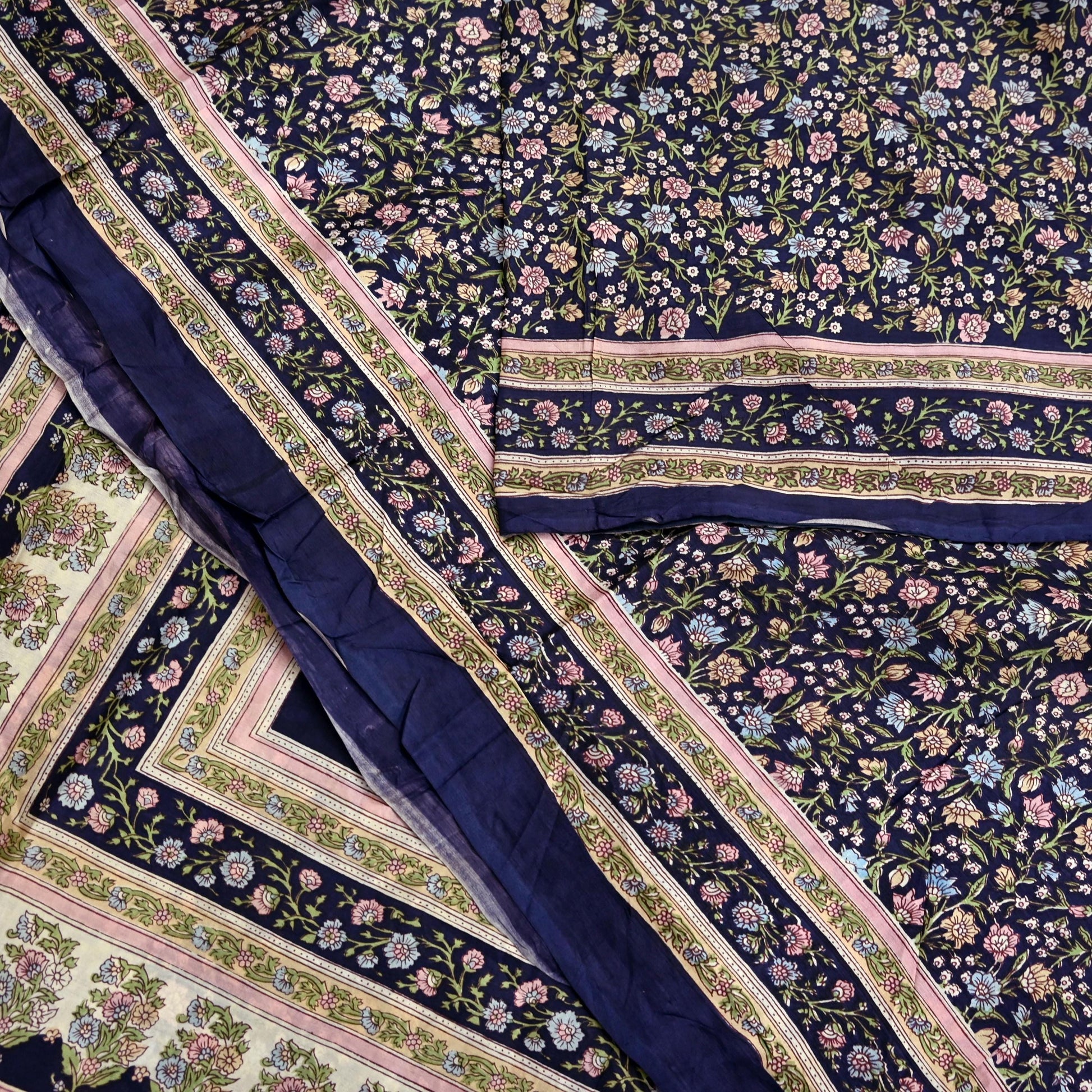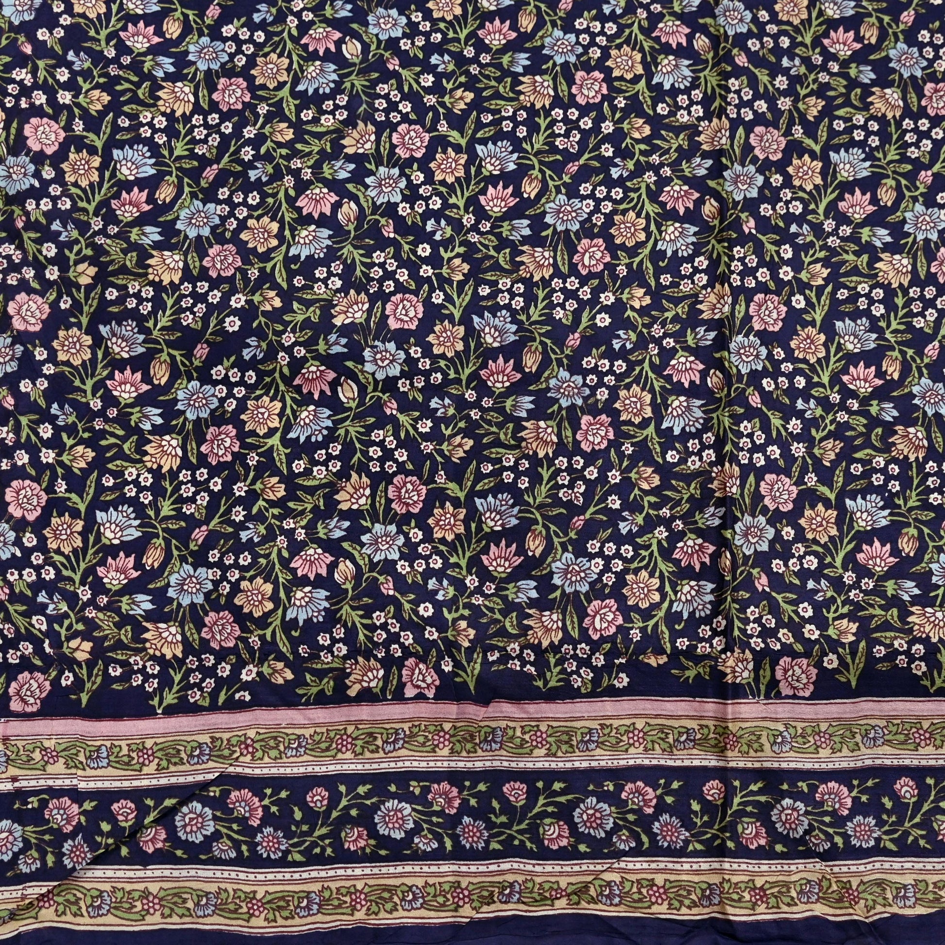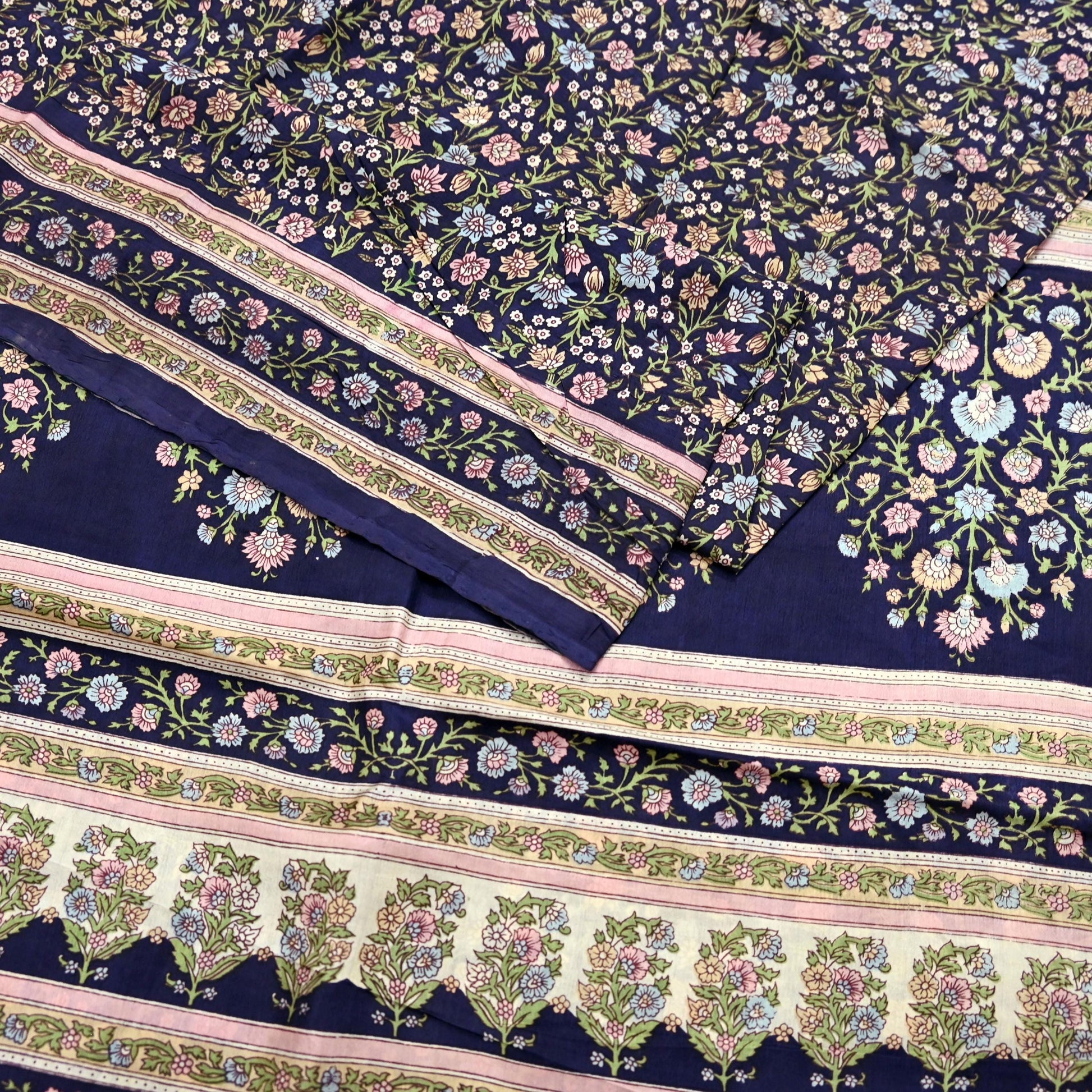 This attractive vintage saree, crafted from 100% pure silk, features a graceful Blue base beautifully contrasted by Multi floral printed motifs. Lightweight and soft with an elegant drape, it’s ideal for both traditional wear and creative projects.