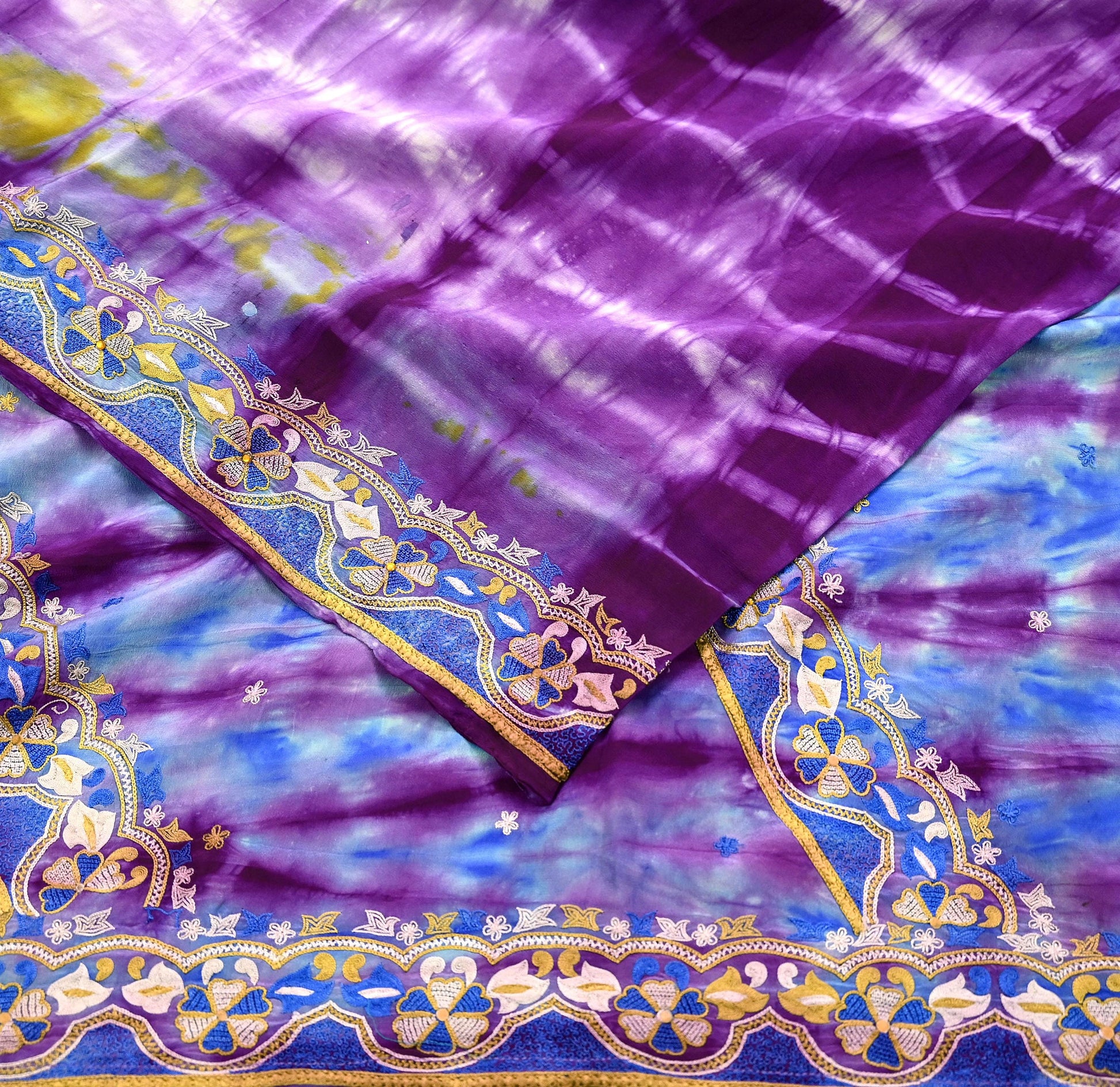 Indian Vintage Blue & Purple Saree Pure Crepe Silk Hand Embroidered Tie-Dye Sari Fabric 5yard Craft Ethnic Zardozi