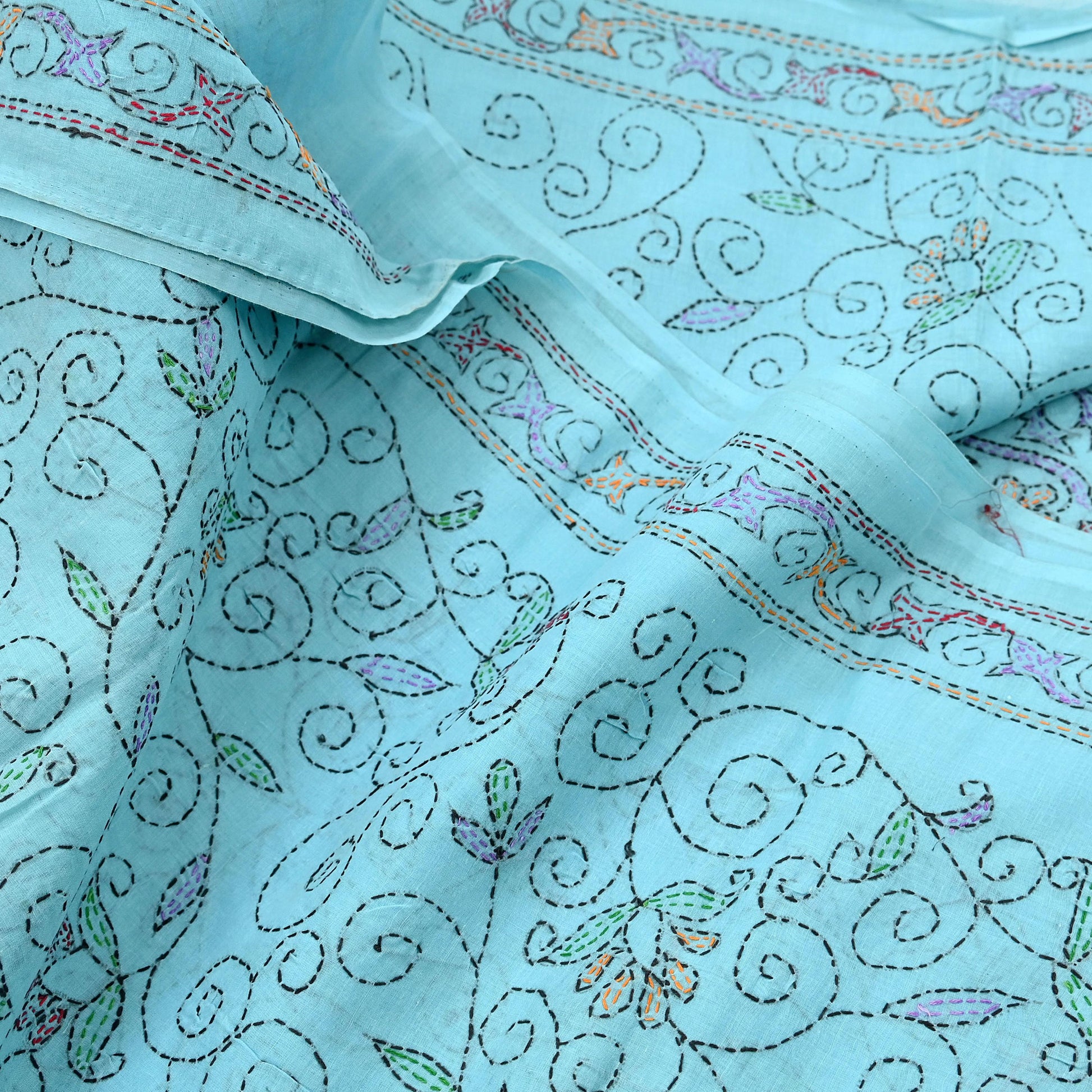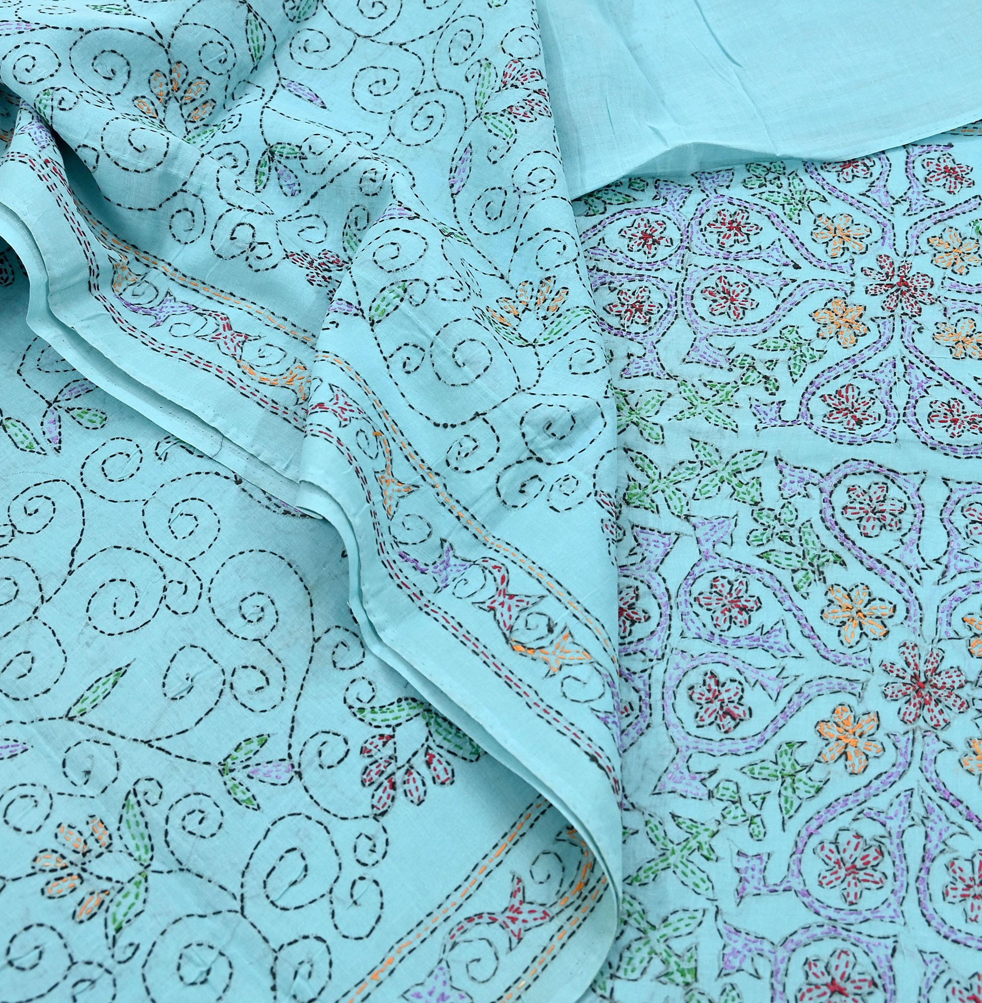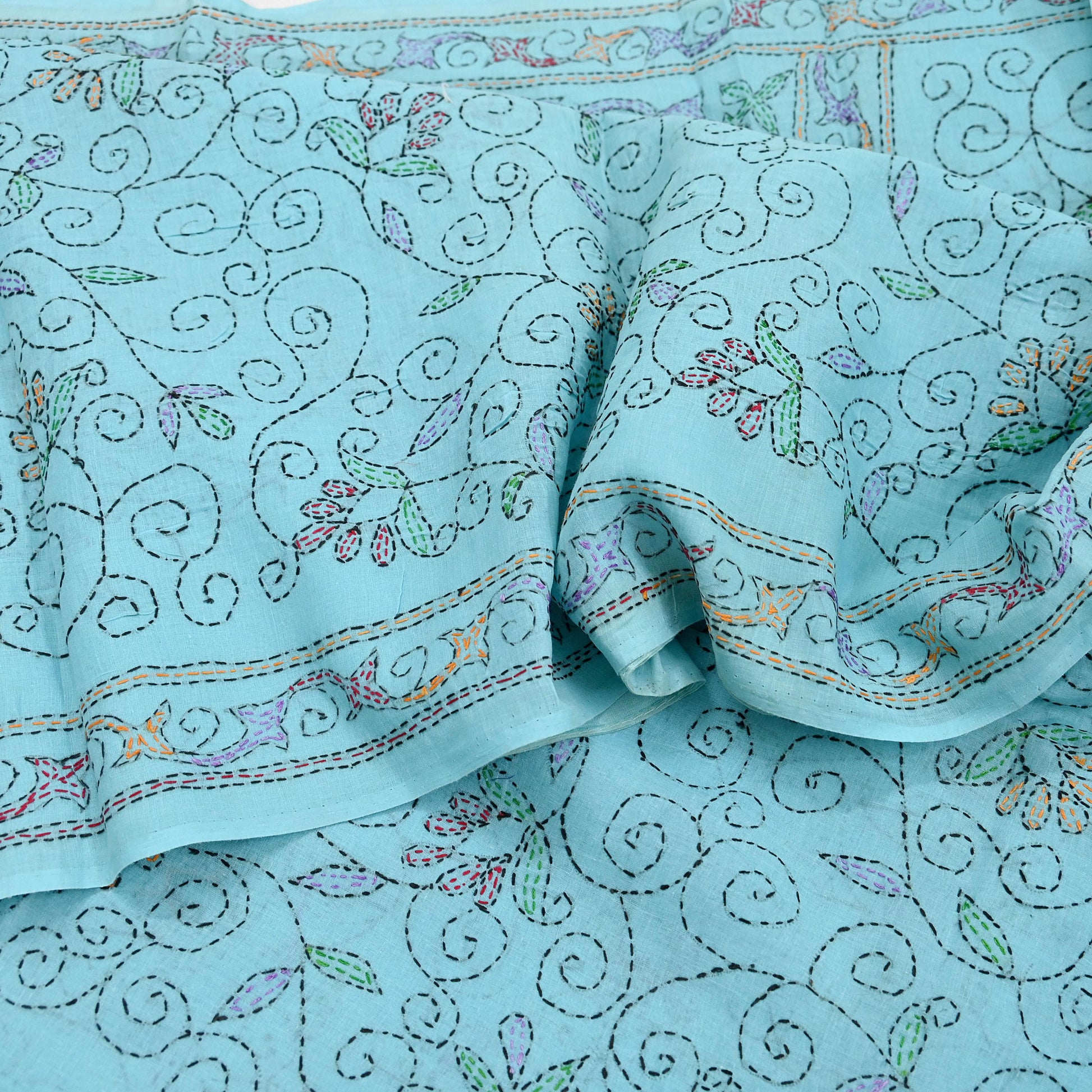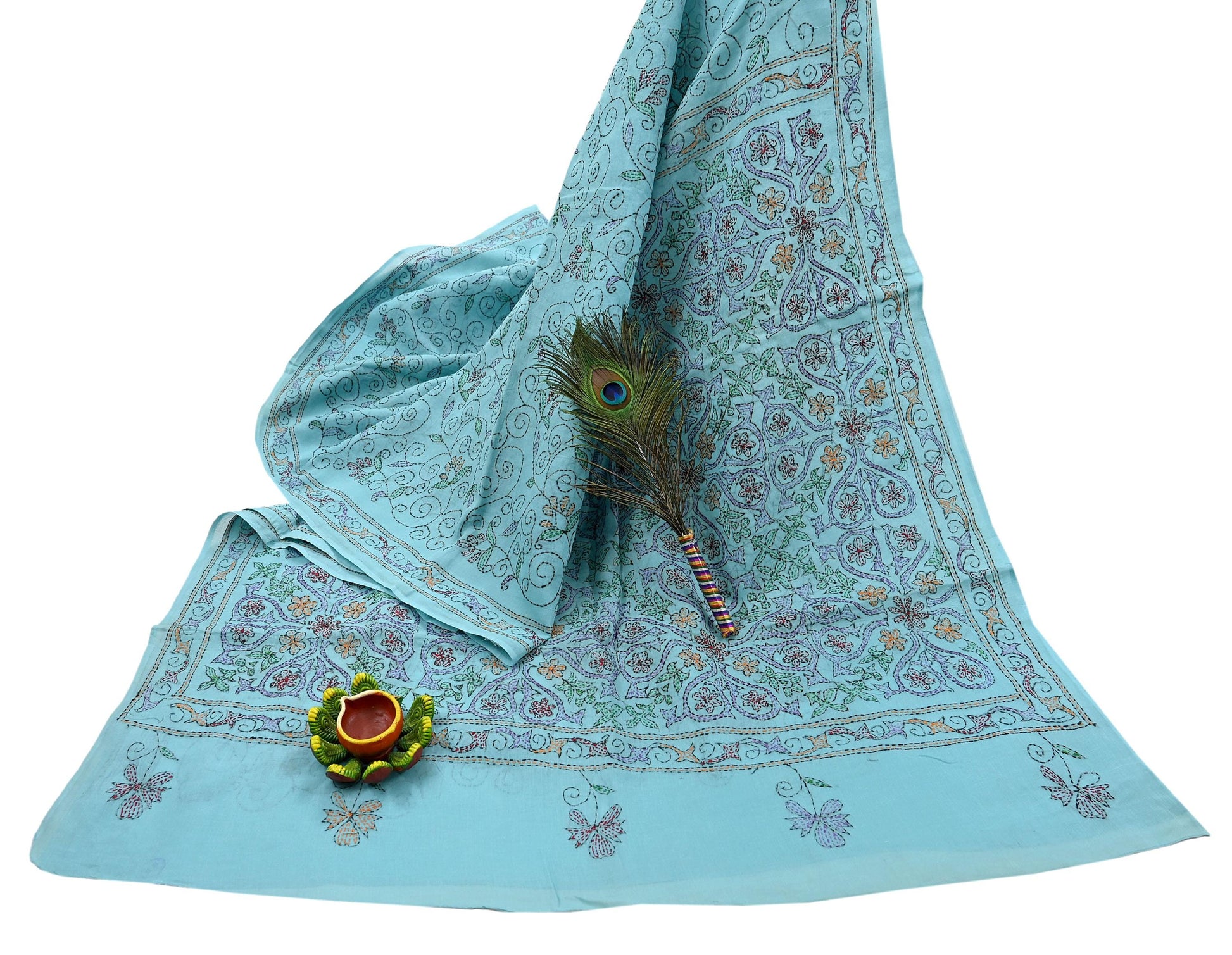 *Attractive Blue Colored Hand Embroidered Kantha Cotton Saree.