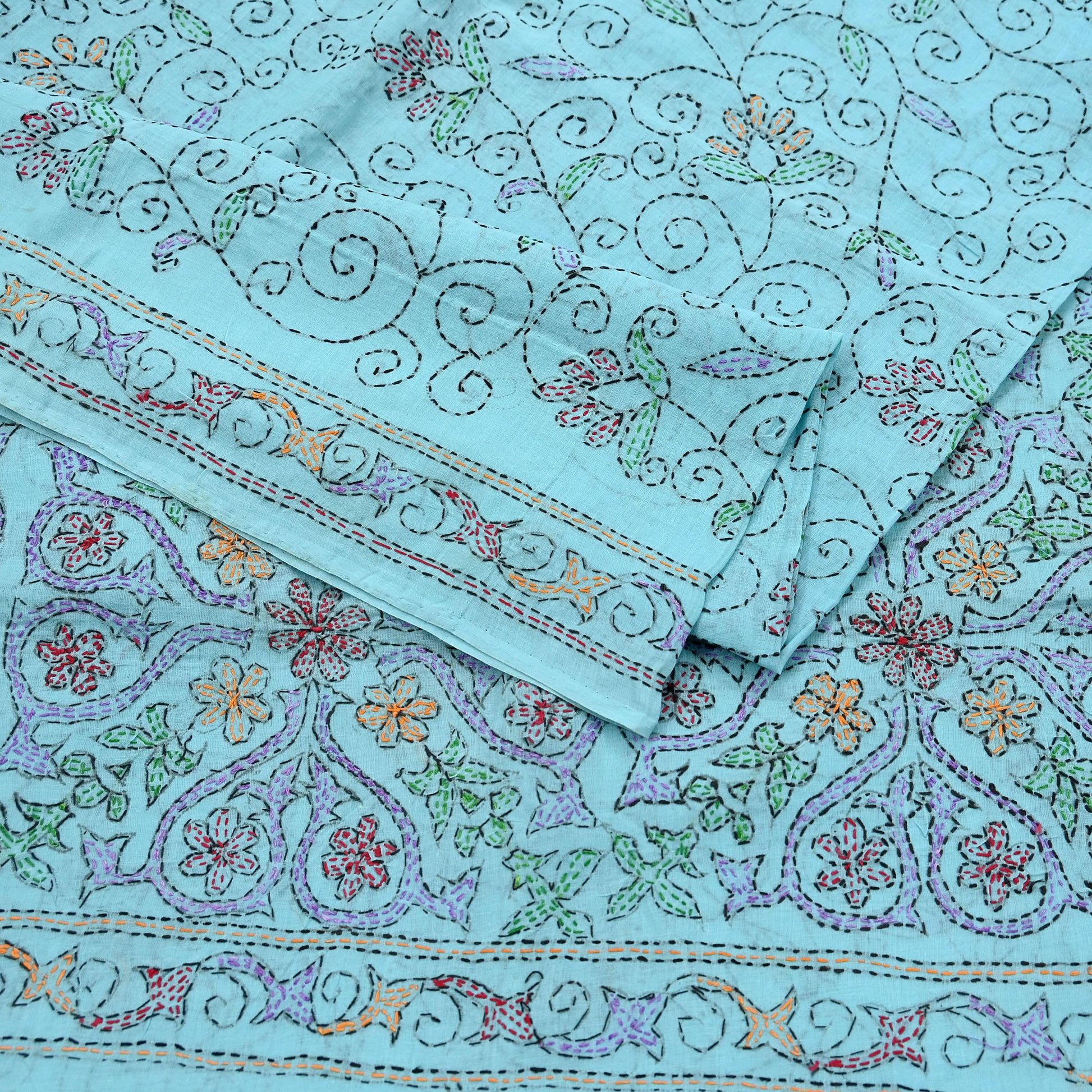 Indian Vintage Blue Saree Cotton Hand Embroidered Kantha Sari Craft Fabric 5yard Sewing Floral Soft Dressmaking Crafting Quilting upcycle