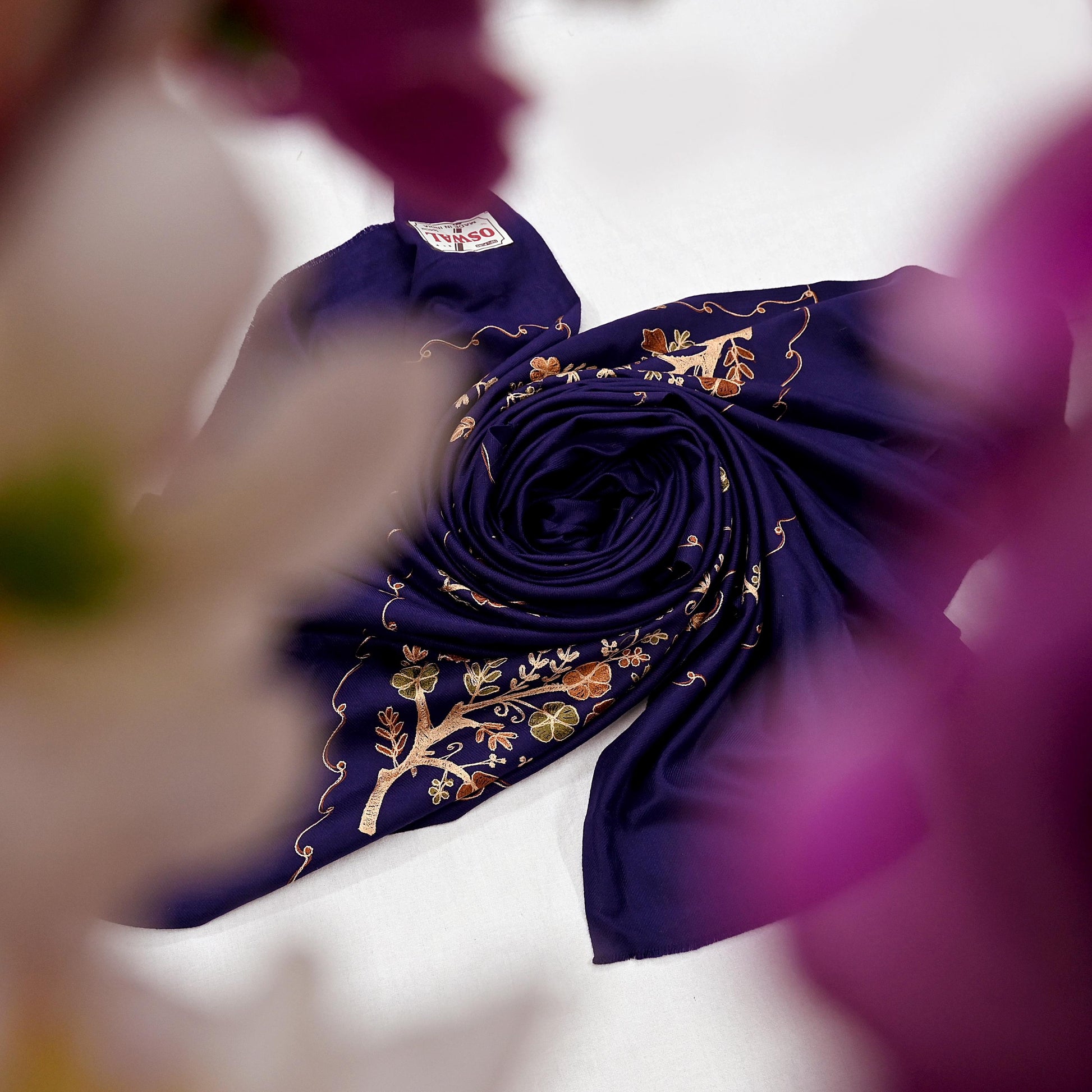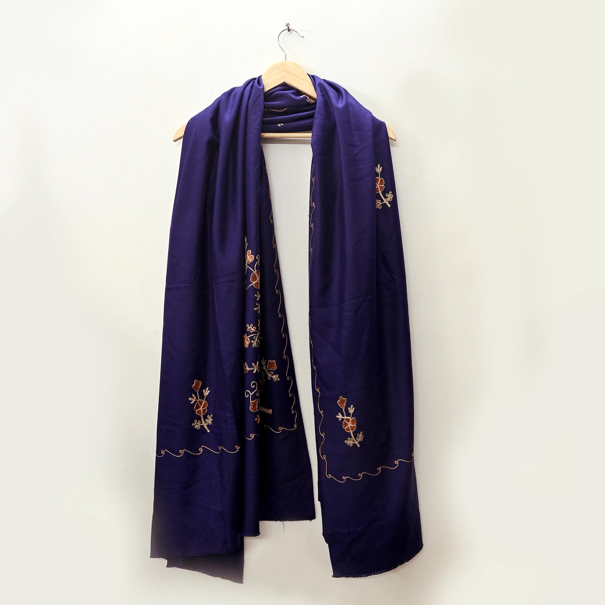 We Are Offering You A Vintage Blue Color Woolen Stole/Shawl Which Adorns Hand Embroidered Ari Work. Shawl has handmade Traditional Ari work design with floral design. Shawl has matching fringes on both ends of borders. This cozy, warm and fuzzy stool is soft against skin due to the mellow woolen fabric. A truly gorgeous piece which will also make an admirable gift. ARI WORK:Aari embroidery or crewel work is a specialty of artisans from Kashmir (North India).The craft of Aari embroidery has existed in India from the 12th century and was patronized by the Mughals. Its main features are the fine, concentric rings of chain stitch using a long hooked needle known as a crewel or Aari Needle. In this technique The thread is held below the cloth to be embroidered and the point of the ari is pushed through the fabric to pick up and pull through to the surface a loop of thread. The point of the aari is then again inserted into the fabric through this loop and the process is repeated, so that a continuous line of chain stitch begins to be formed.