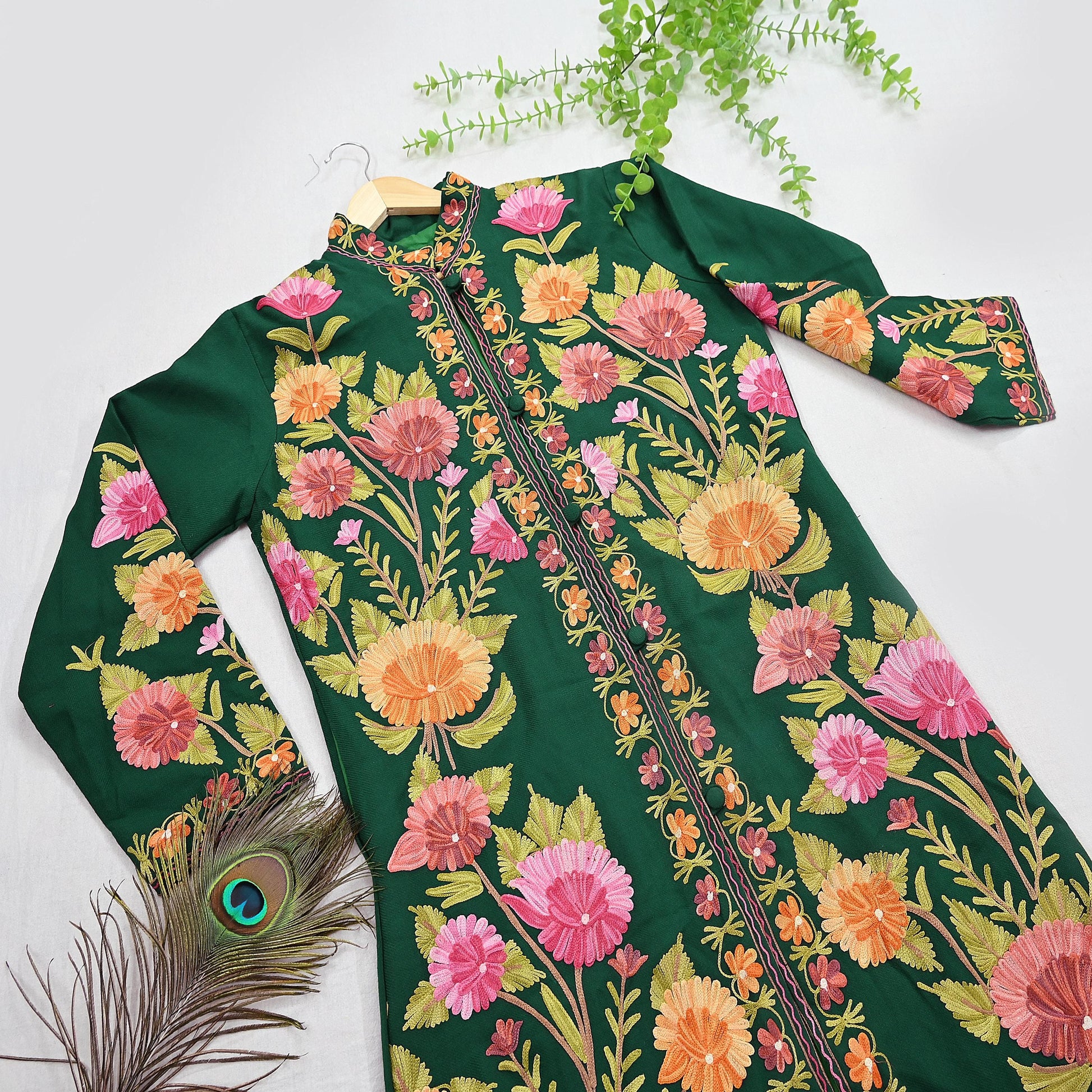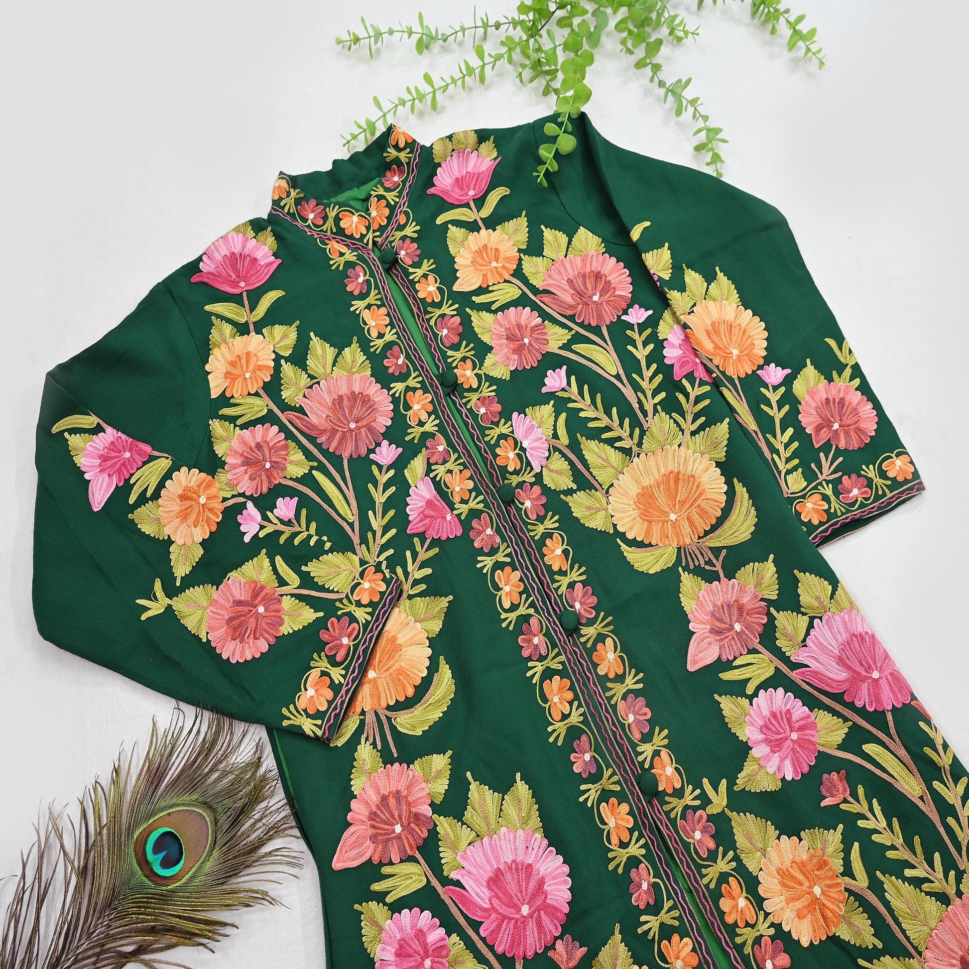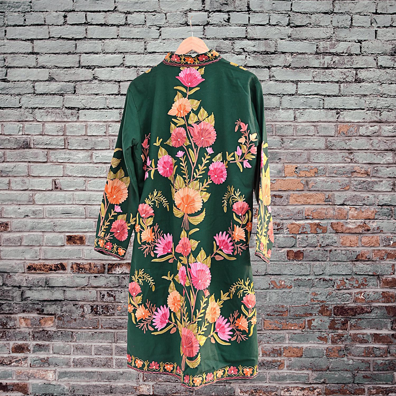 Indian Vintage Bottle Green Embroidered Kashmiri Coat, Aari Embroidery, Pure Woolen Coat, Boho Jacket For Both Women/Men Indian Coat