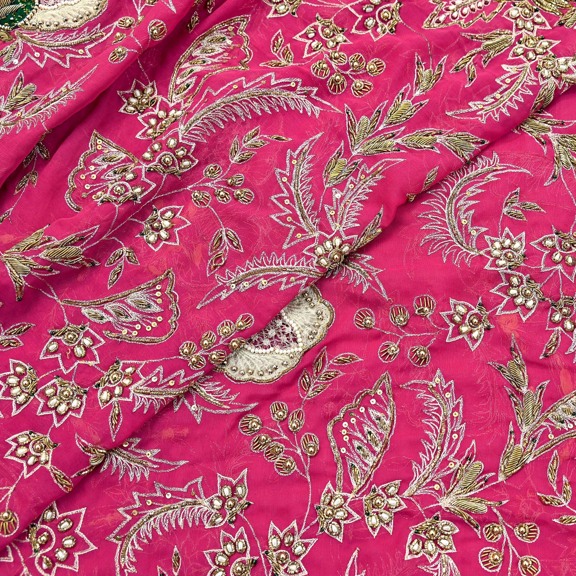 Stunning Very Heavy Dupatta Hand Embroidered American Georgette Dupatta/Stole In Pink Colored Fabric. This one of a kind item is difficult to express in words. Border feature is Paisley design embroidered Golden Zardozi/Dabka, Golden, Red & Green Beaded, white pearl like beaded, work embellished work is the highlight of the dupatta. Also you can see similar work with floral pattern in center part adds to its beauty. Green & Golden tissue patches & Green Velvet Border Woven work is giving a fabulous look to the dupatta. Awesome one !!!