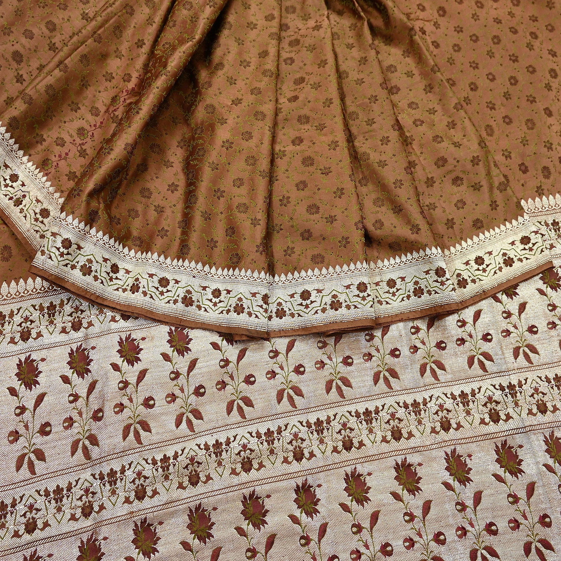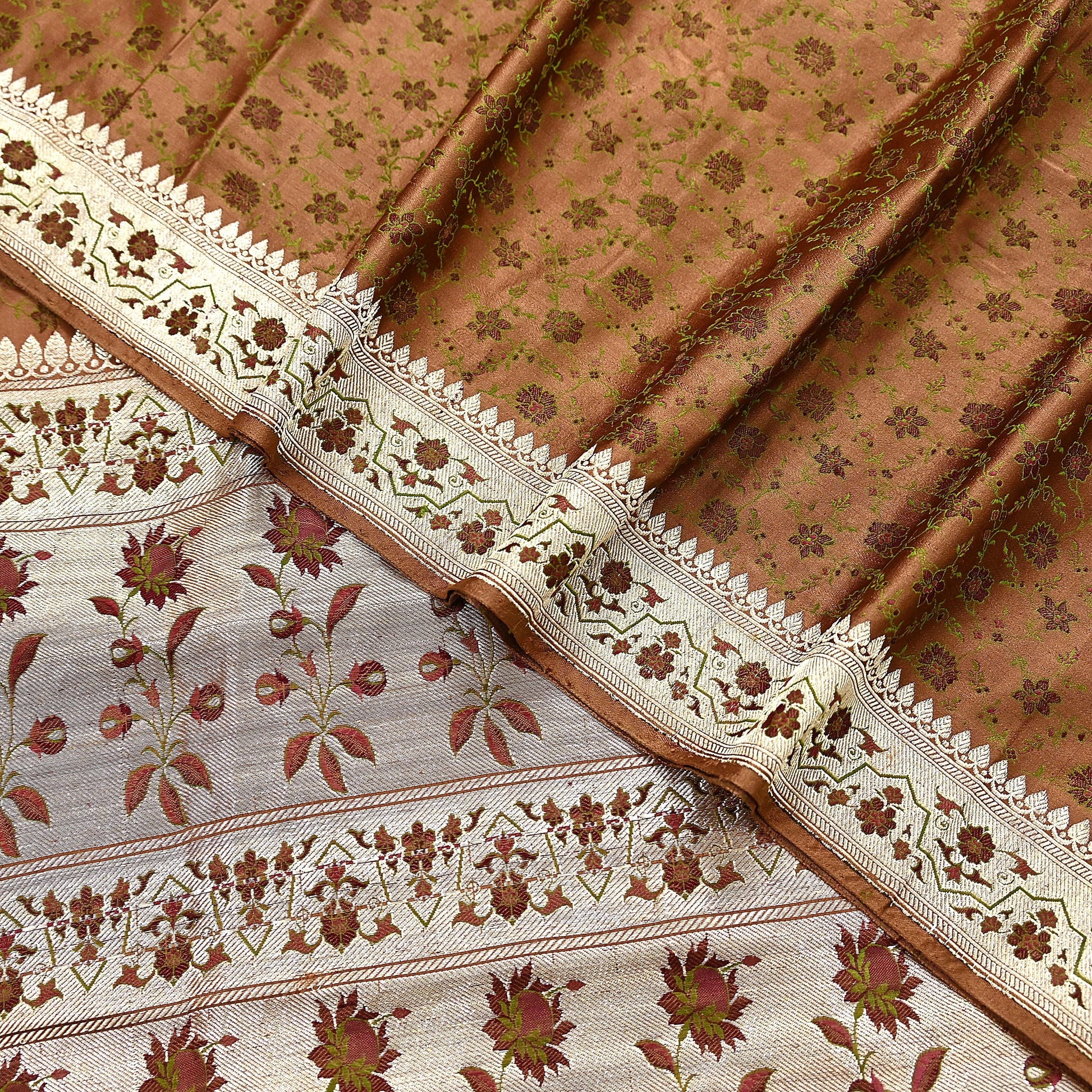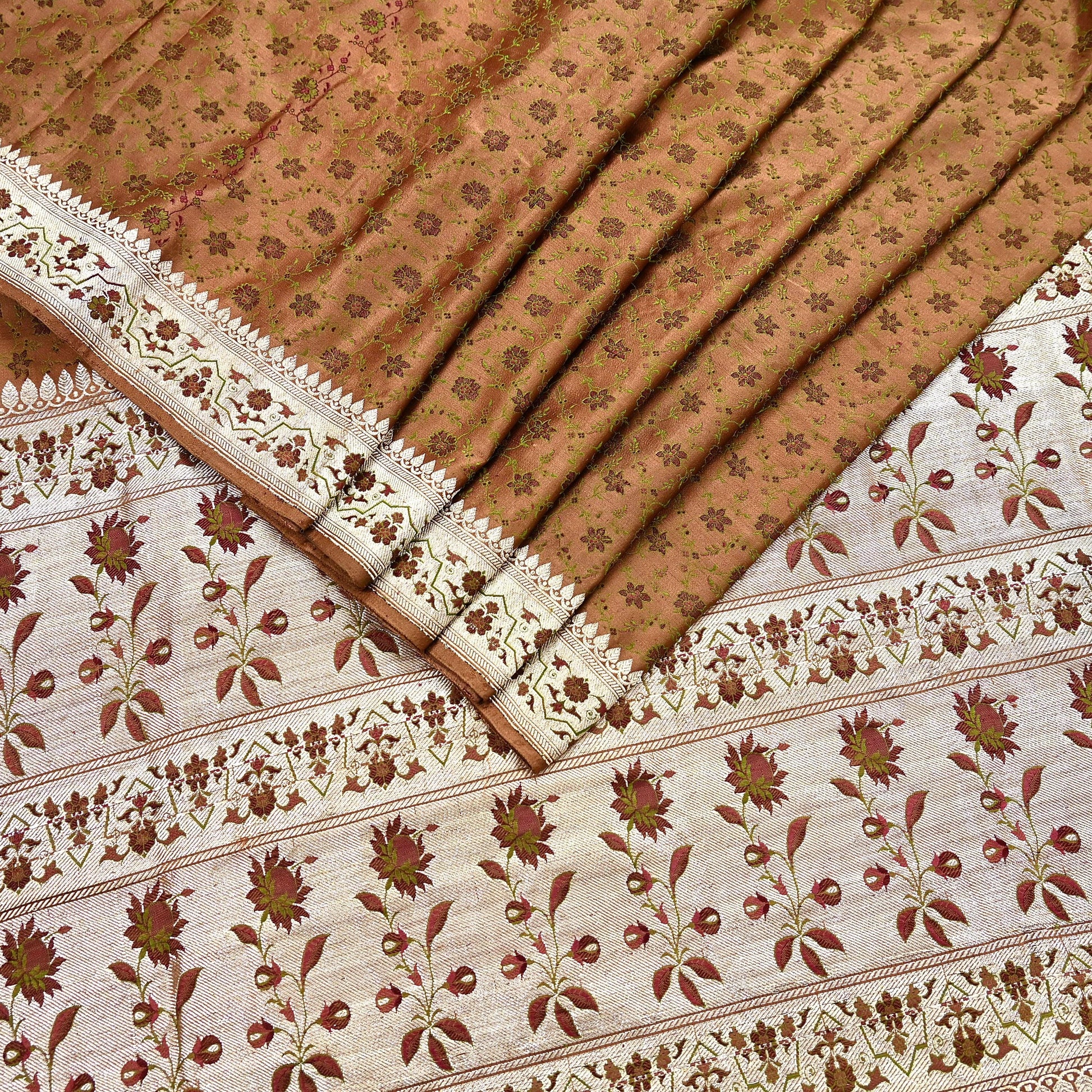 *The pallu & border sari features Floral design embellished with pure metallic Golden zari, Brown & Green Woven thread work.