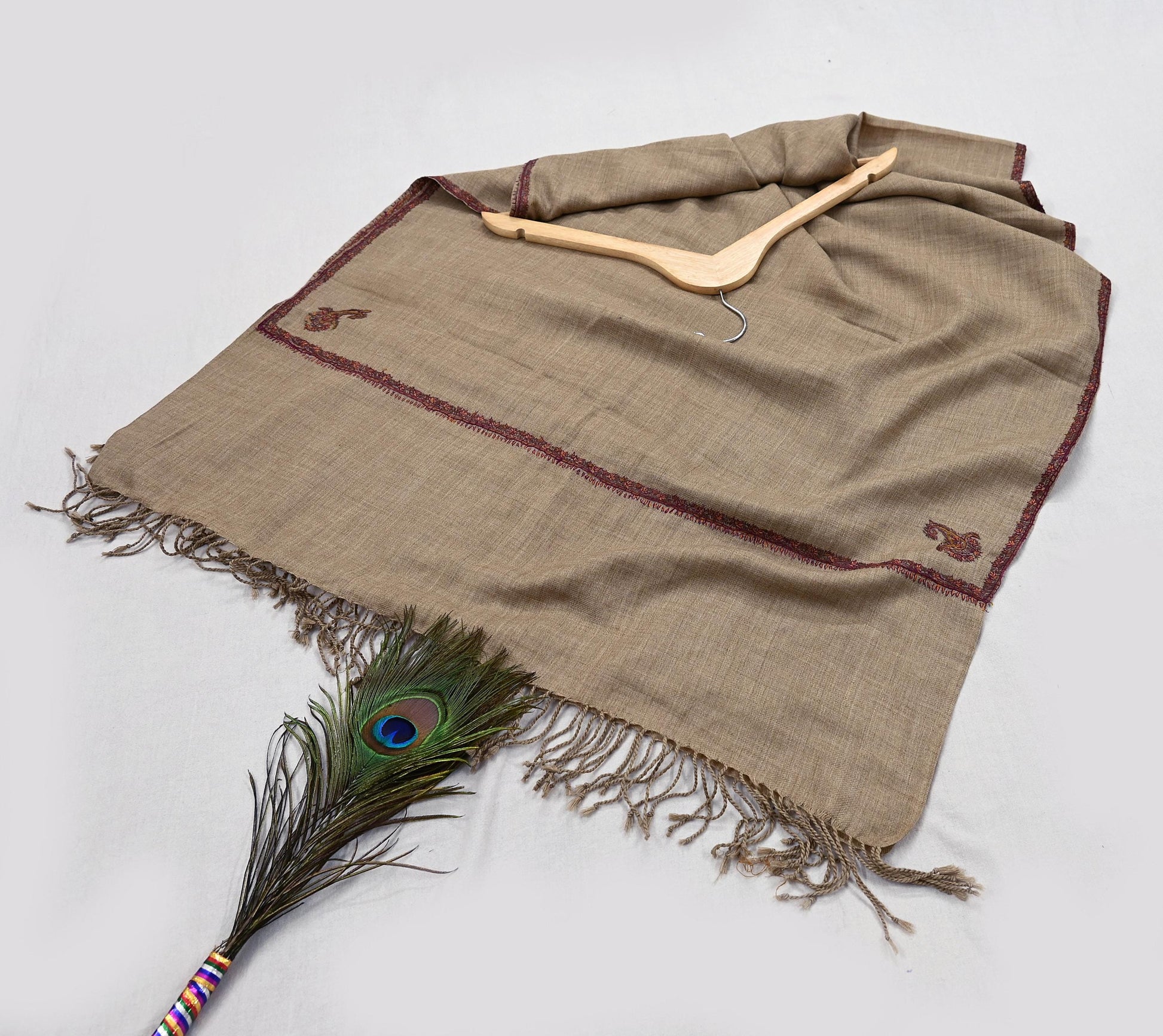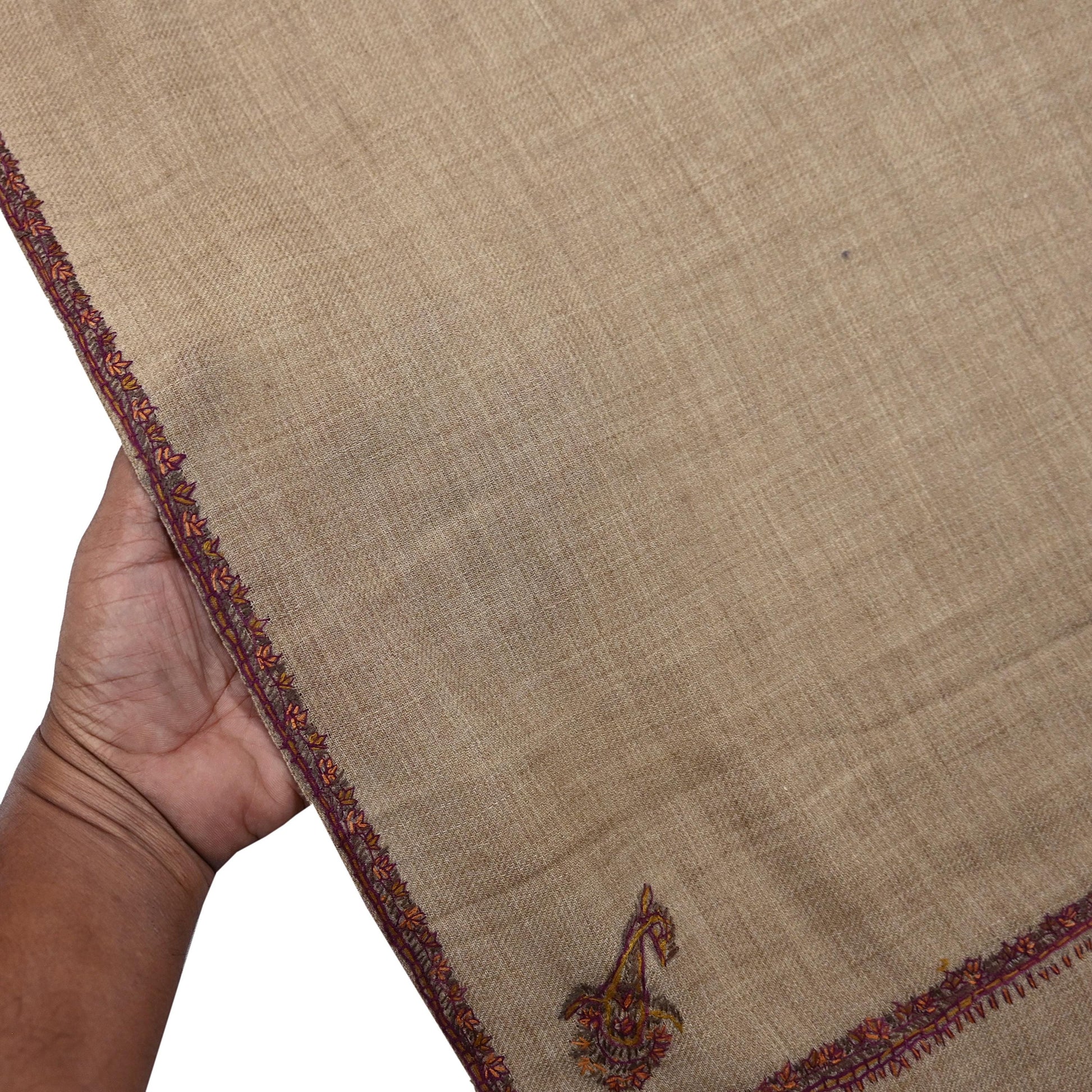 We proudly present this vintage brown-colored stole/shawl crafted from 100% pure wool and adorned with exquisite hand-embroidered Suzani floral motifs. Both the center and borders of the shawl feature intricate Suzani embroidery, gracefully combined with woven detailing, showcasing a rich tradition of craftsmanship.