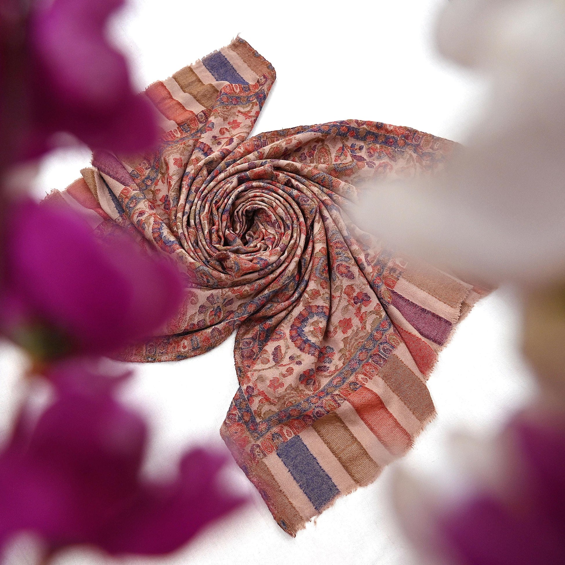 We are pleased to offer this vintage Brown -colored stole/shawl, made from 100% pure wool and adorned with stunning handwoven multicolor Paisley patterns. The woven design gracefully decorates both the center and borders, adding artistic elegance to this timeless piece.