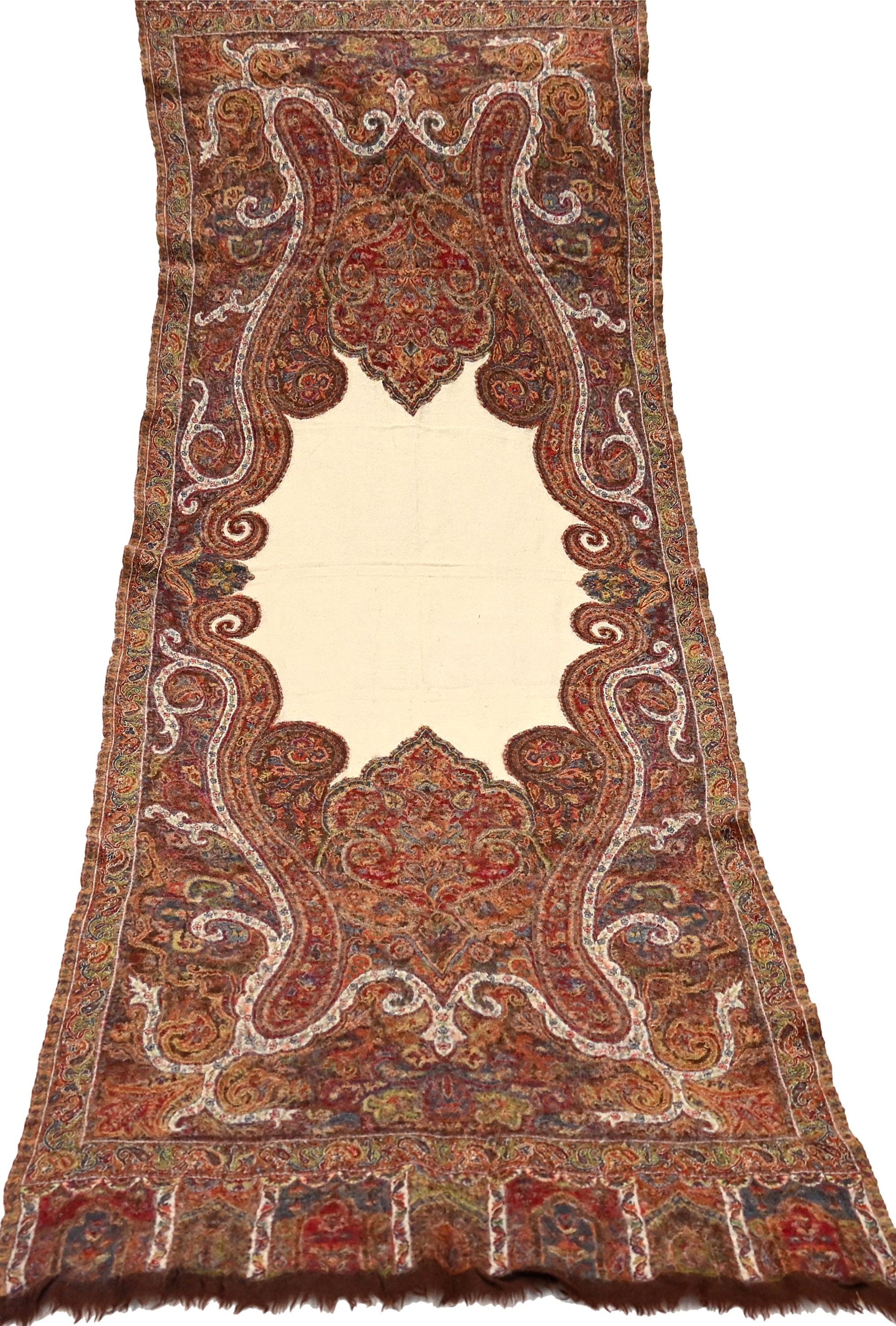 We are pleased to offer this vintage Ivory & Purple -colored stole/shawl, made from 100% pure wool and adorned with stunning handwoven multicolor Paisley patterns. The woven design gracefully decorates both the center and borders, adding artistic elegance to this timeless piece.