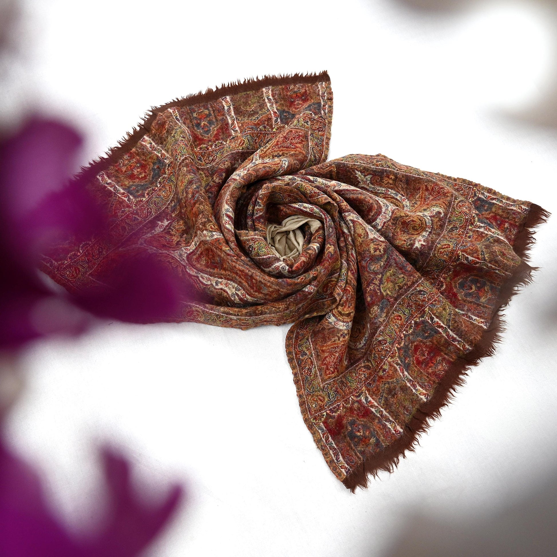 Indian Vintage Brown Pure Woolen Shawl Handmade Woven Jamawar Work Long Throw Stole Warm Paisley Design Soft