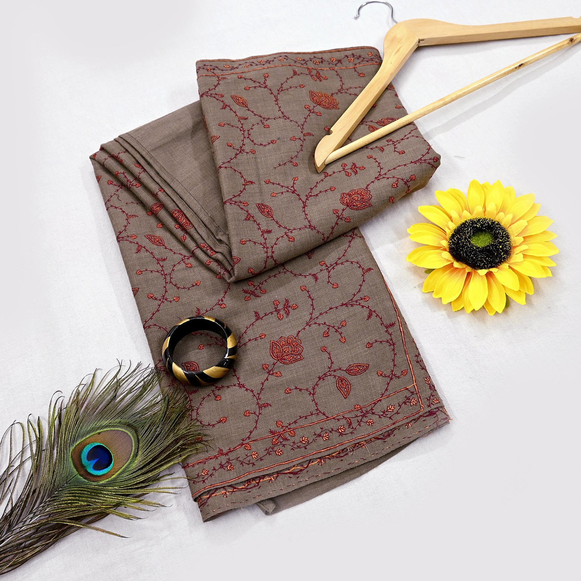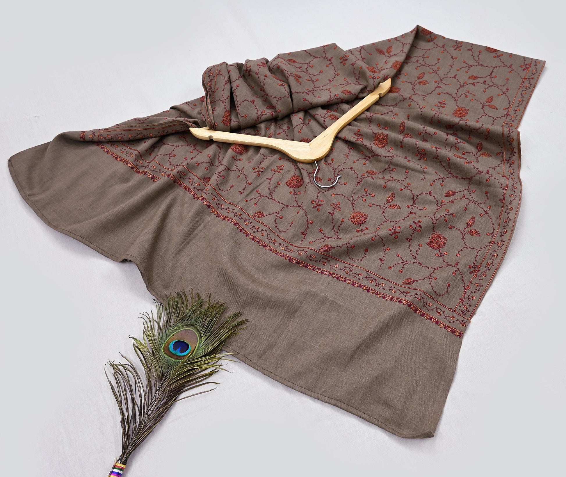 We Are Offering You A Vintage Brown Color 100% Pure Woolen Stole/Shawl Which Adorns Hand Embroidered Suzani & Woven Work. Center part & Border of this shawl has traditional handmade Suzani embroidery with floral & paisley pattern. This cozy, warm and fuzzy stool is soft against skin due to the mellow woolen fabric.