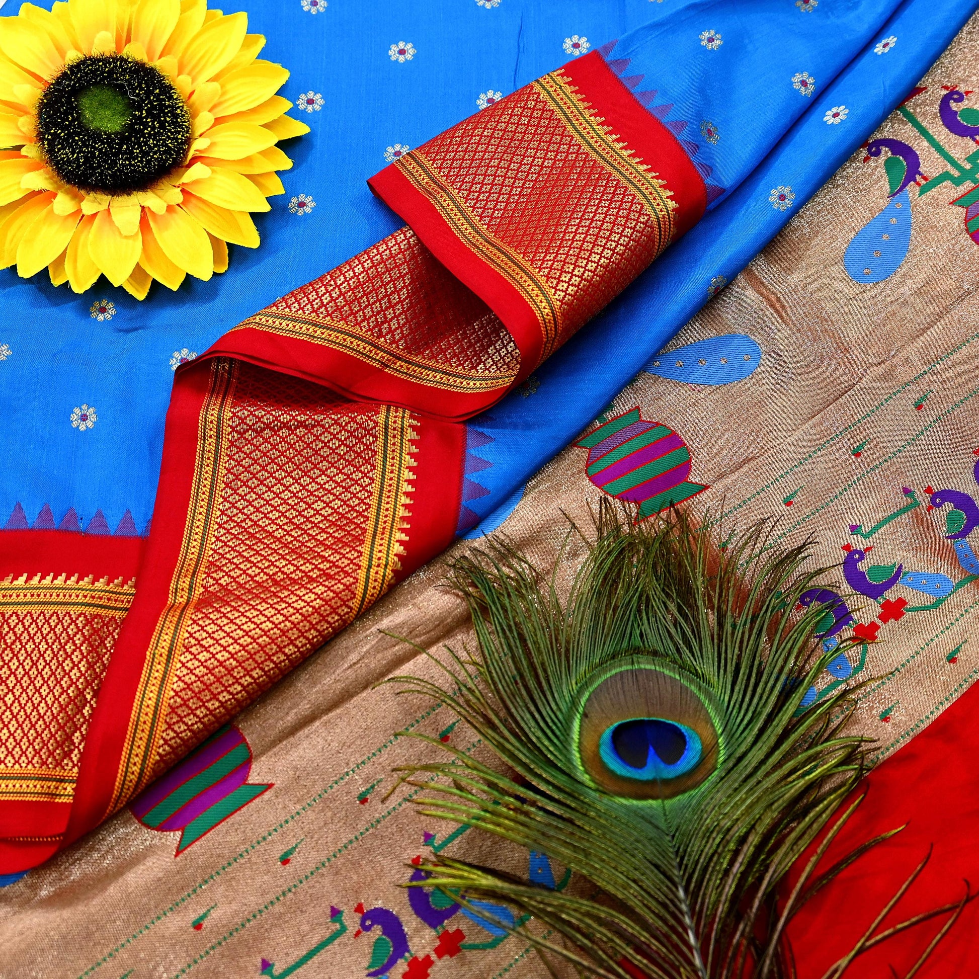 Attractive Paithani Work With Peacock Design On Blue & Red Color Base Fabric Is Really Enhancing The Beauty Of The Dupatta.