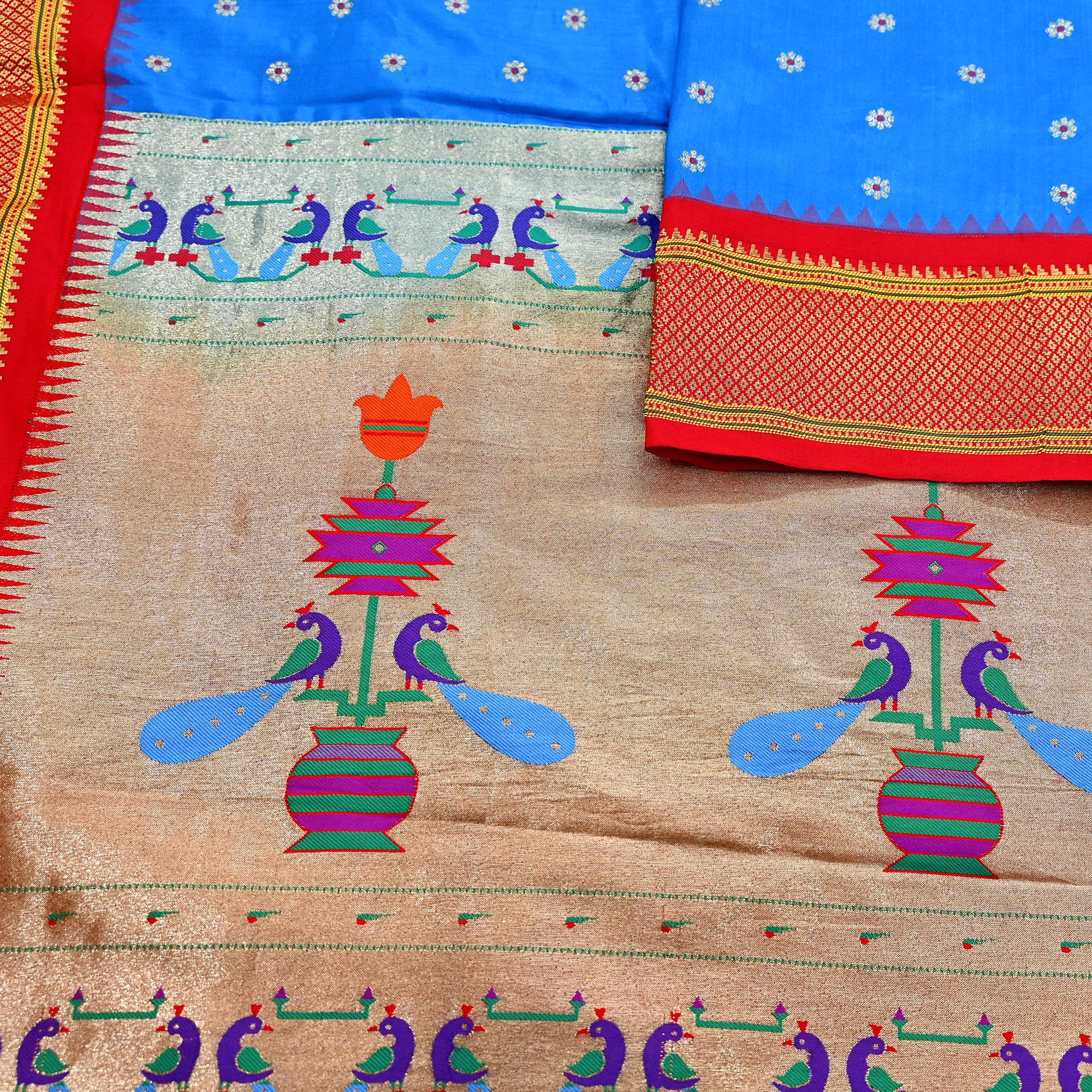 *Vintage Blue & Red Colored Hand Woven Paithani Long Scarf/Dupatta Artificial Silk Fabric.
