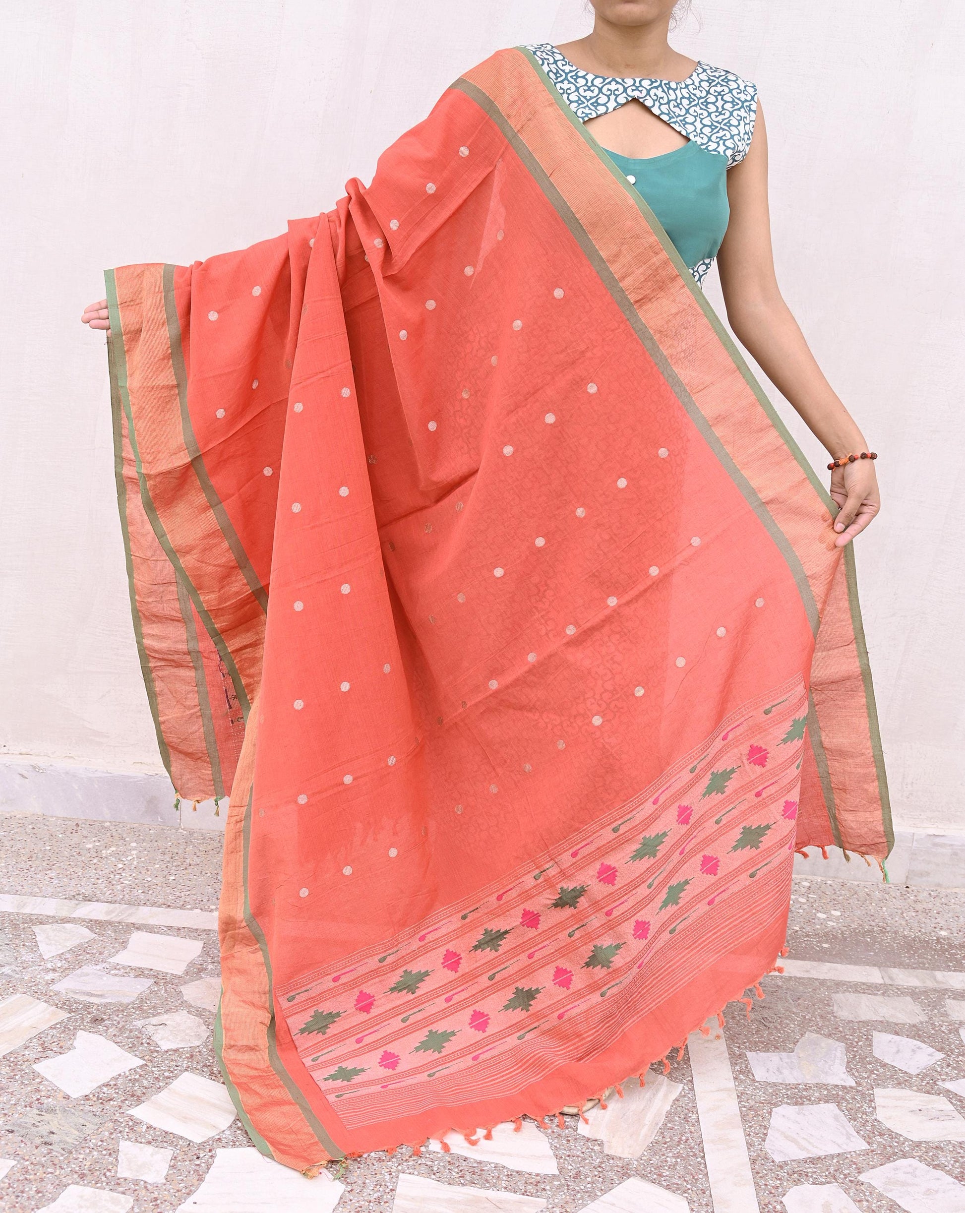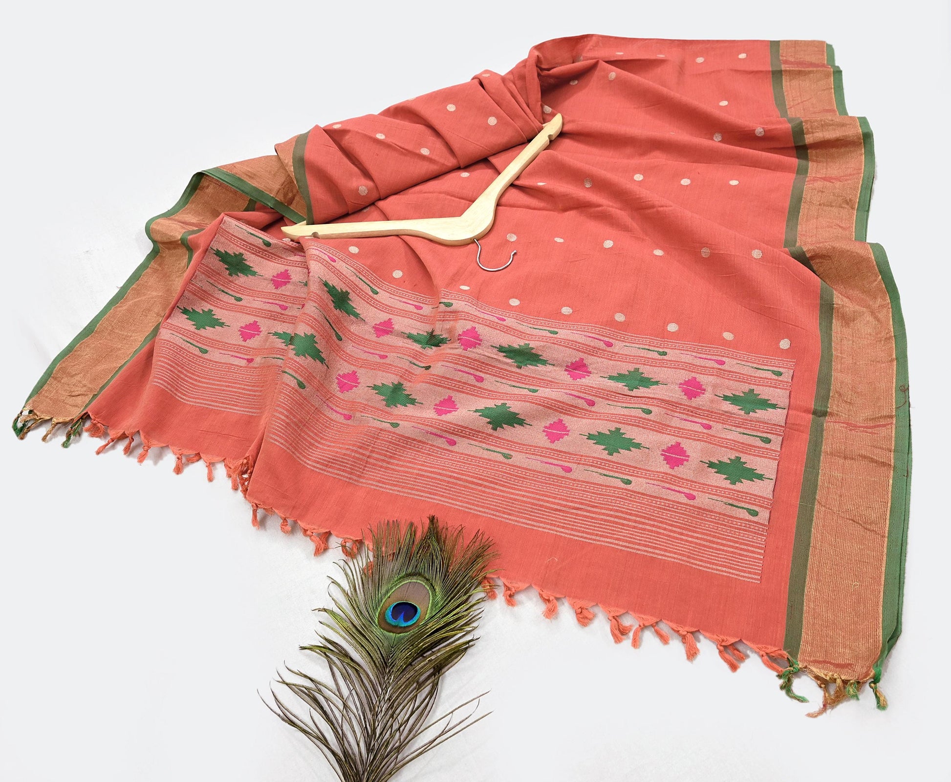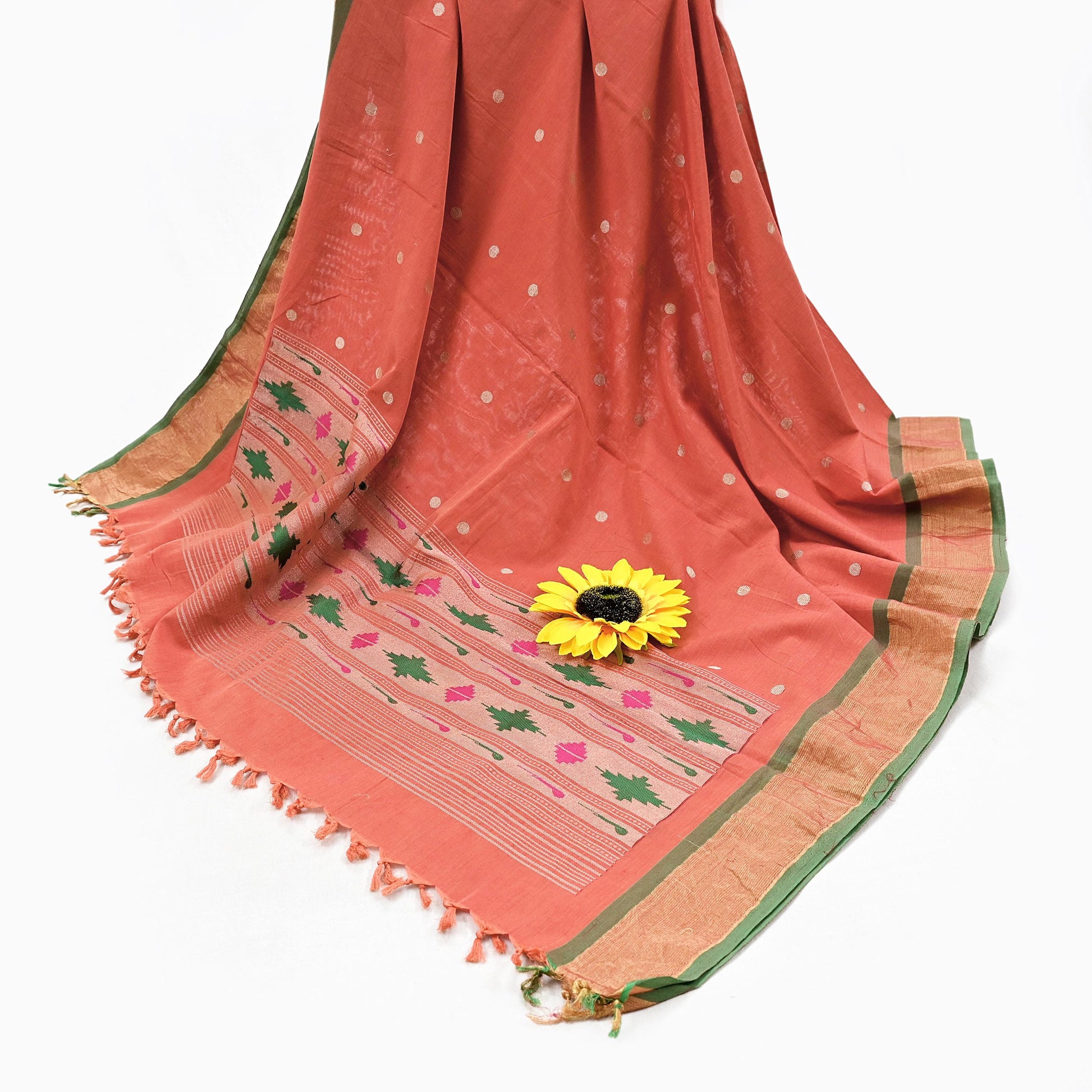 Indian Vintage Dupatta Orange Pure Cotton Long Stole Handloom Paithani Dupatta Scarves Veil Tissue Silk Muniya Border Fringes