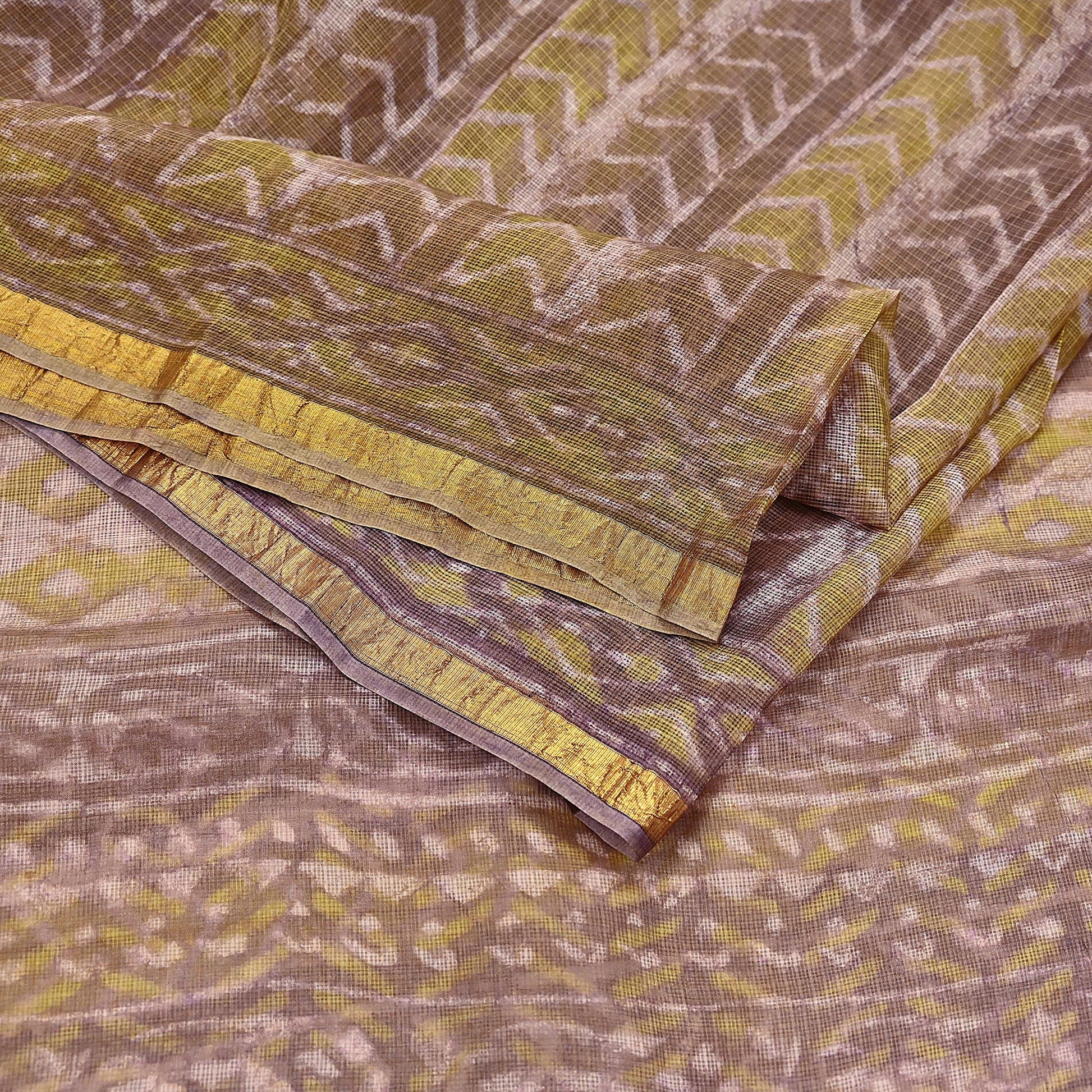 This elegant vintage saree is crafted from 100% pure silk, known for its feather-light texture and graceful drape. Designed in a charming Brown color palette, it features a hand block-printed Geometric pattern throughout, giving it a timeless appeal.