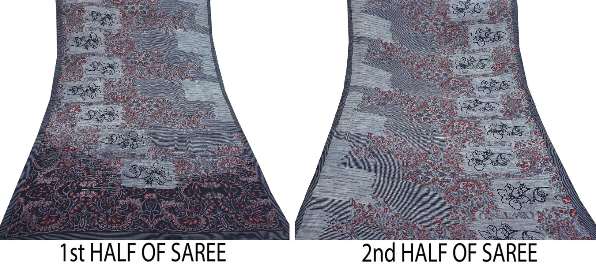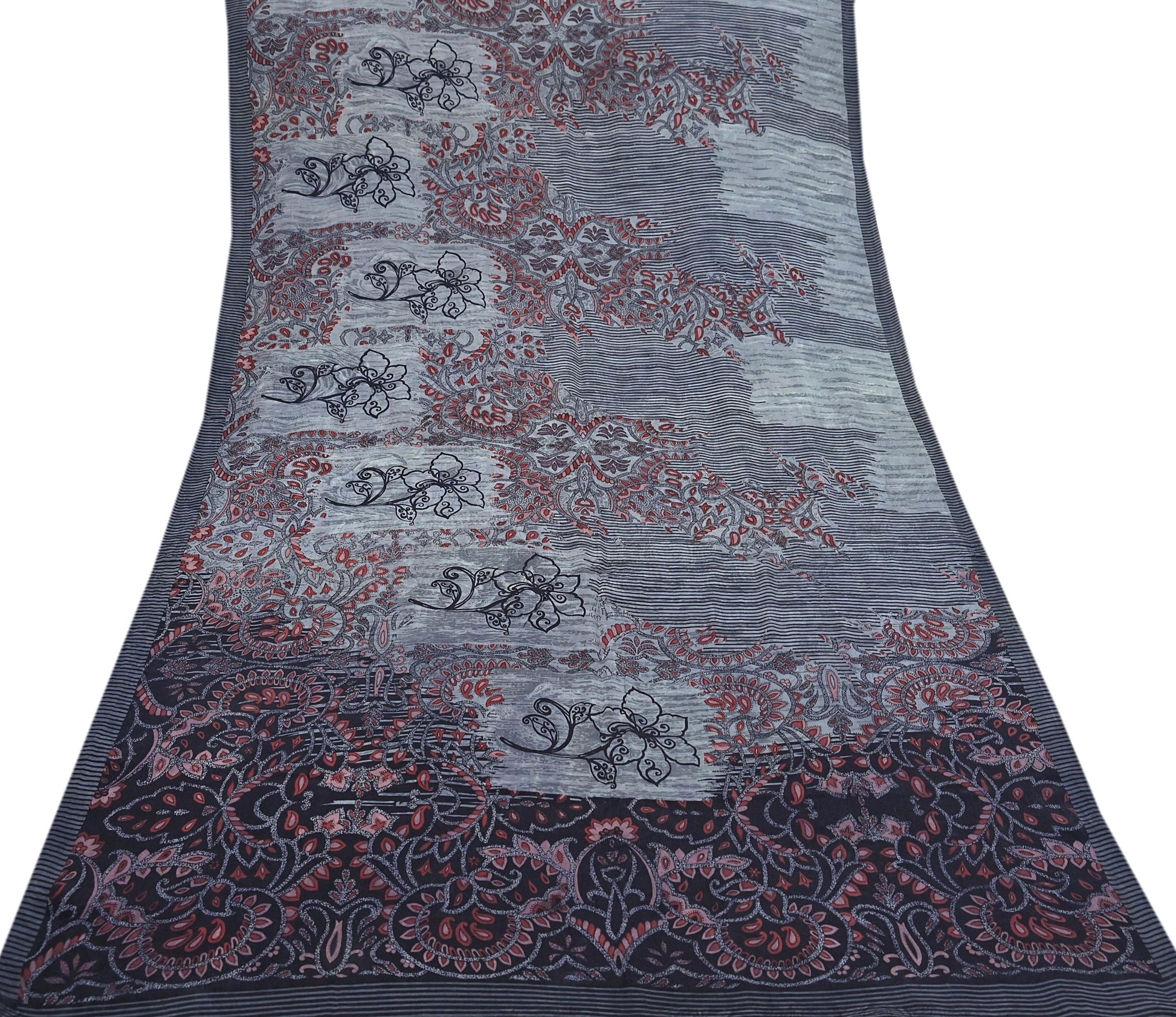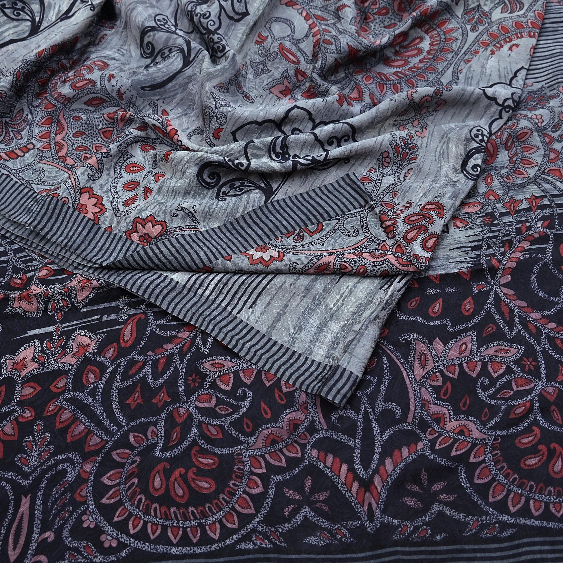 Indian Vintage Gray & Black Saree Pure Crepe Silk Printed Sari Craft Fabric 6yd Sewing Soft Wrap Dress making Crafting Quilting