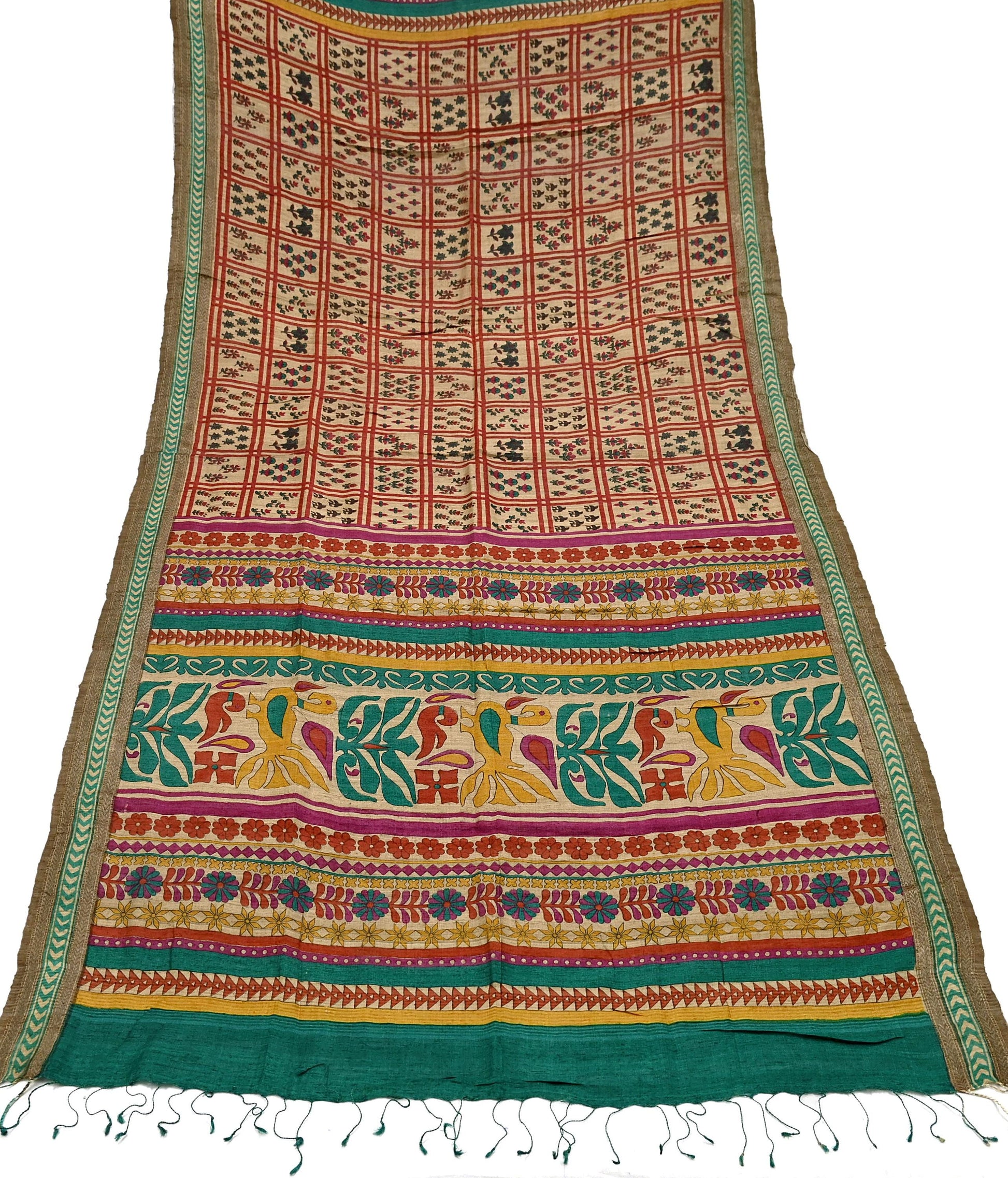 Indian Vintage Green & Beige Dupatta Long Stole 100% Pure Khadi Silk Hand Woven/ Printed Scarves Veil Scarf Wrap Hippie Fringes